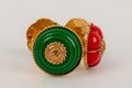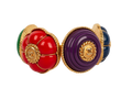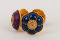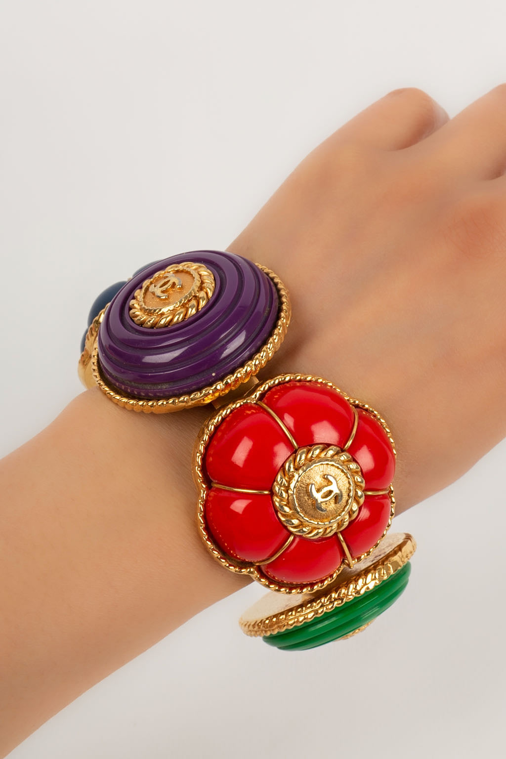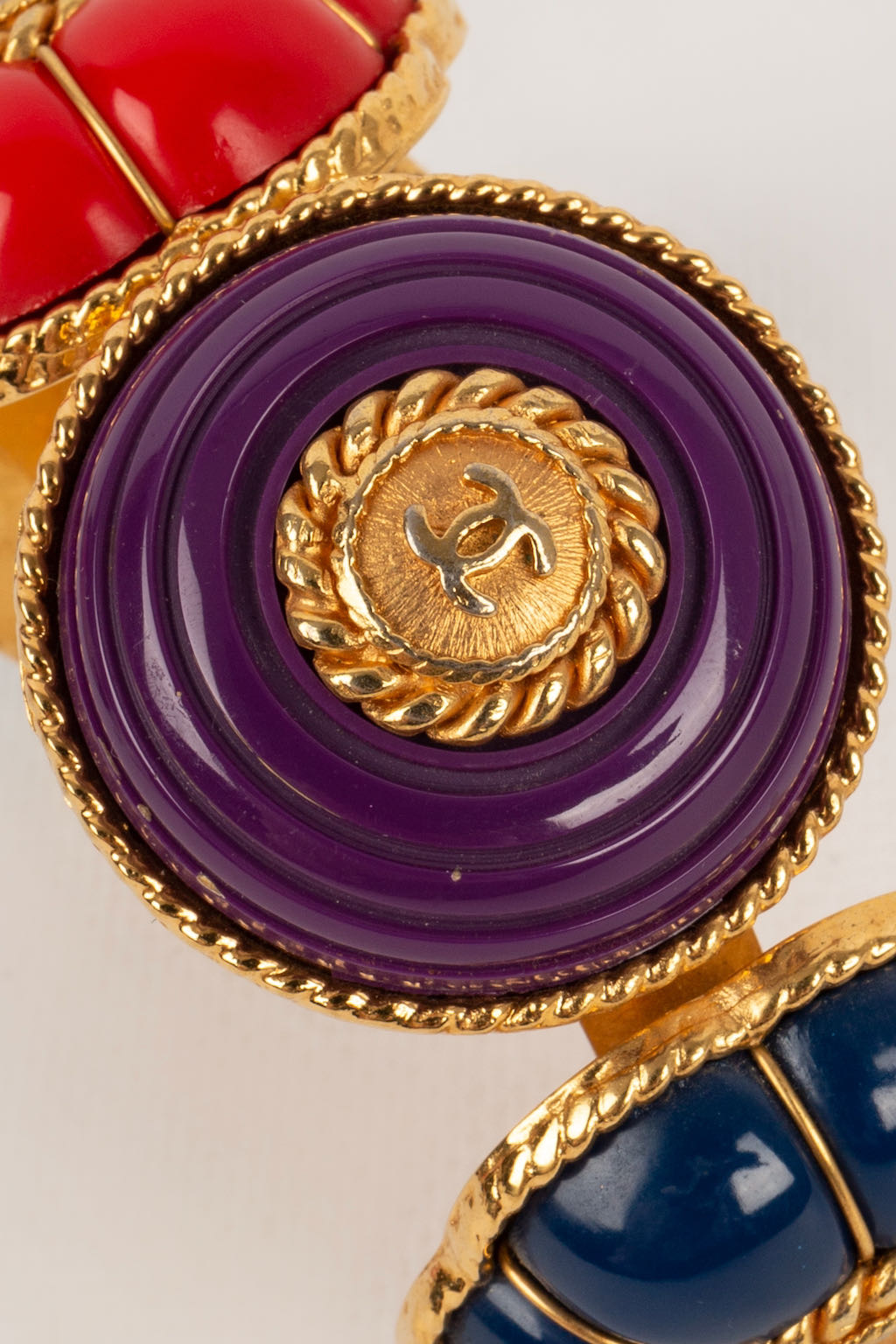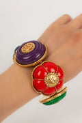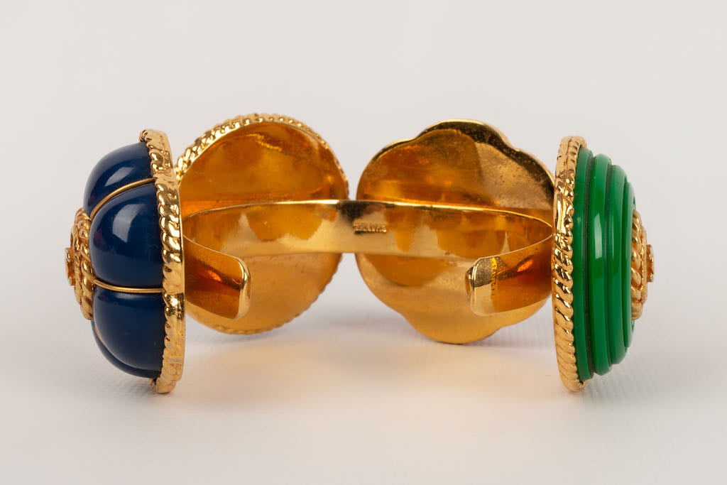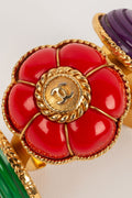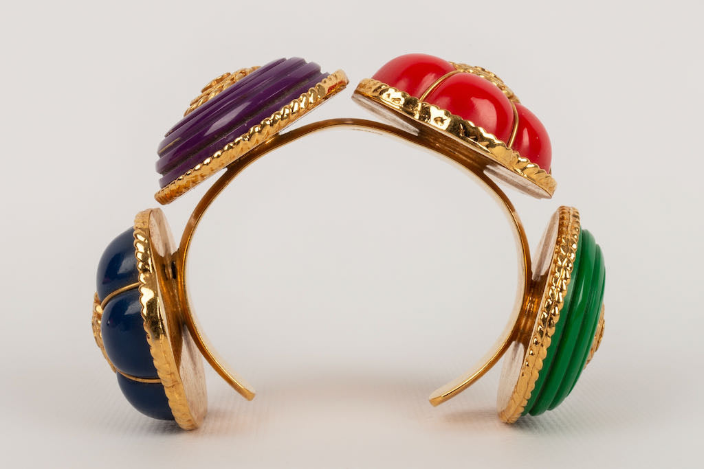 CHANEL -Bracelet en m�tal dor� et r�sine bleu, violette, rouge et verte. Collection Printemps-Et� 1989.
