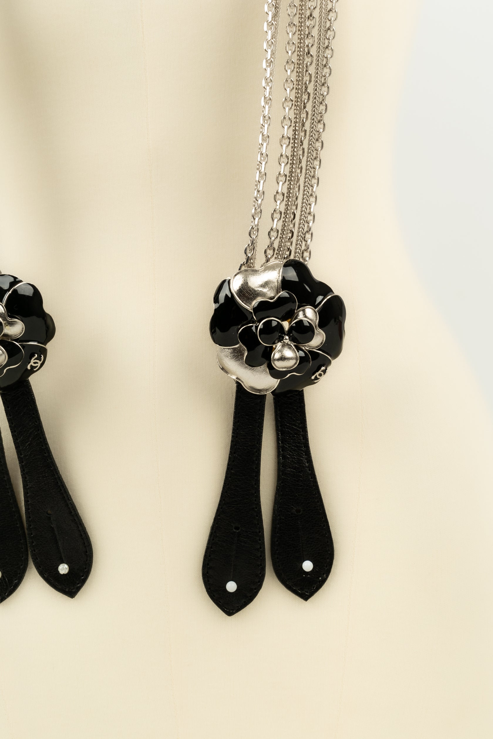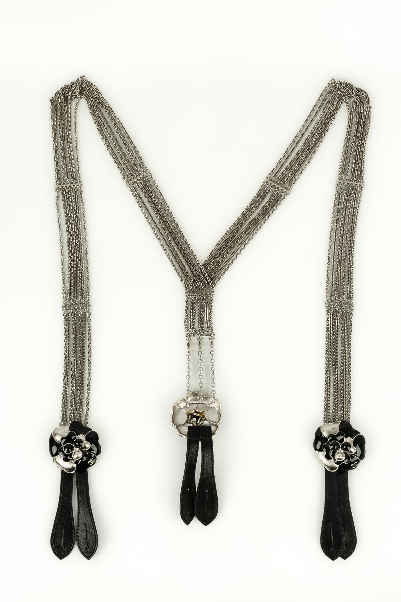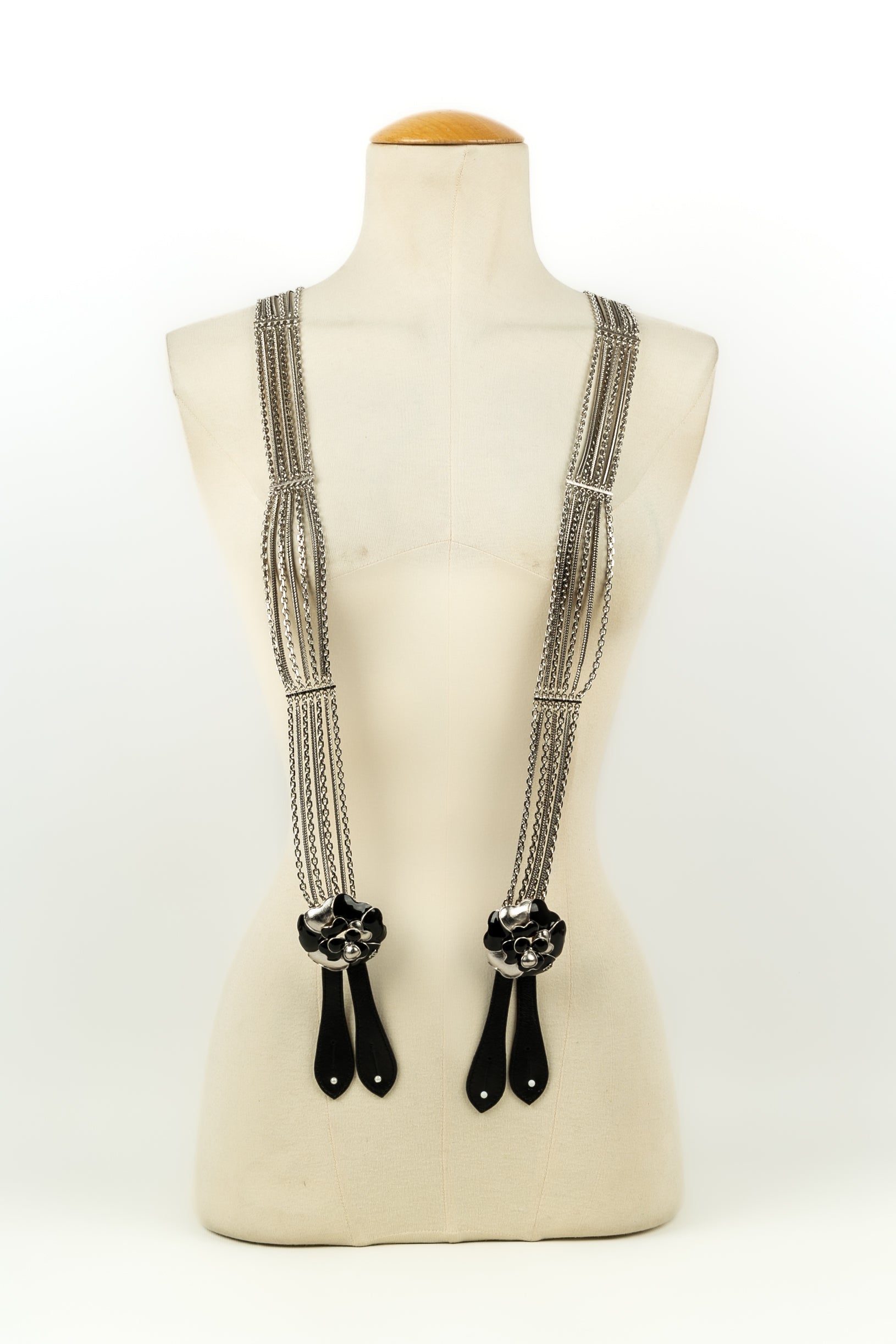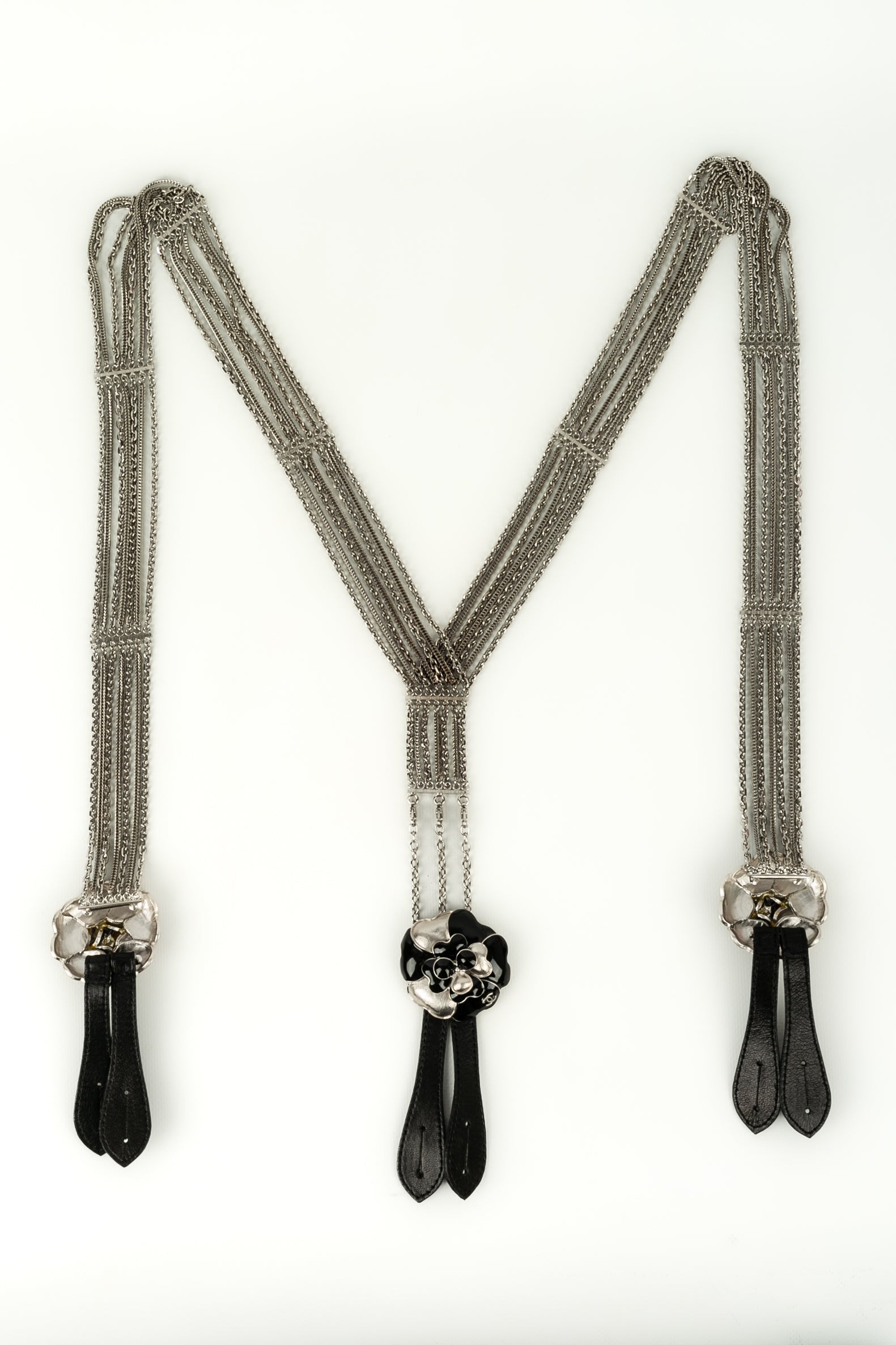 CHANEL - Bretelles en cha�nes argent�, cuir noir et cam�lia en m�tal argent� et �mail noir. Collection Printemps-Et� 2007.