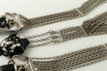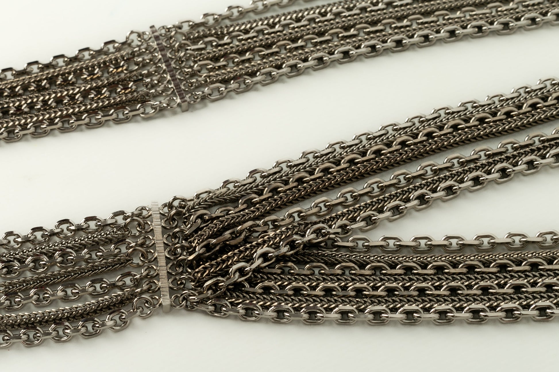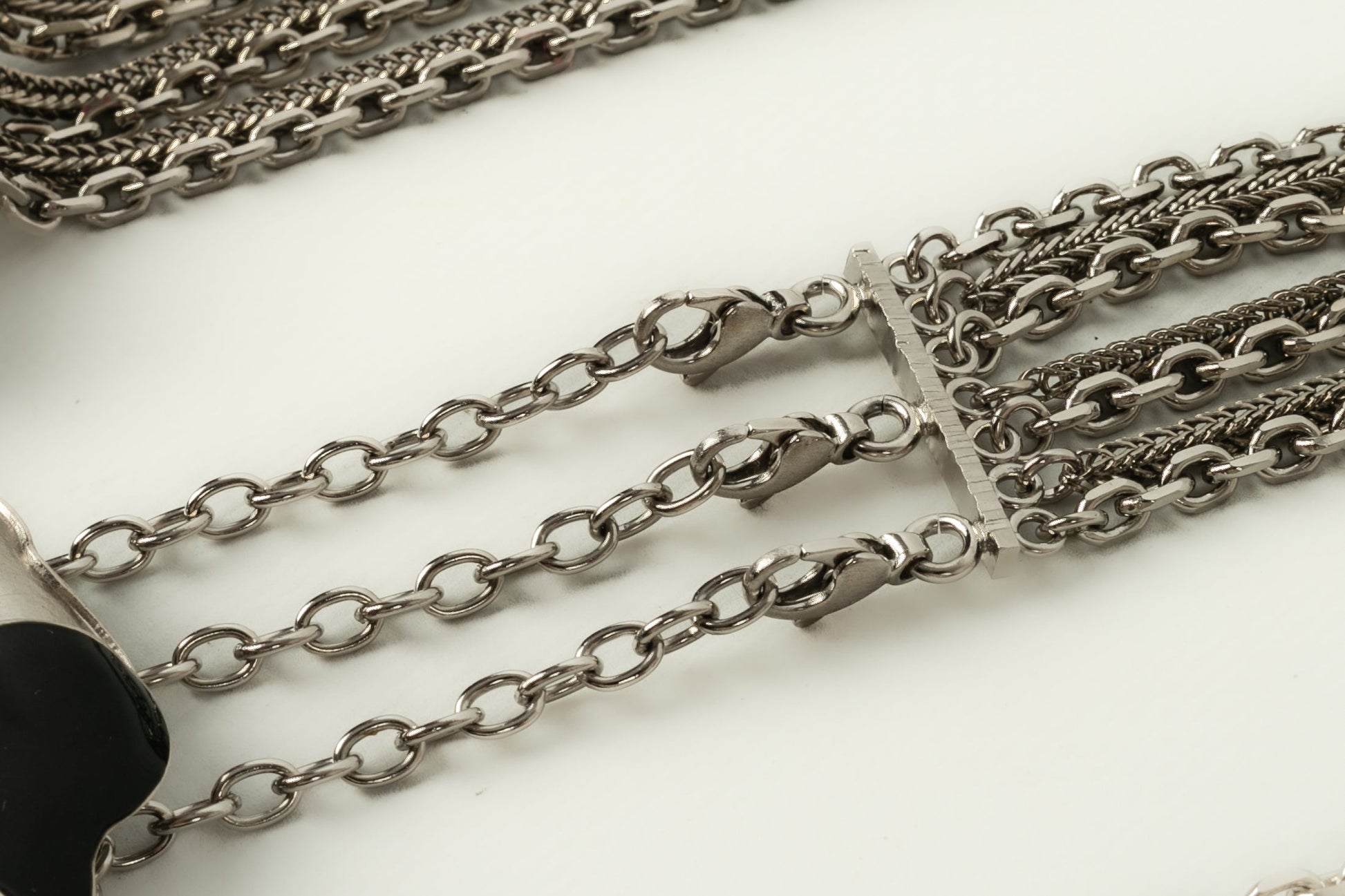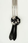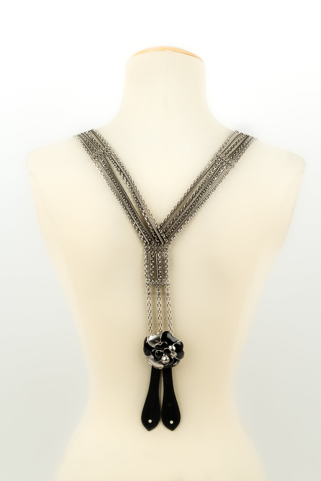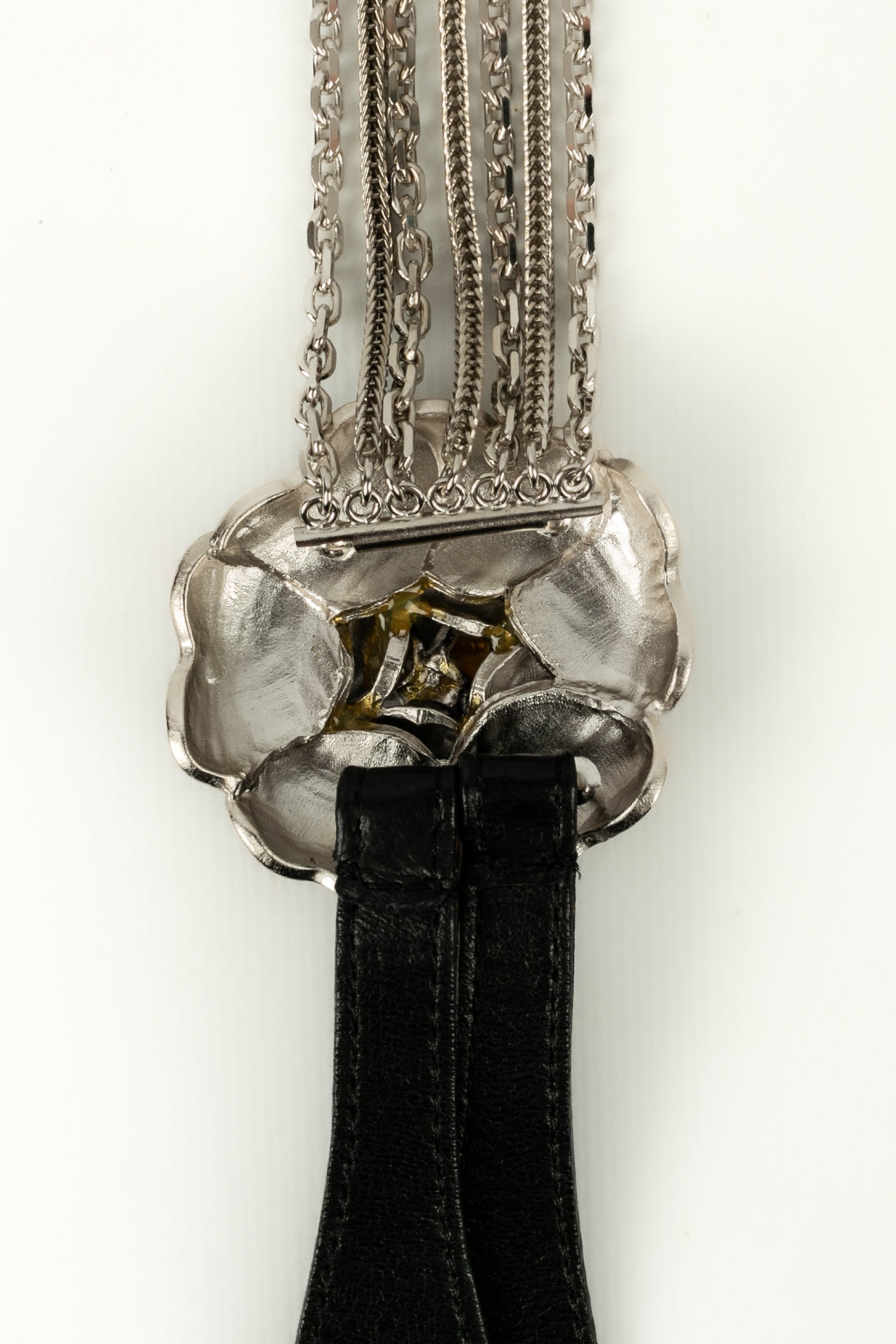 CHANEL - Bretelles en cha�nes argent�, cuir noir et cam�lia en m�tal argent� et �mail noir. Collection Printemps-Et� 2007.
