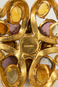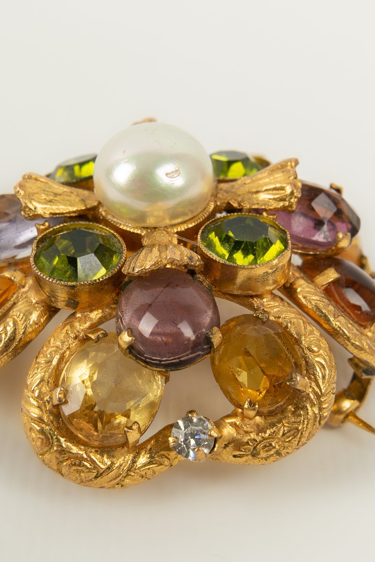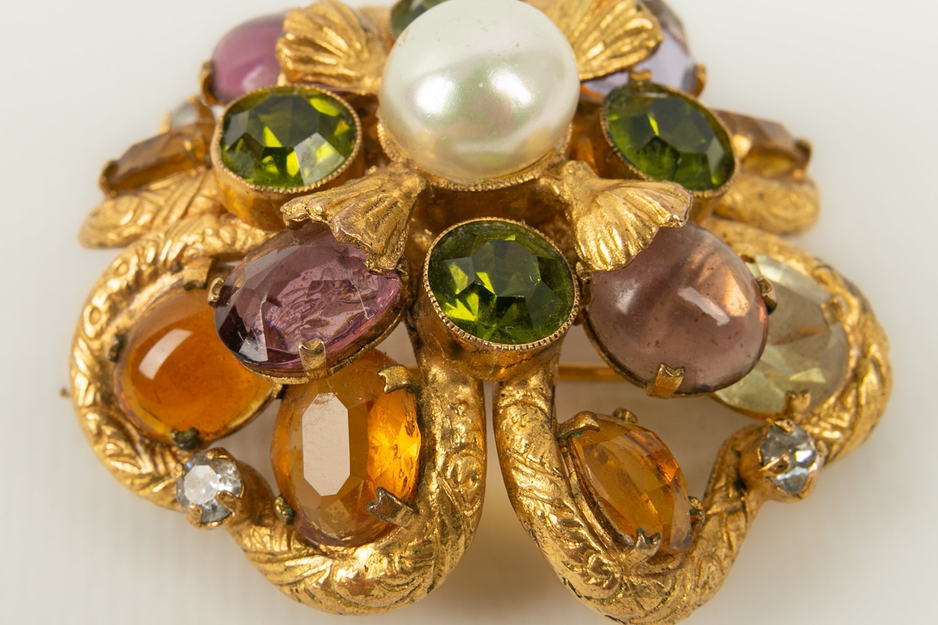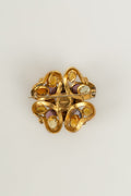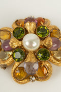 CHANEL - Broche ancienne en m�tal dor�, cabochon fantaisie nacr�, cabochons en p�te de verre, et strass.