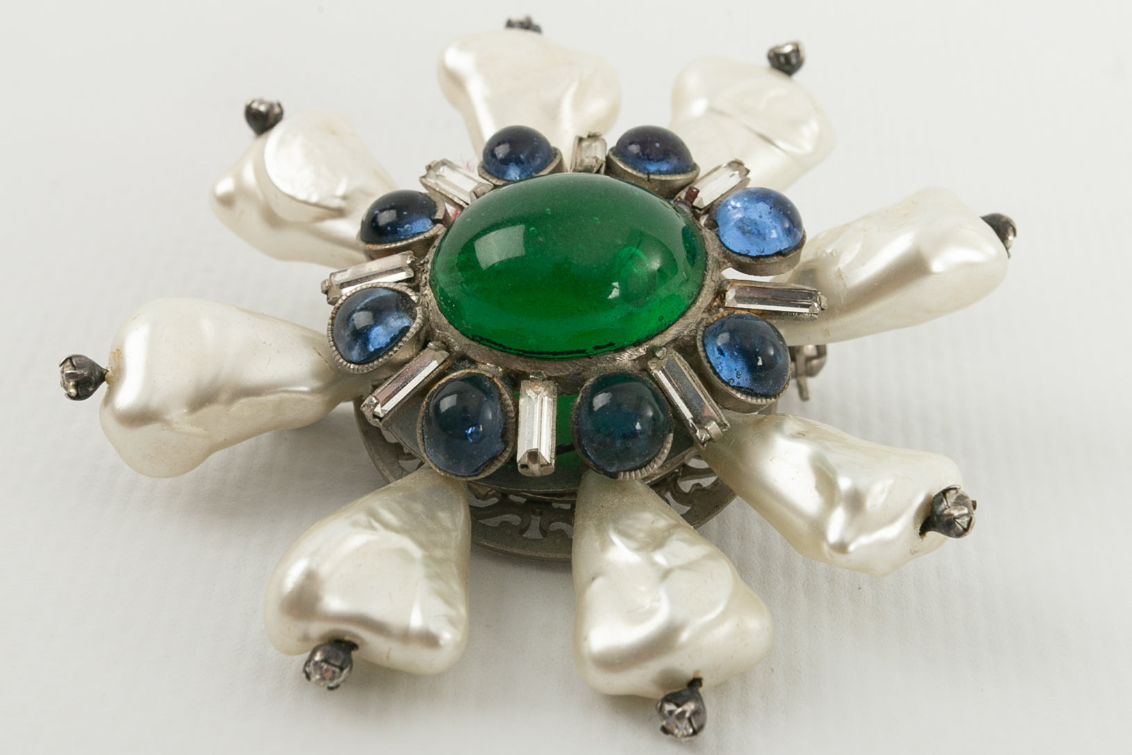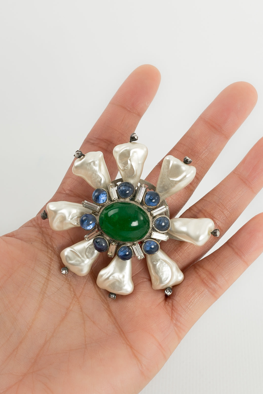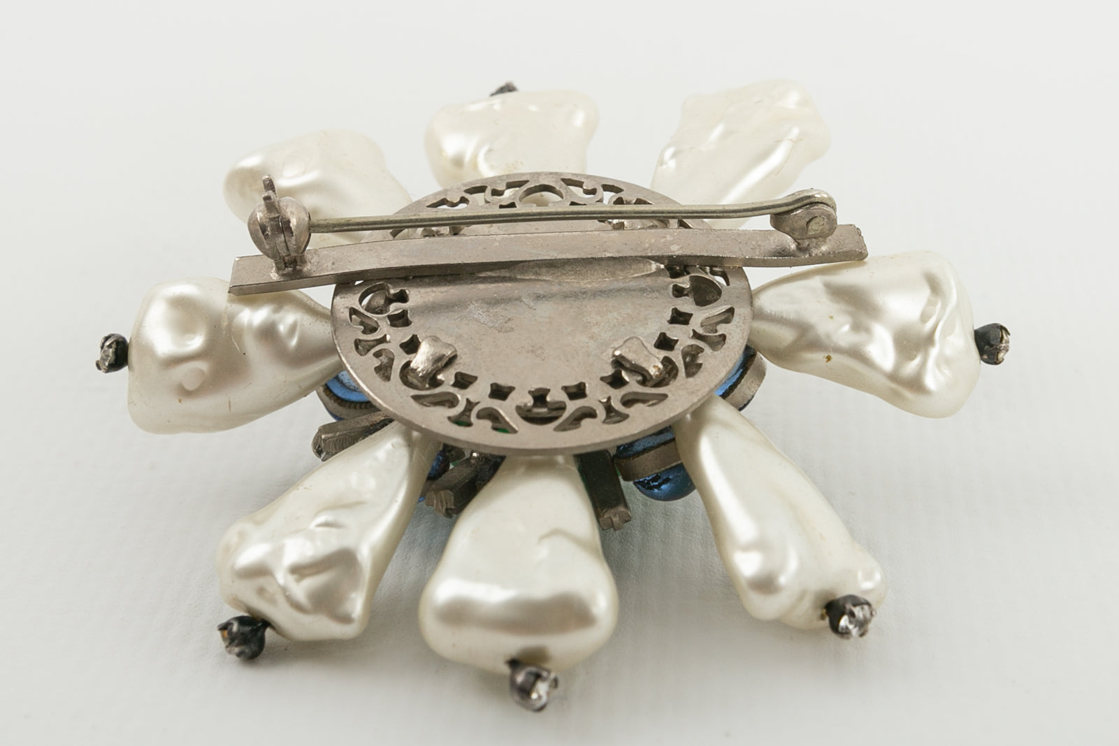 CHANEL (Non sign�) Broche en m�tal argent� et p�te de verre, d�cor�e de perles nacr�es.�Travail des ateliers Gripoix pour la Maison Chanel.