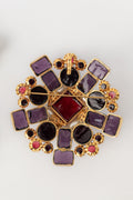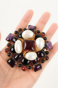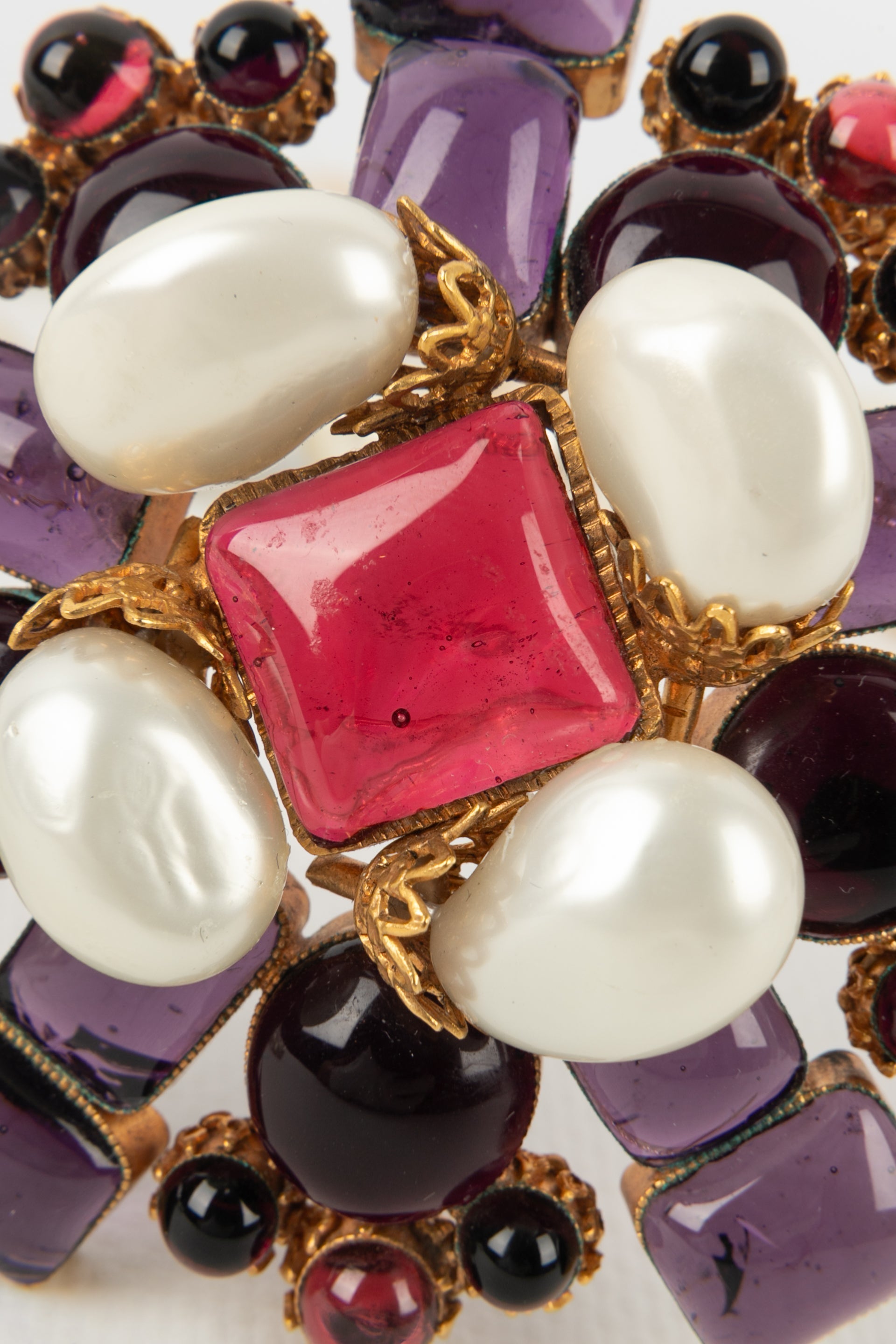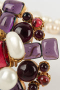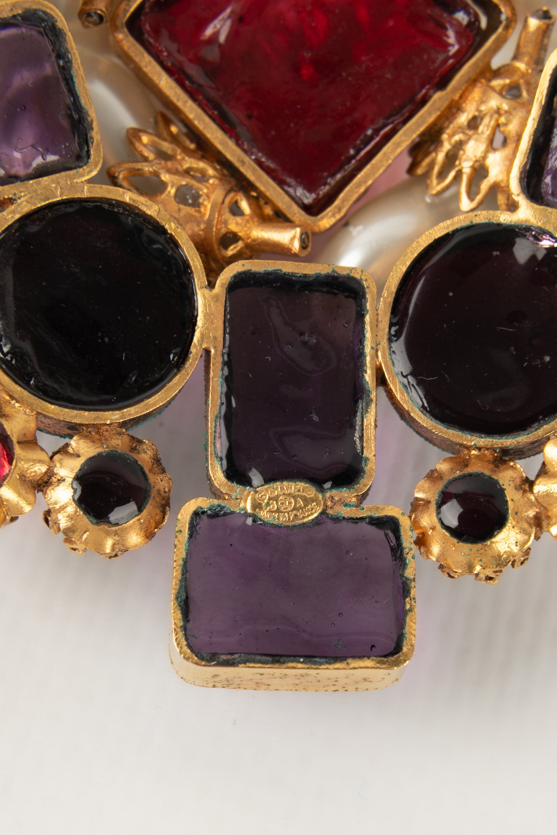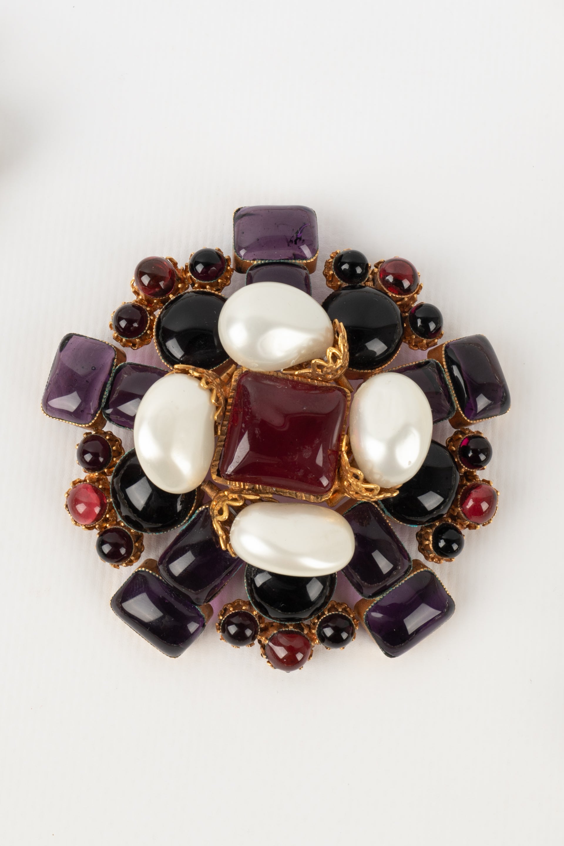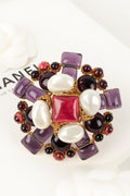 CHANEL - (Made in France) Broche pendentif en métal doré, pâte de verre et gouttes de nacre. Collection Automne-Hiver 1996.