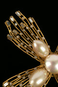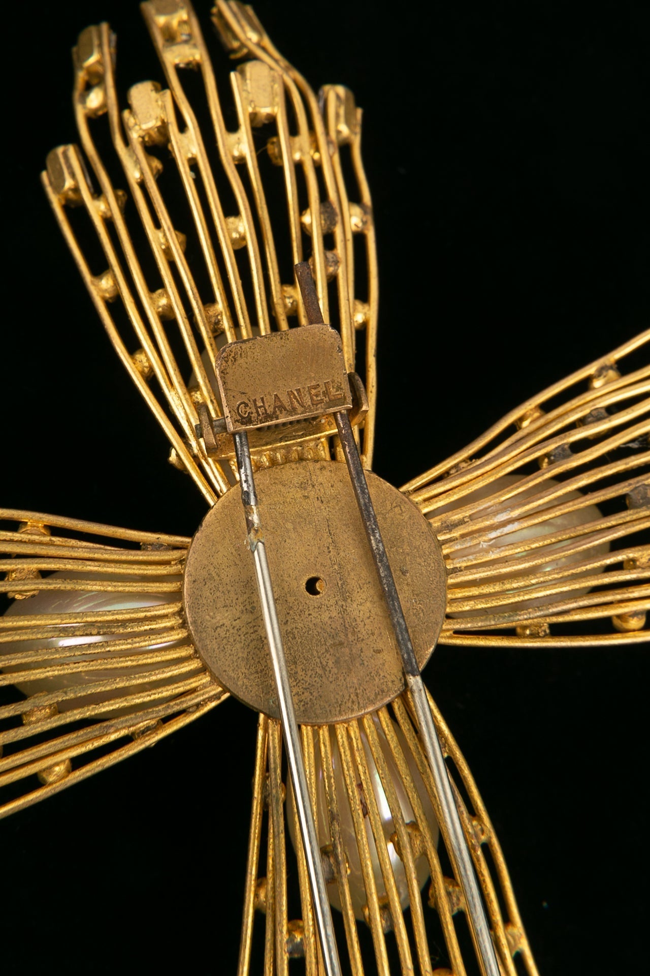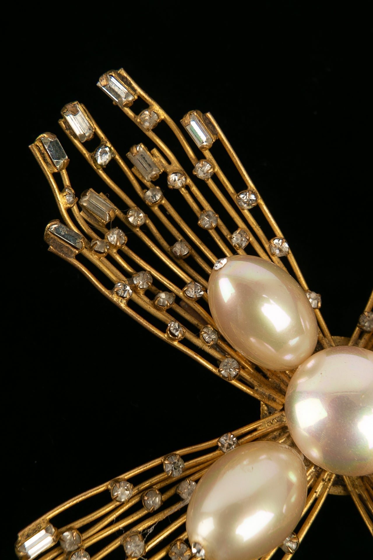 CHANEL -Broche en m�tal dor� ajour�, strass et perles nacr�es.
