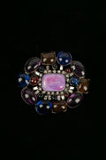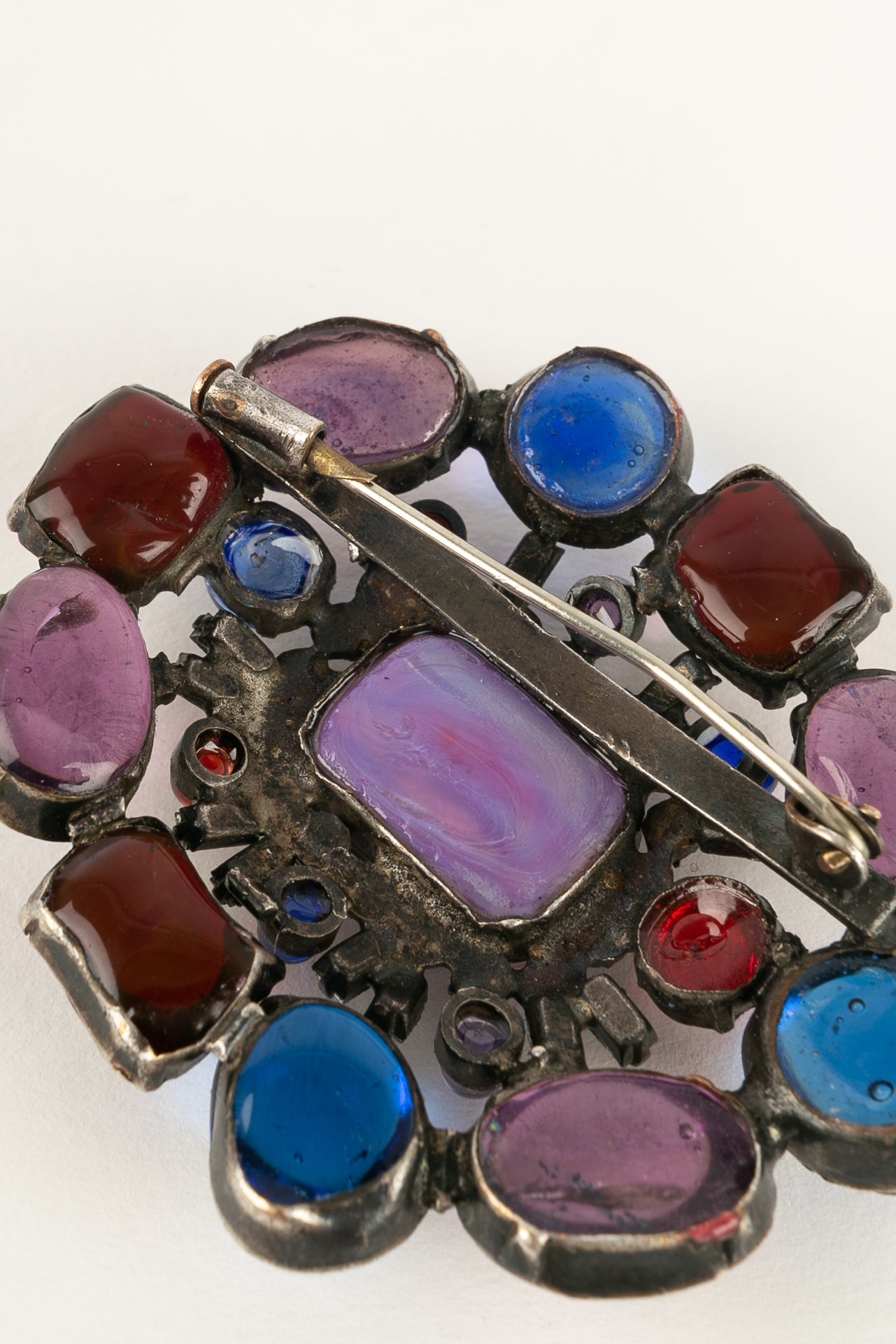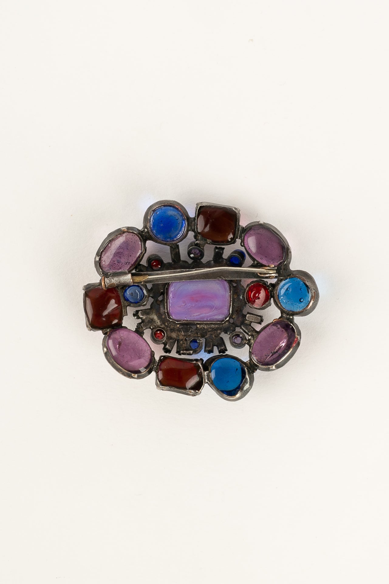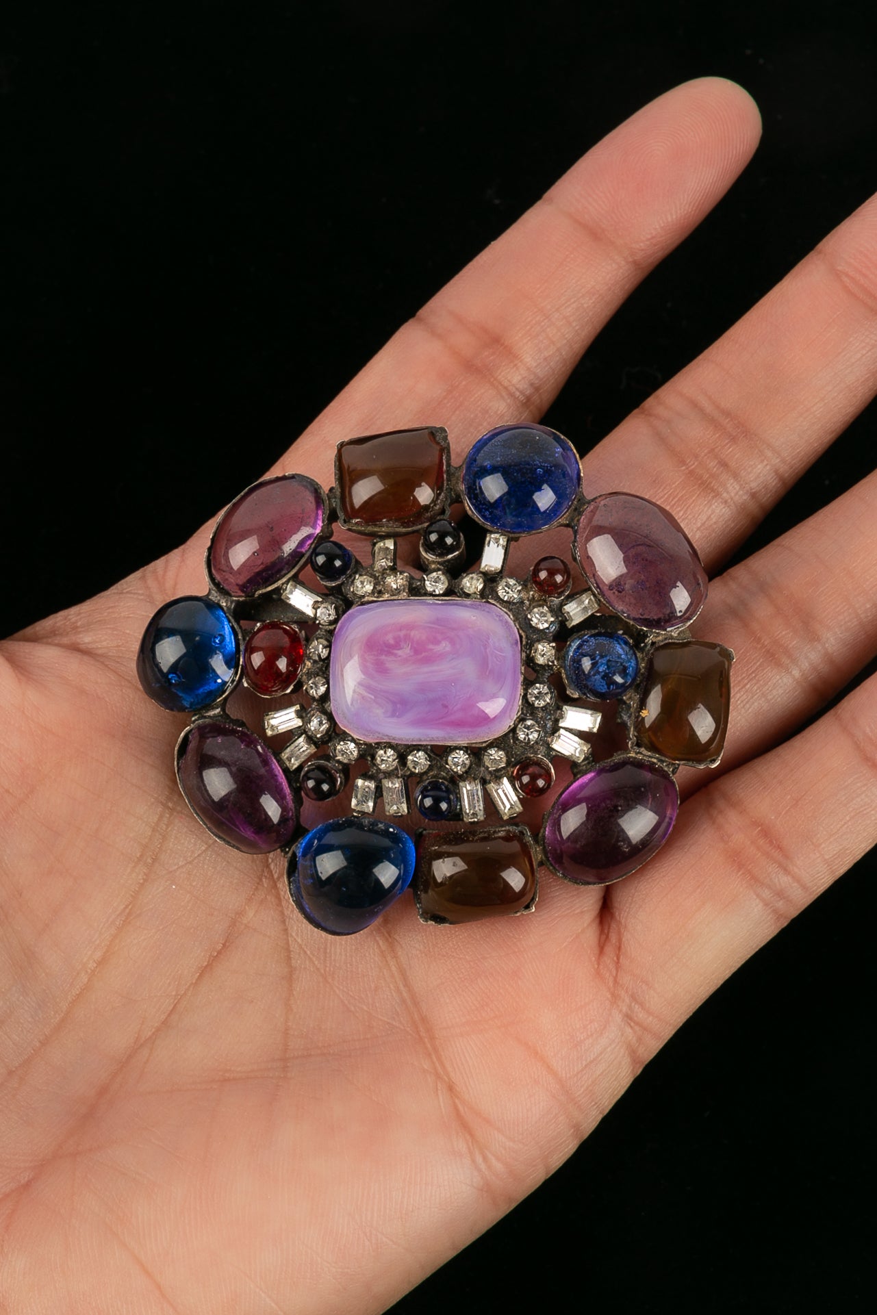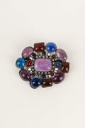 CHANEL -Broche en m�tal argent� fonc�, p�te de verre et strass. Bijou non sign�.