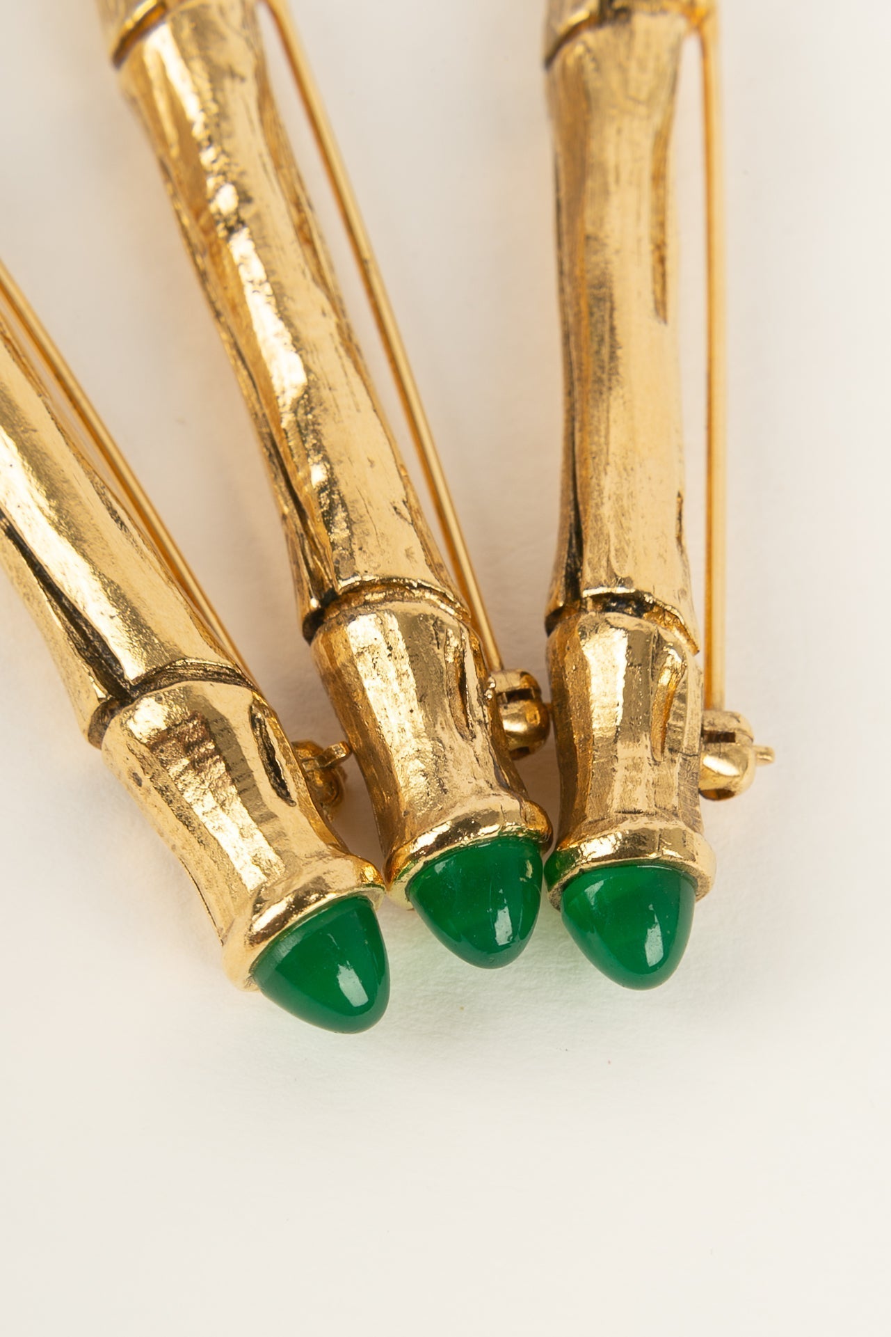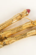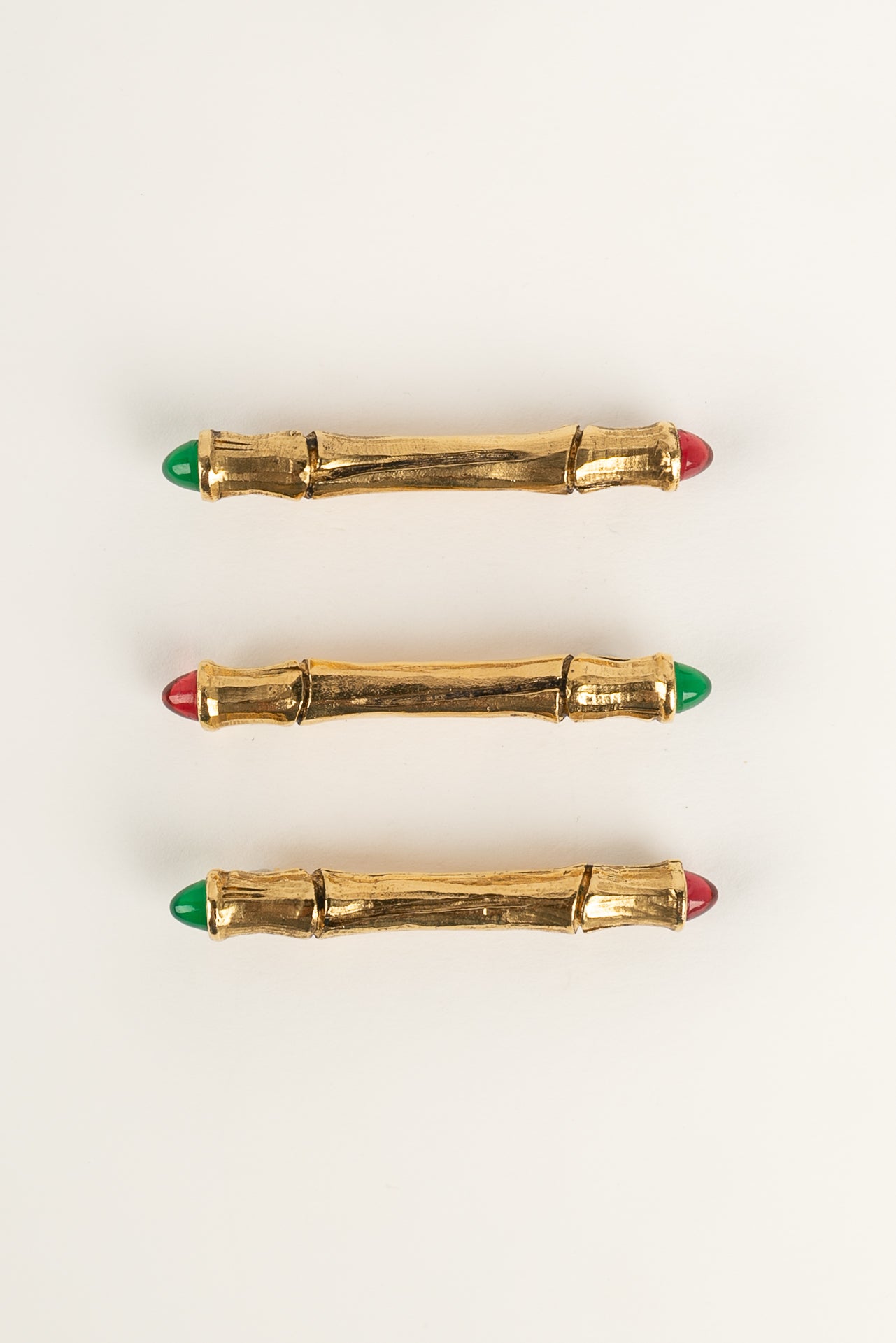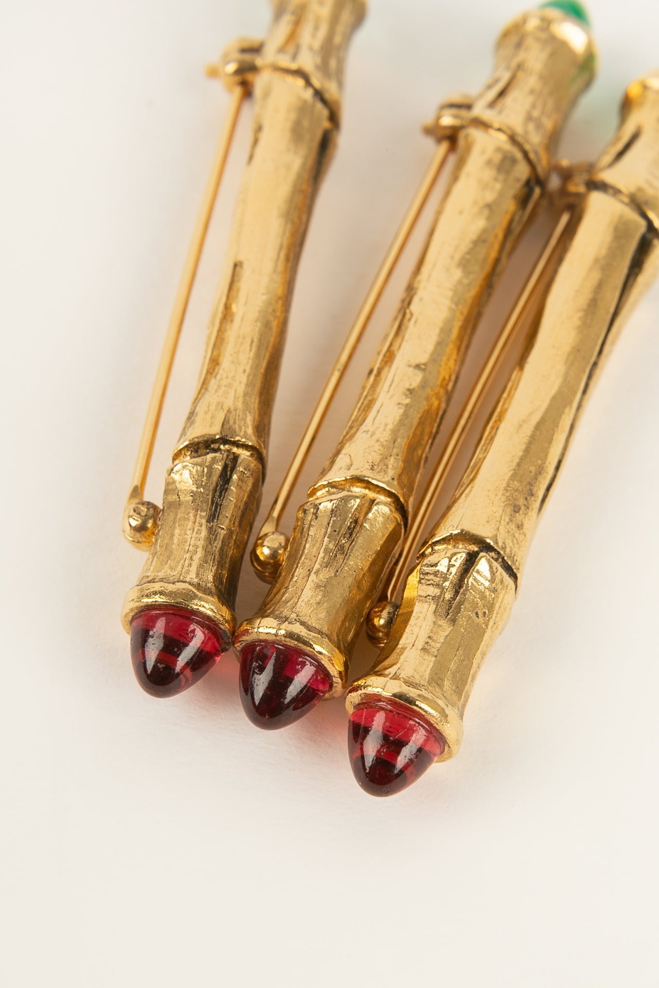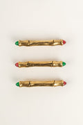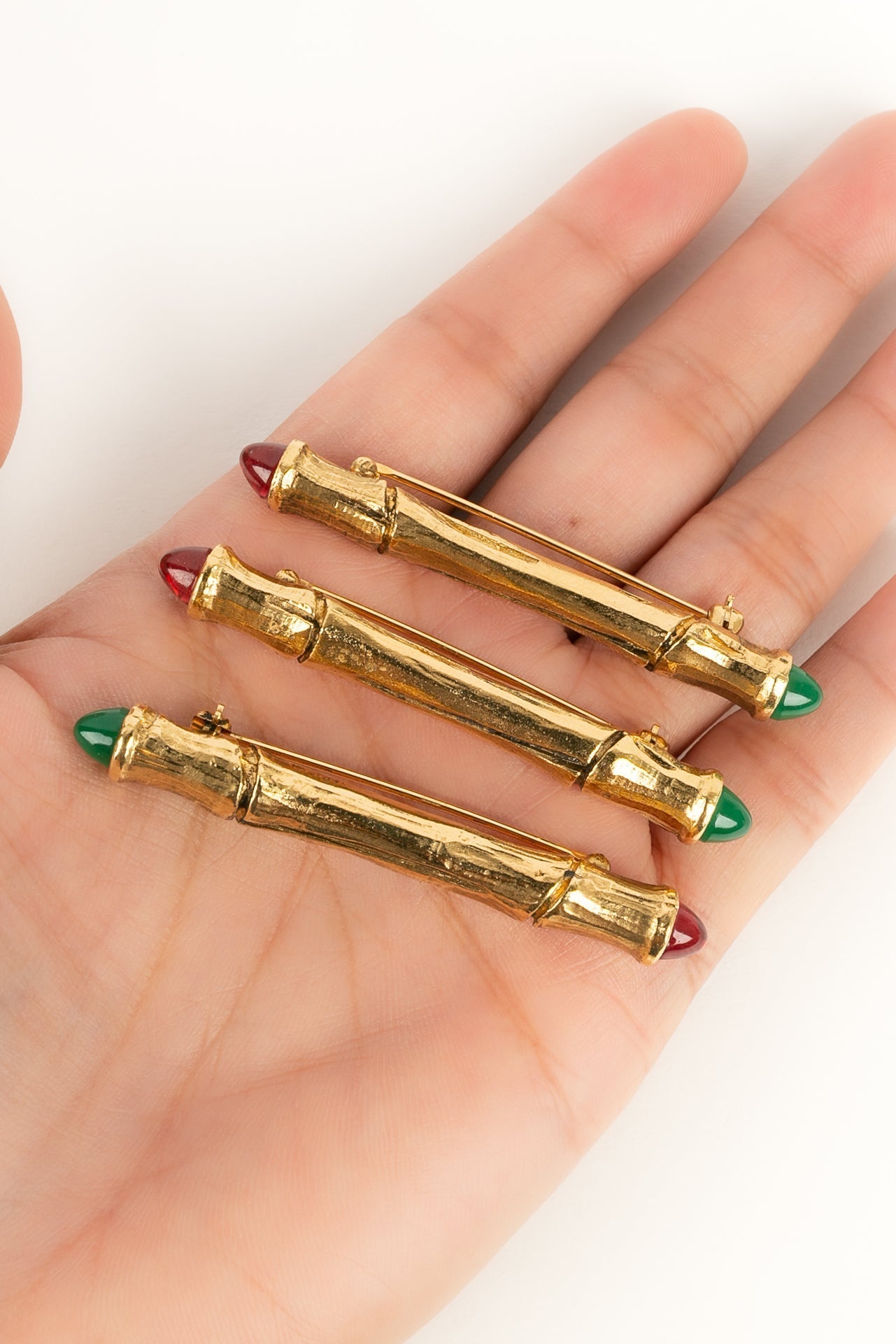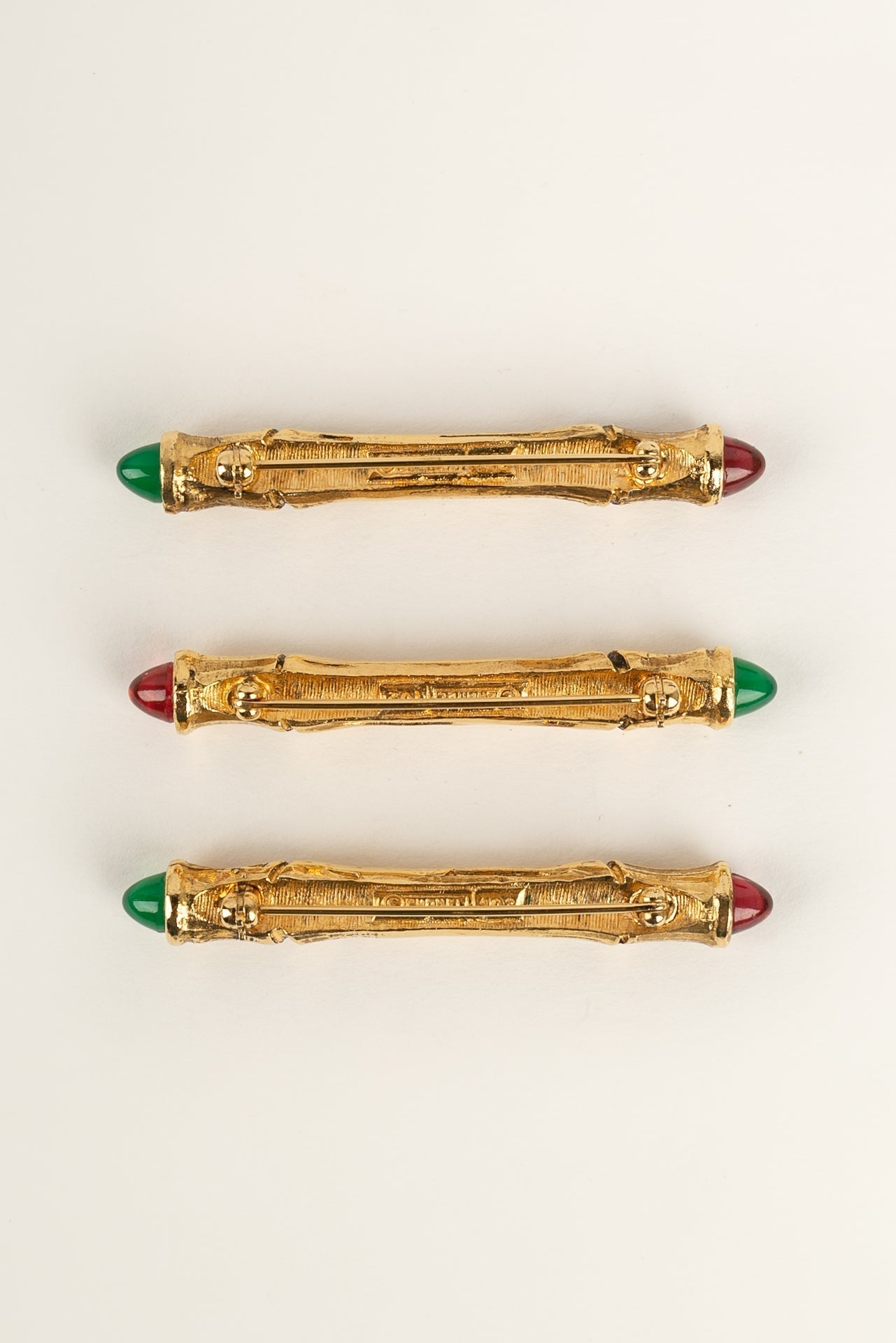 CHANEL -Ensemble de trois broches en m�tal dor� et p�te de verre rouge et verte.