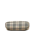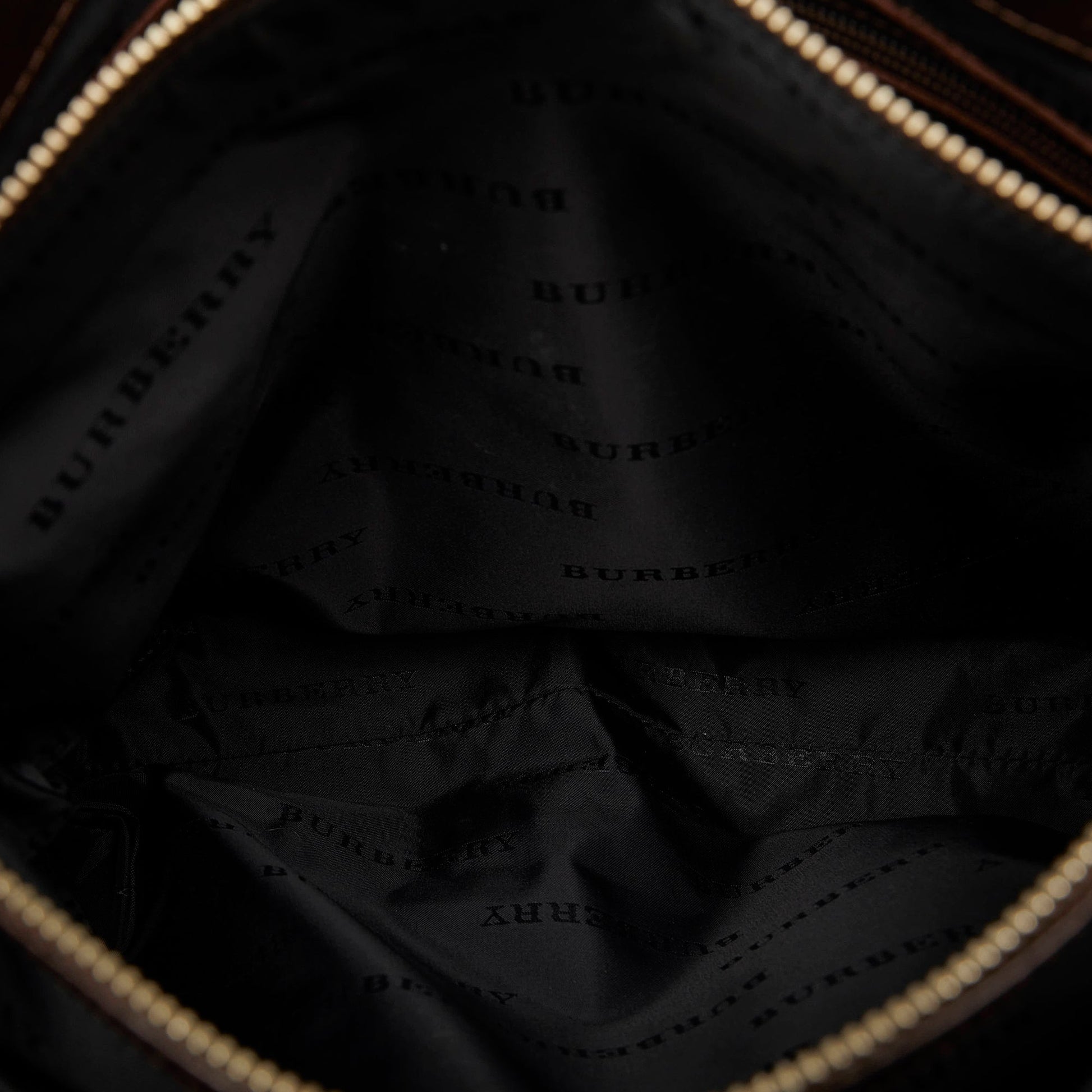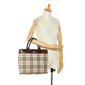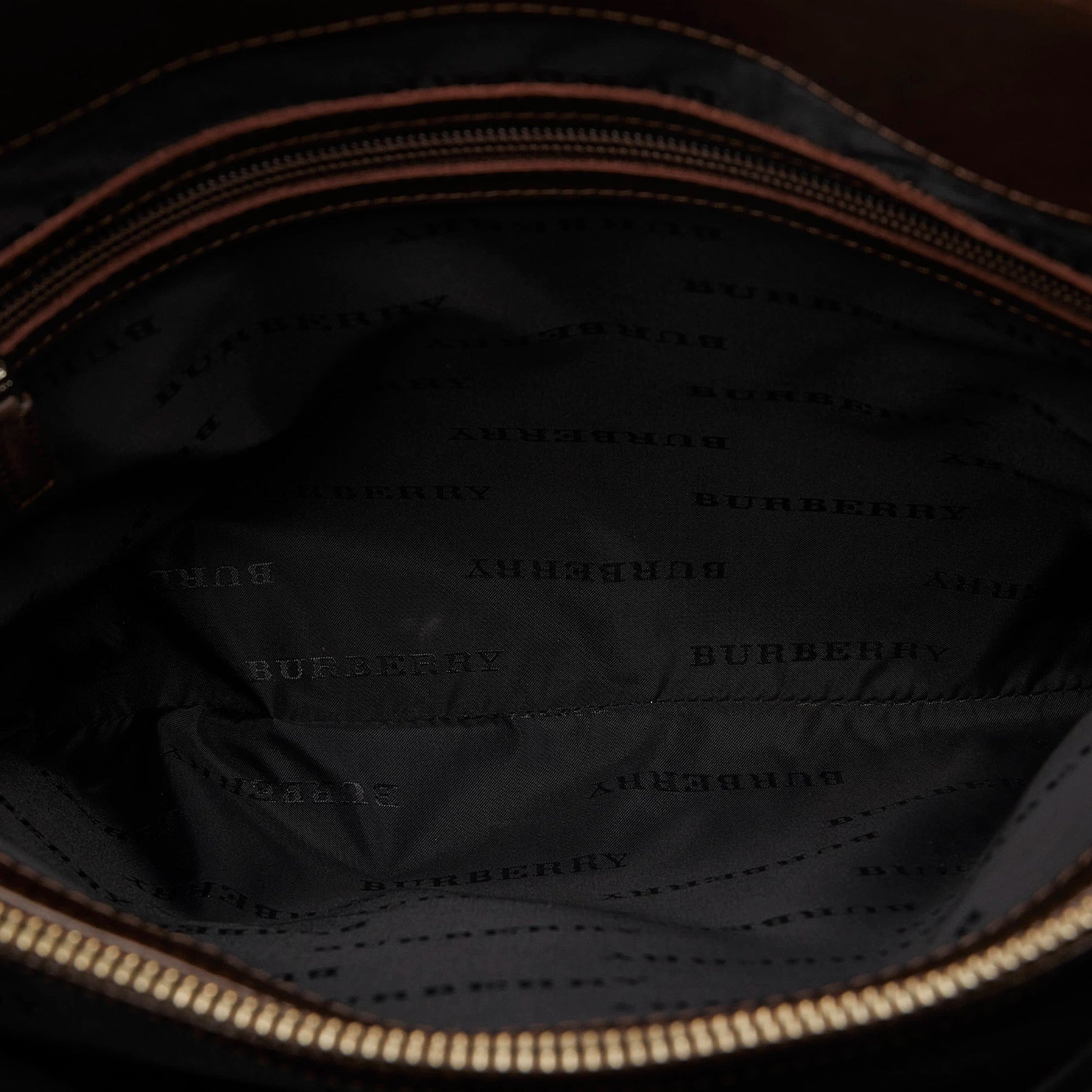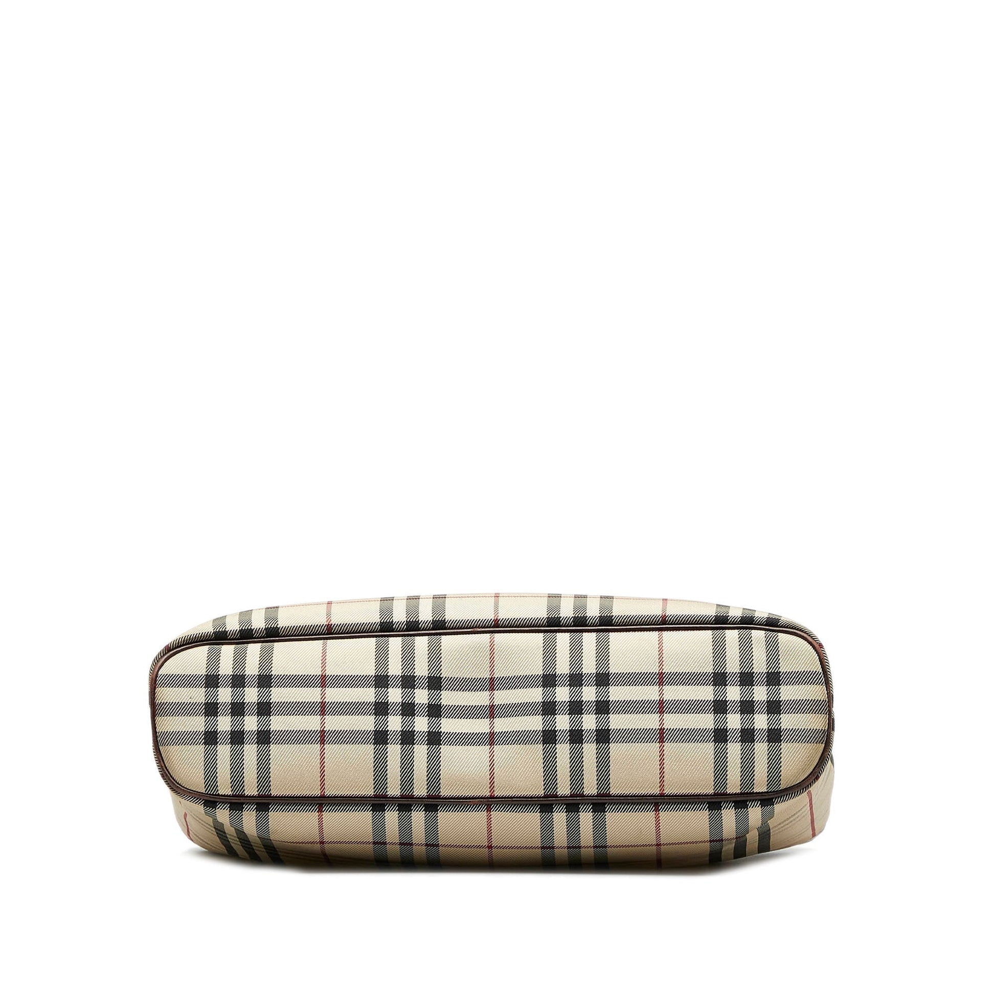 Product Details: Brown Burberry House Check Tote. This tote bag features a canvas body with leather trim, rolled leather handles, a top zip closure, and interior zip and slip pocket. 11" L x 13.2" W x 3.3" D, 4.7" drop.