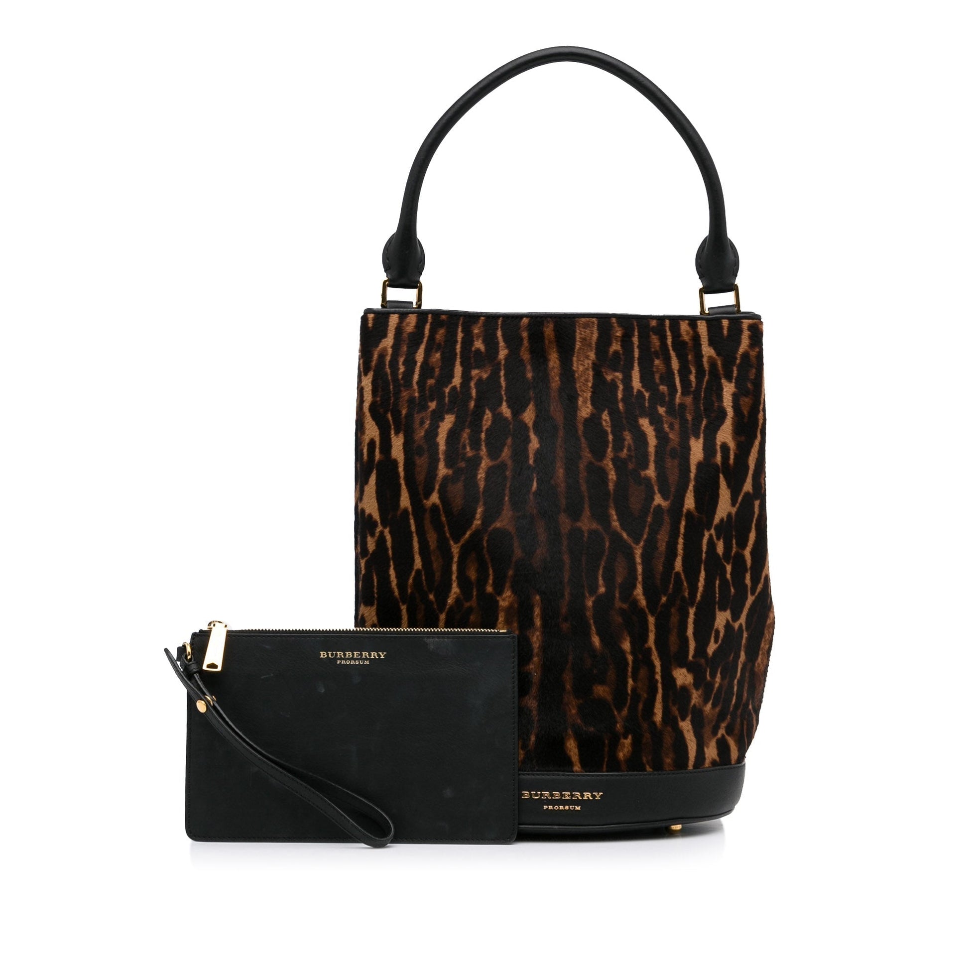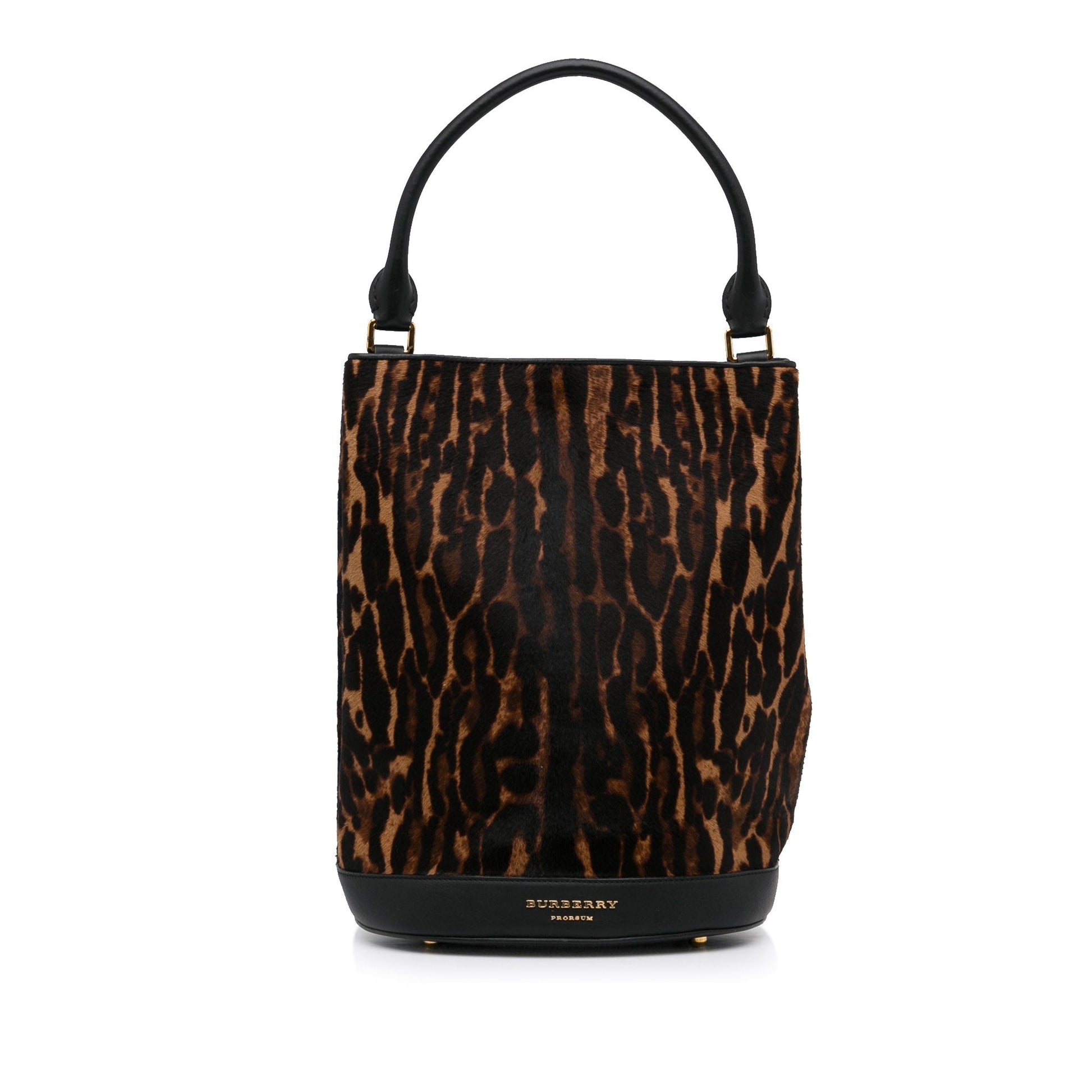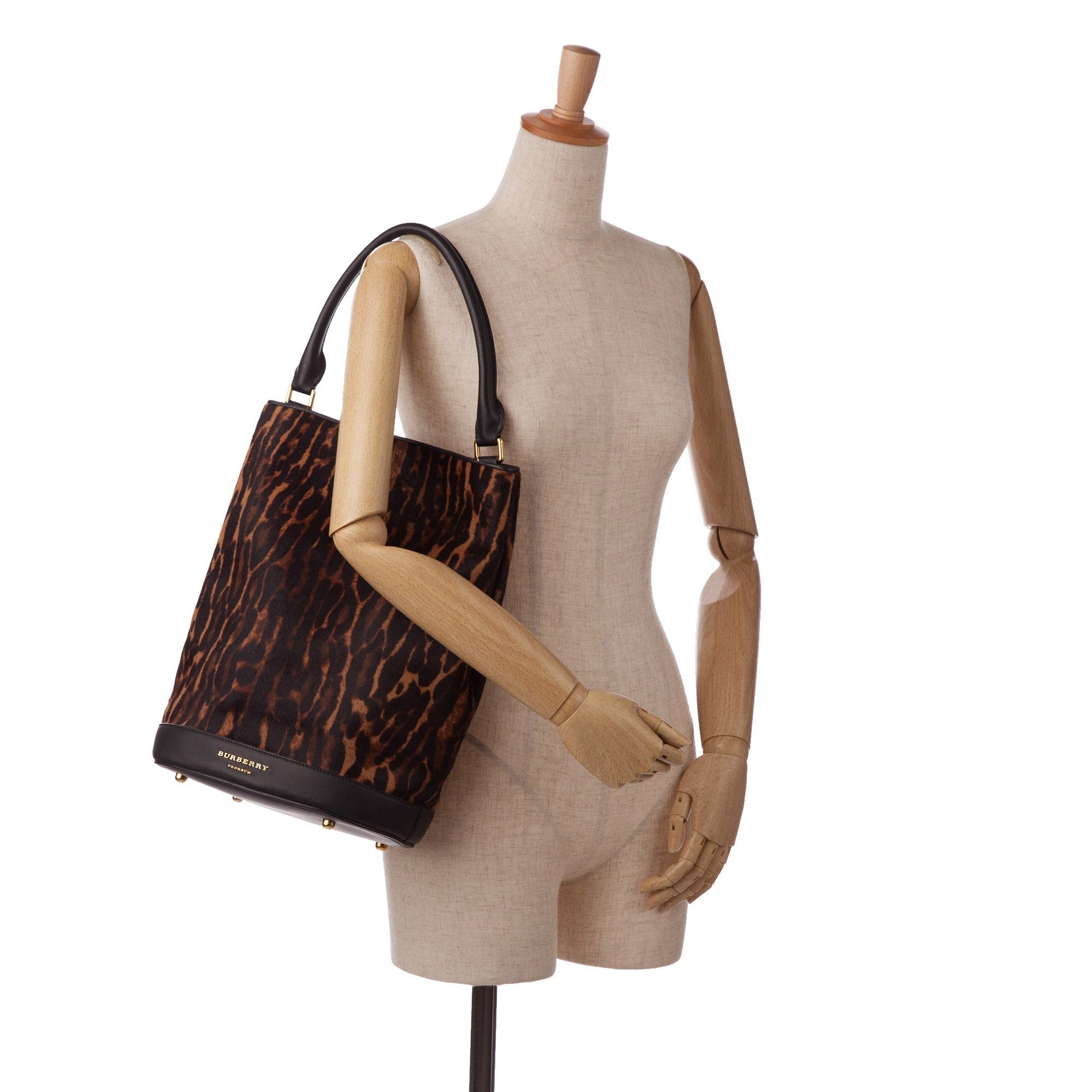 Product Details: Brown Burberry Pony Hair Tote Bag. This tote bag features a printed pony hair body, rolled leather handle, an open top with magnetic closure, and interior slip pocket. 10.2" L x 14.2" W x 7.5" D. Serial number ITGF&10SCA.