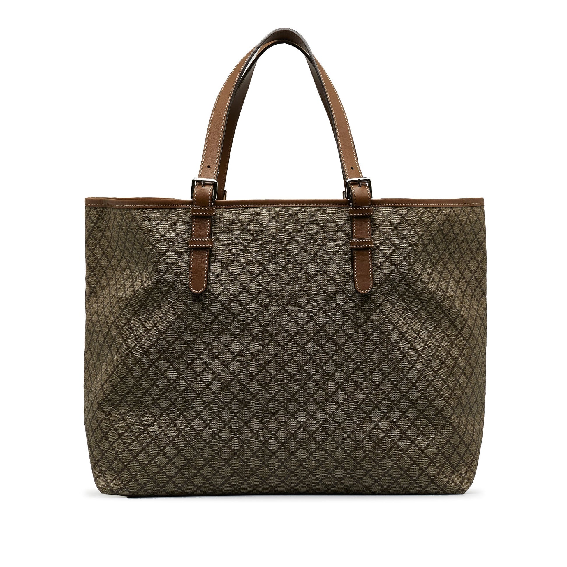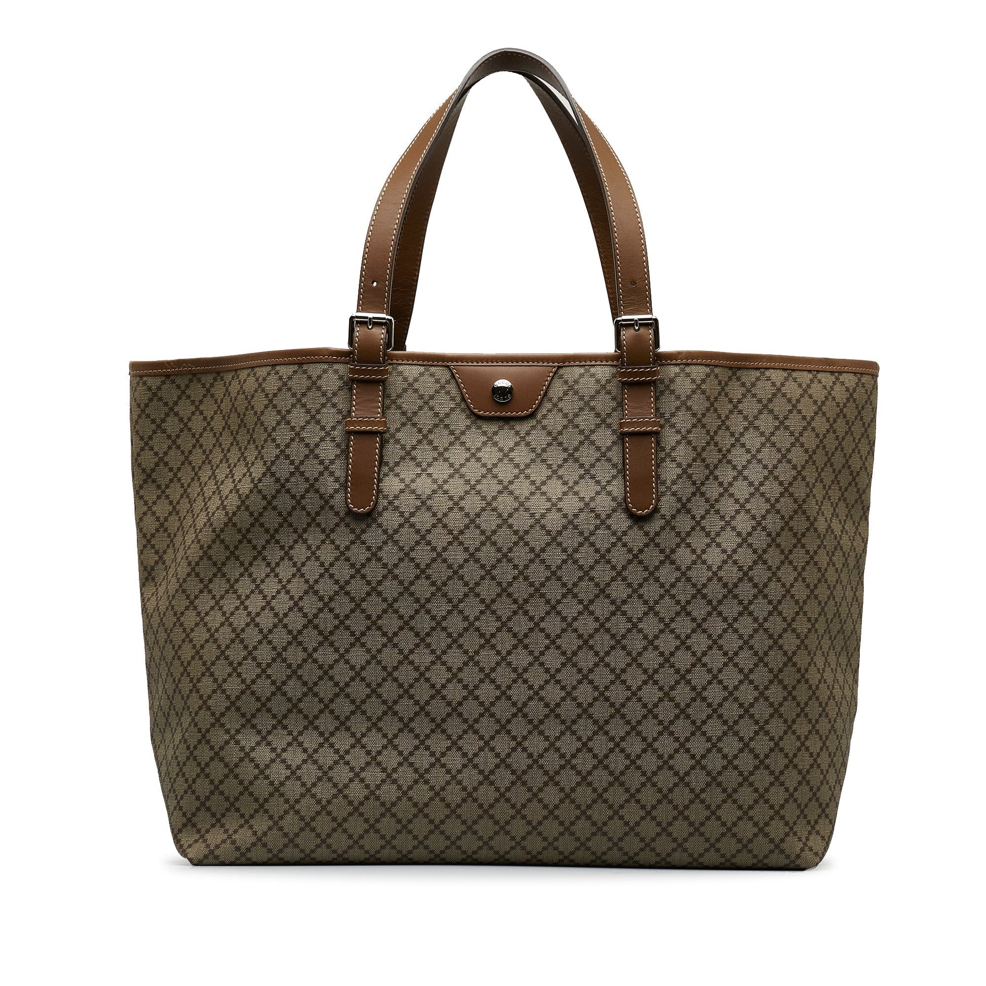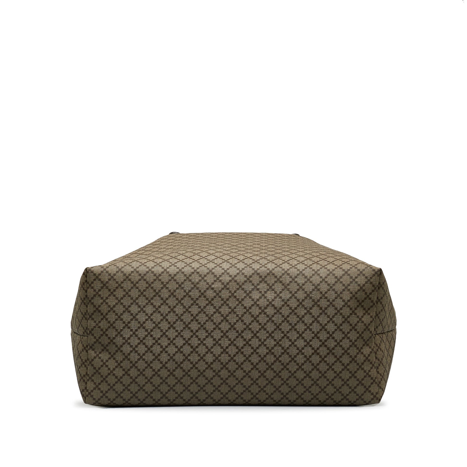 Product Details: Brown Gucci Canvas Diamante Tote. This tote bag features a canvas body with leather trim, flat leather straps, and an open top. 12.2" L x 21.3" W x 6.7" D, 8.7" drop. Serial number 295250?527536.