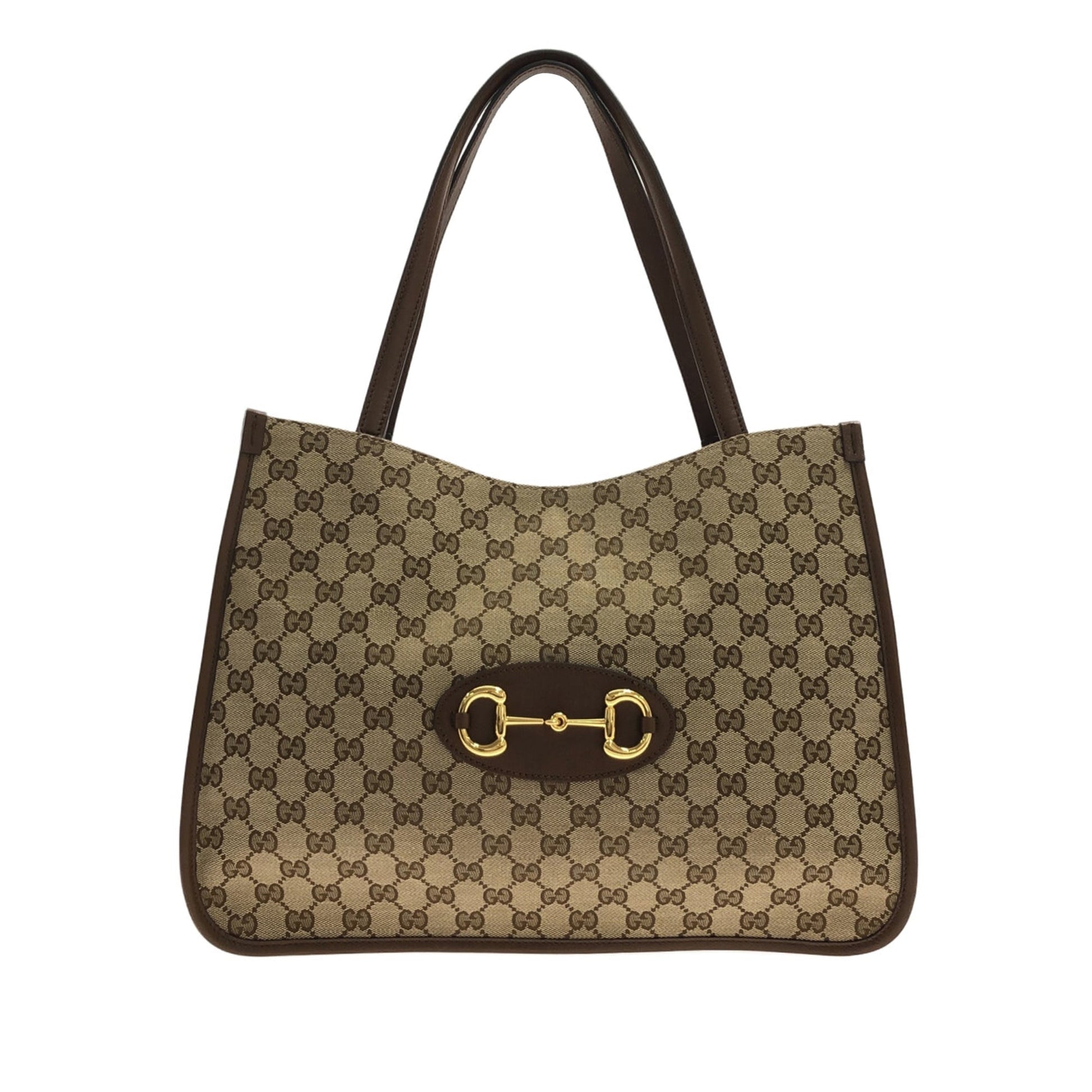 Product Details: Brown Gucci GG Canvas Horsebit 1955 Tote Bag. This tote bag features a canvas body with leather trim, flat leather shoulder straps, an open top with magnetic snap closure, and interior zip and slip pockets. 10" L x 14.8" W x 4.5" D, 8.7" drop.