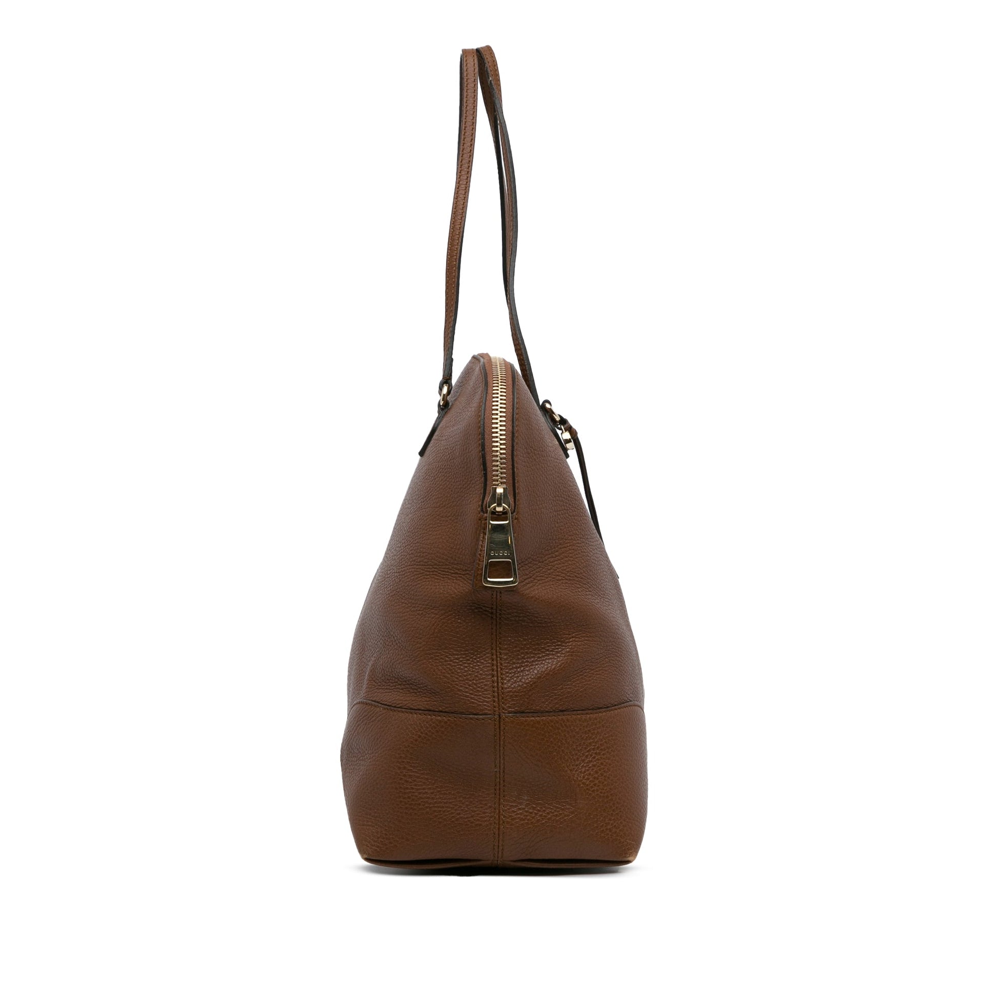 Product Details: Brown Gucci Leather Bree Tote Bag. This tote bag features a leather body, flat leather handles, a top zip closure, and interior zip and slip pockets. 12.2" L x 16.1" W x 6.7" D, 9.1" drop. Serial number 323672 213317.
