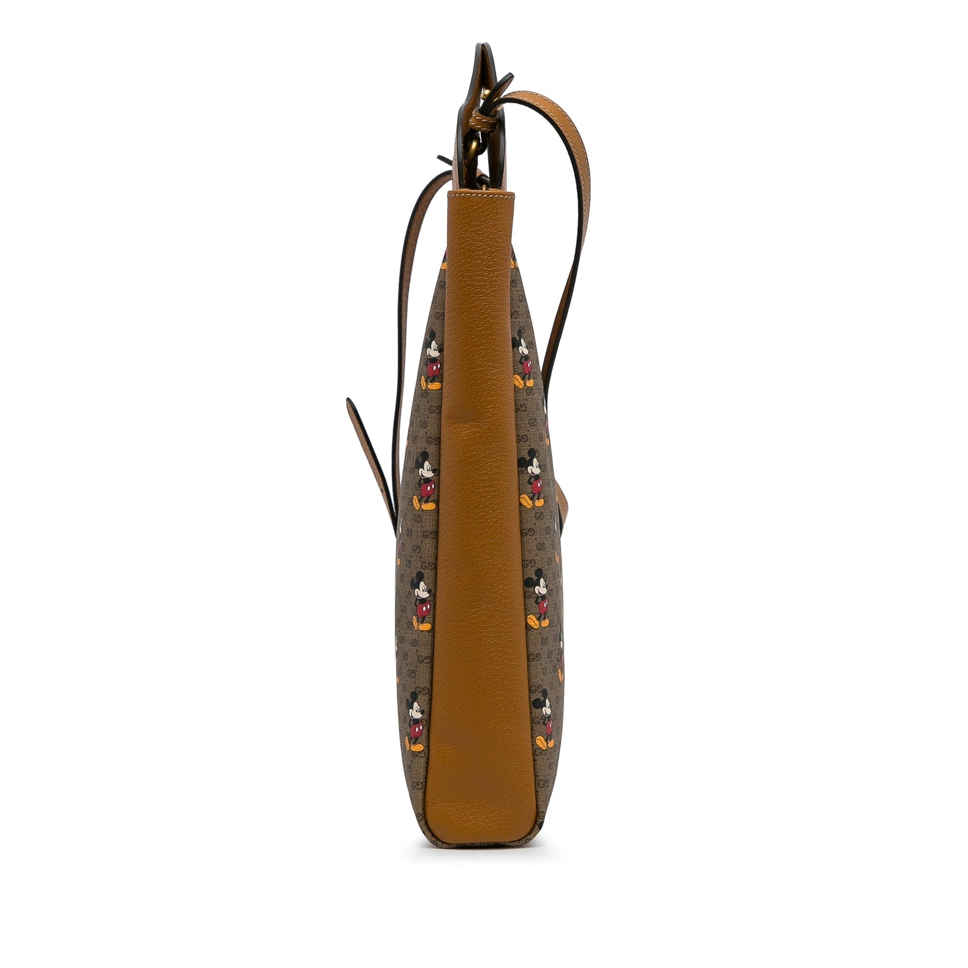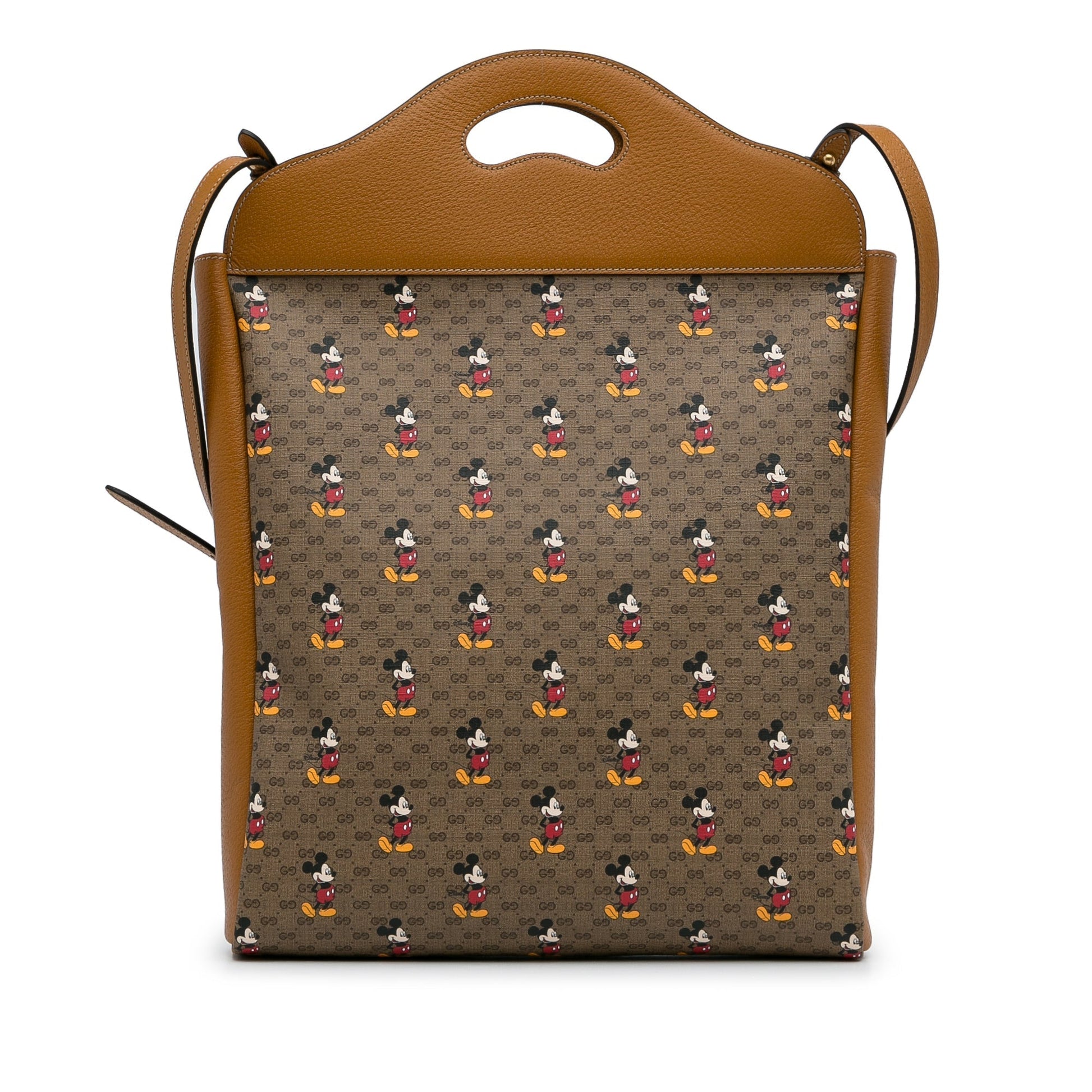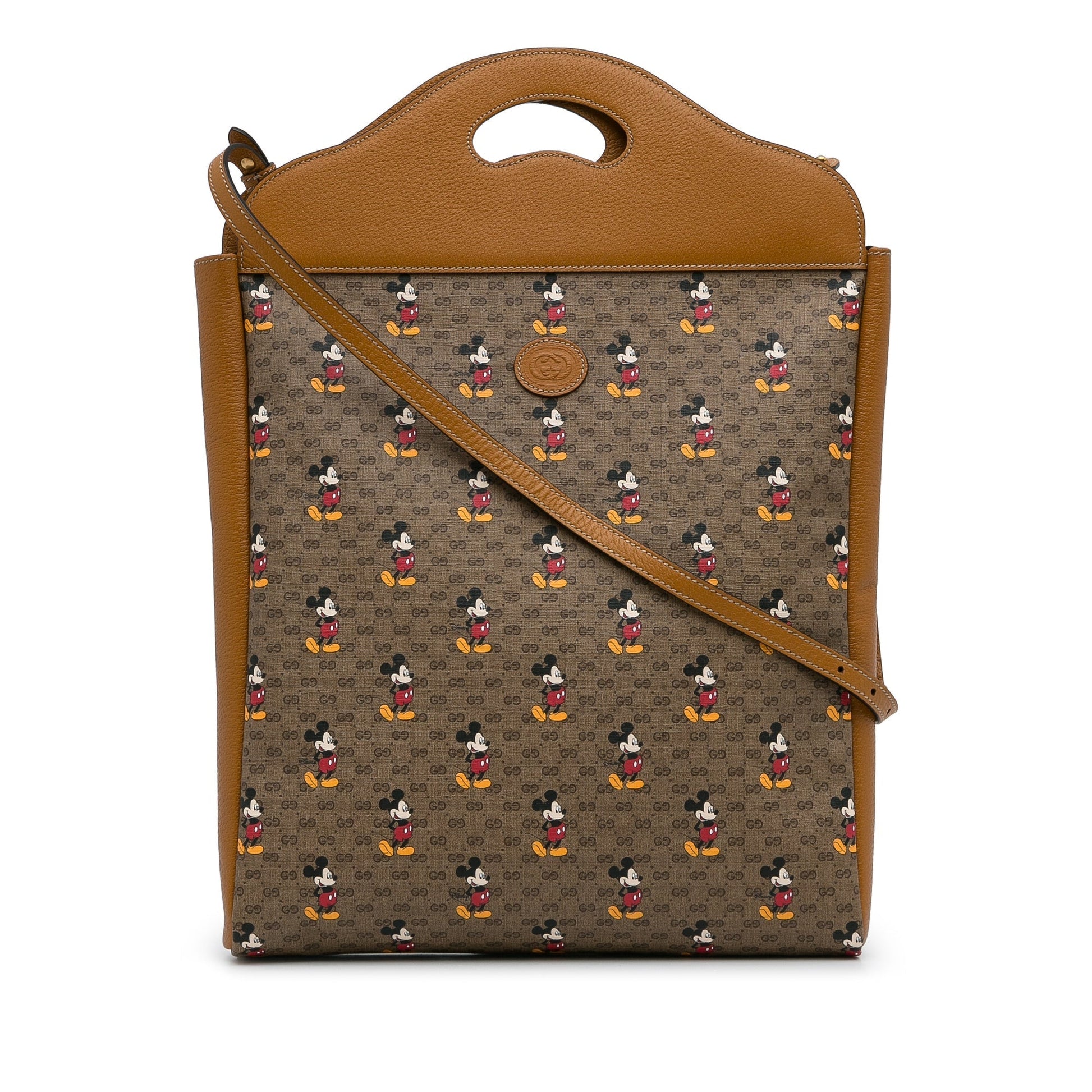 Product Details: Brown Gucci X Disney Micro GG Mickey Mouse Top Handle Tote Bag Satchel. This satchel features a coated canvas body with leather trim, a structured leather handle, a detachable flat leather strap, an open top, and an interior slip pocket. 13.2" L x 14.8" W x 2.8" D, 1.2" drop. Serial number 603937 493492.