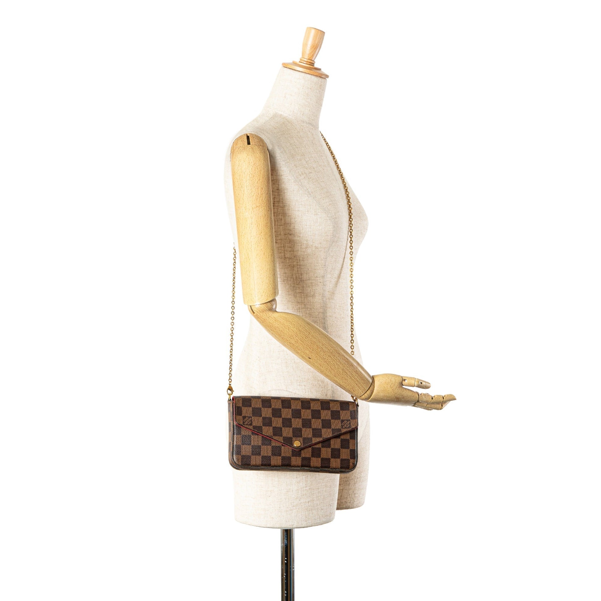 Product Details: Brown Louis Vuitton Damier Ebene Pochette Felicie Crossbody Bag. The Pochette Felicie crossbody bag features a damier ebene canvas body, a detachable gold-tone chain link shoulder strap, a top flap with snap closure, and an interior slip pocket. 8.3" L x 4.7" W x 1.2" D. Serial number MI5128.