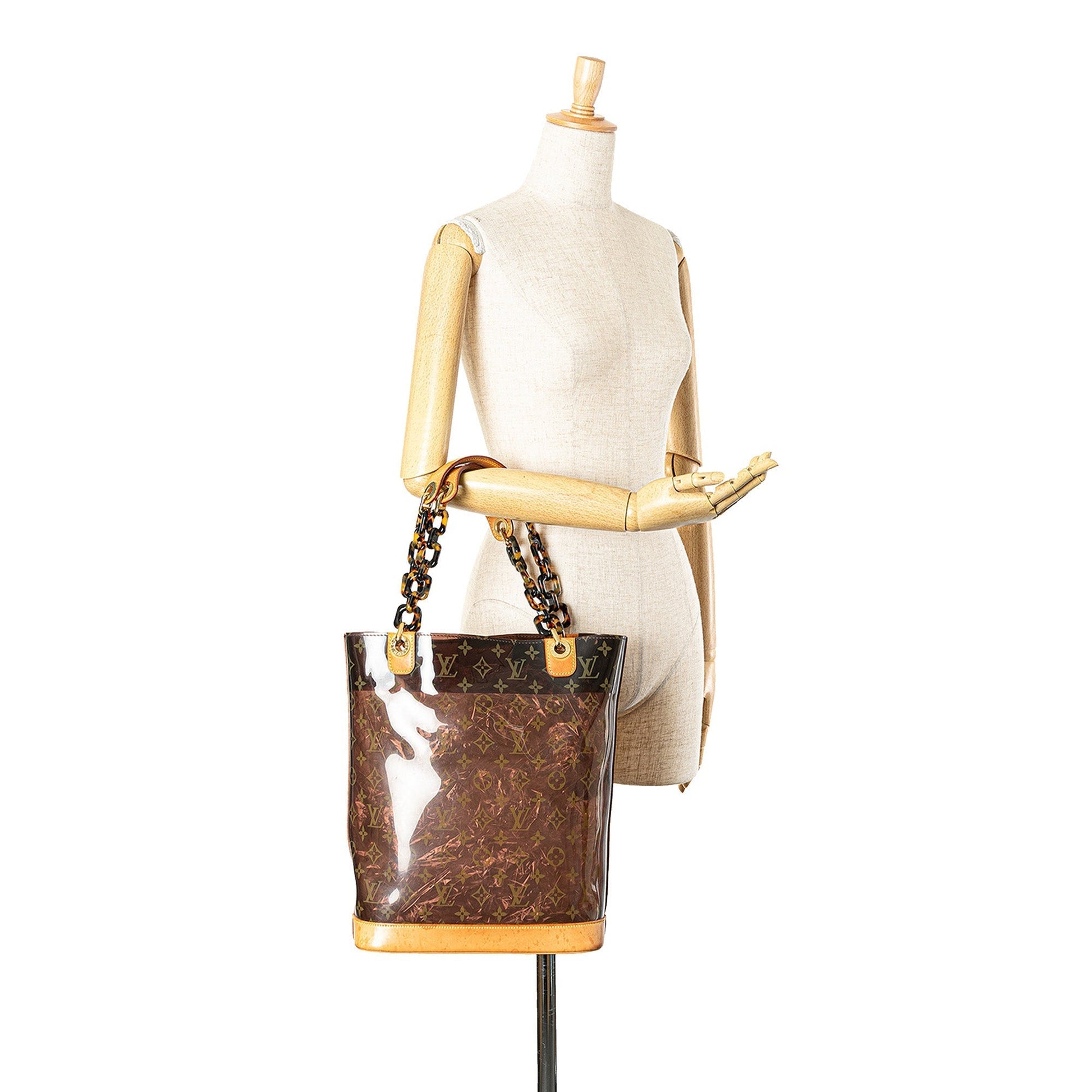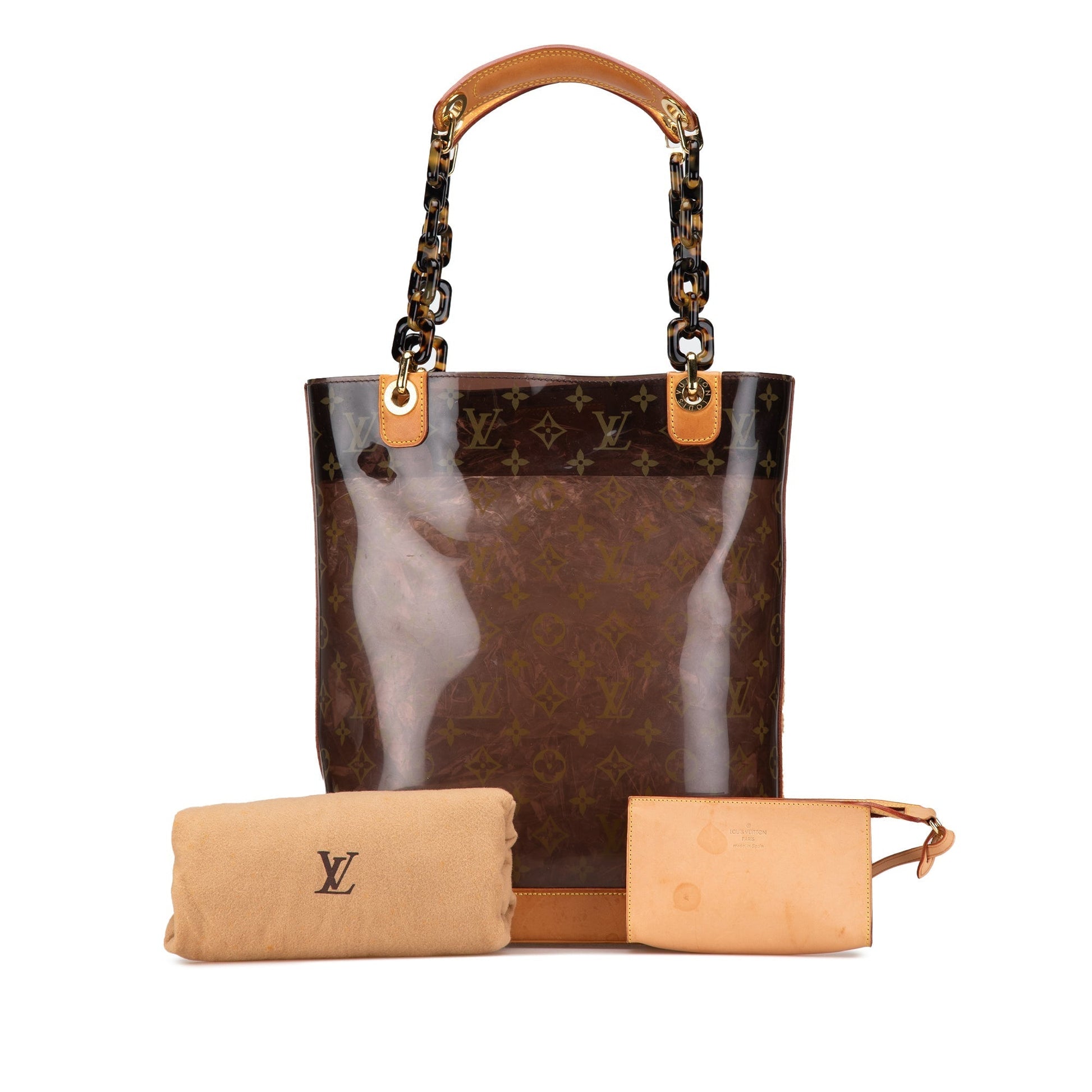 Product Details: Brown Louis Vuitton Monogram Cabas Sac Ambre MM Tote Bag. This tote bag features a clear PVC body with leather trim, flat vachetta leather and tortoise shell handles, and an open top. 13.4" L x 10.2" W x 4.7" D, 8.7" drop. Serial number LM0023.