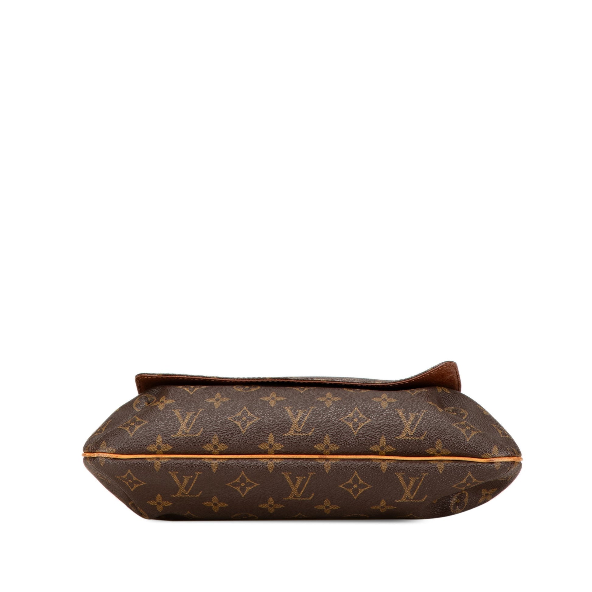 Product Details: Brown Louis Vuitton Monogram Musette Salsa GM Crossbody Bag. The Musette Salsa features a monogram canvas body with vachetta leather trim, an adjustable vachetta leather shoulder strap with buckle details, a front flap with magnetic snap closure, and an interior slip pocket. 14.2" L x 12.2" W x 1.2" D. Serial number SL1011.