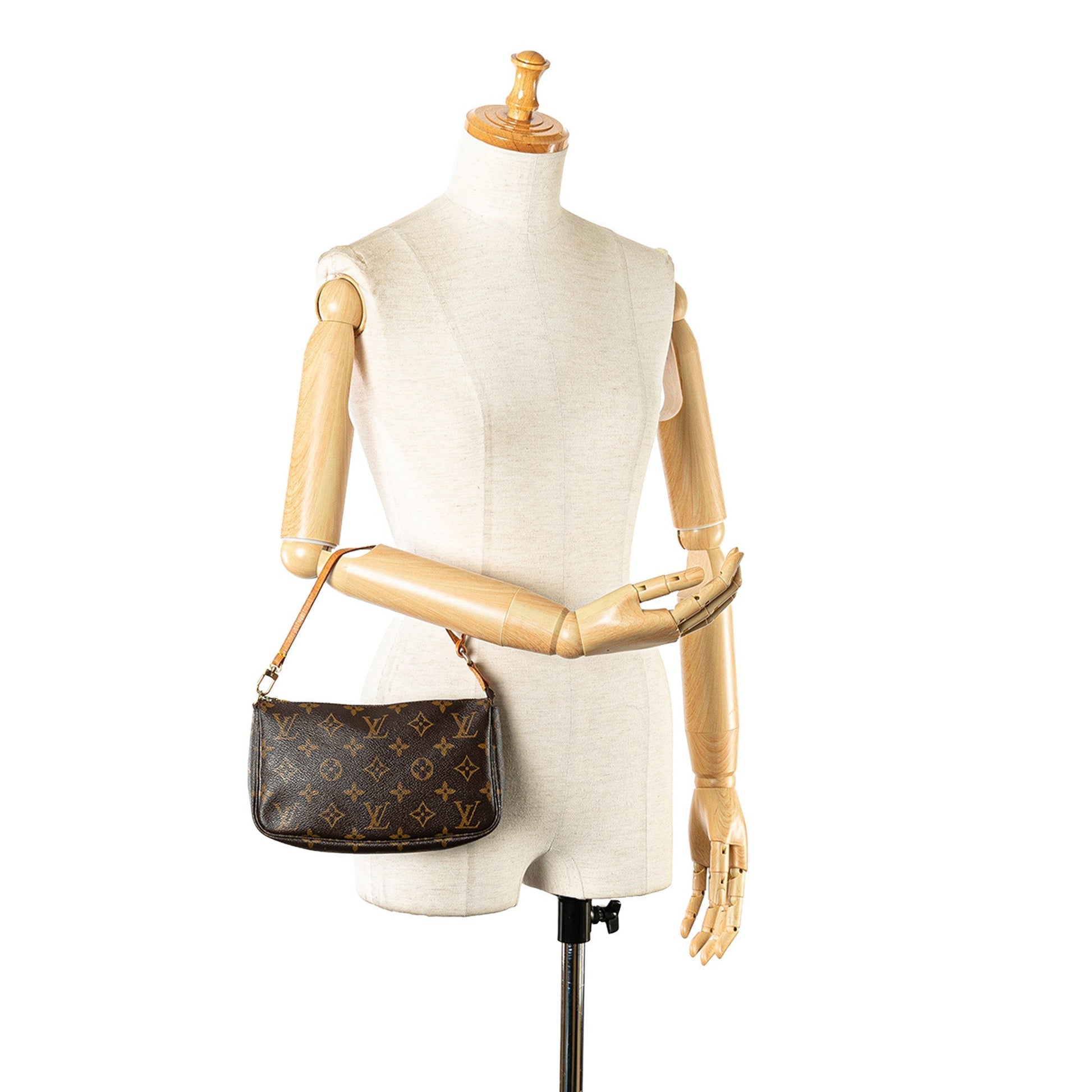 Product Details: Brown Louis Vuitton Monogram Pochette Accessoires Shoulder Bag. The Pochette Accessoires features a monogram canvas body, a flat vachetta leather handle, and a top zip closure. 5.1" L x 8.3" W x 1.4" D. Serial number AR0021.