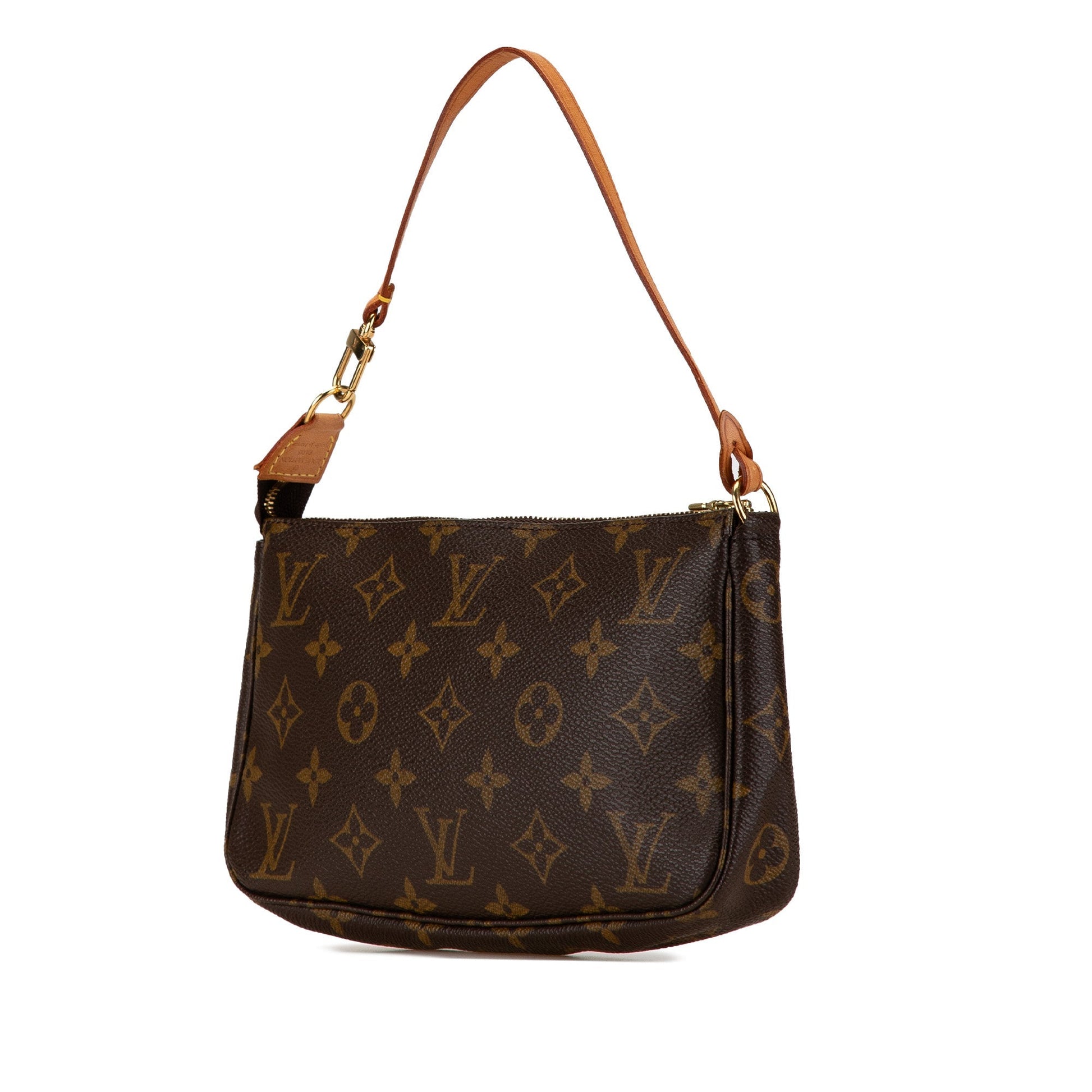 Product Details: Brown Louis Vuitton Monogram Pochette Accessoires Shoulder Bag. The Pochette Accessoires features a monogram canvas body, a flat vachetta leather handle, and a top zip closure. 5.1" L x 8.3" W x 1.2" D, 5.5" drop. Serial number VI1000.