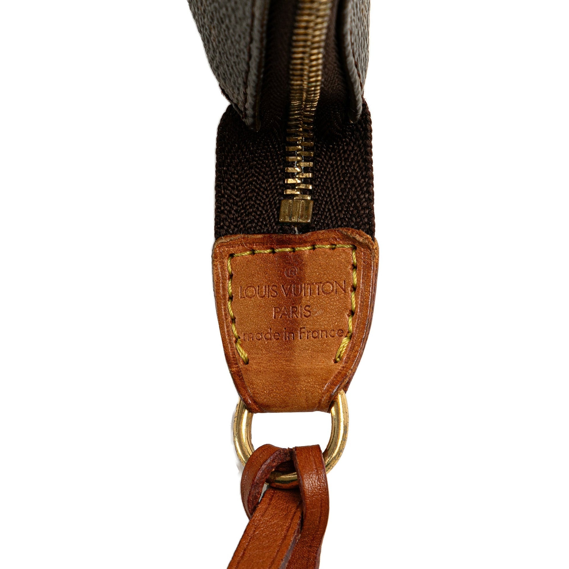 Product Details: Brown Louis Vuitton Monogram Pochette Accessoires Shoulder Bag. The Pochette Accessoires features a monogram canvas body, a flat vachetta leather strap, and a top zip closure. 5.1" L x 8.3" W x 1.4" D. Serial number VI0012.