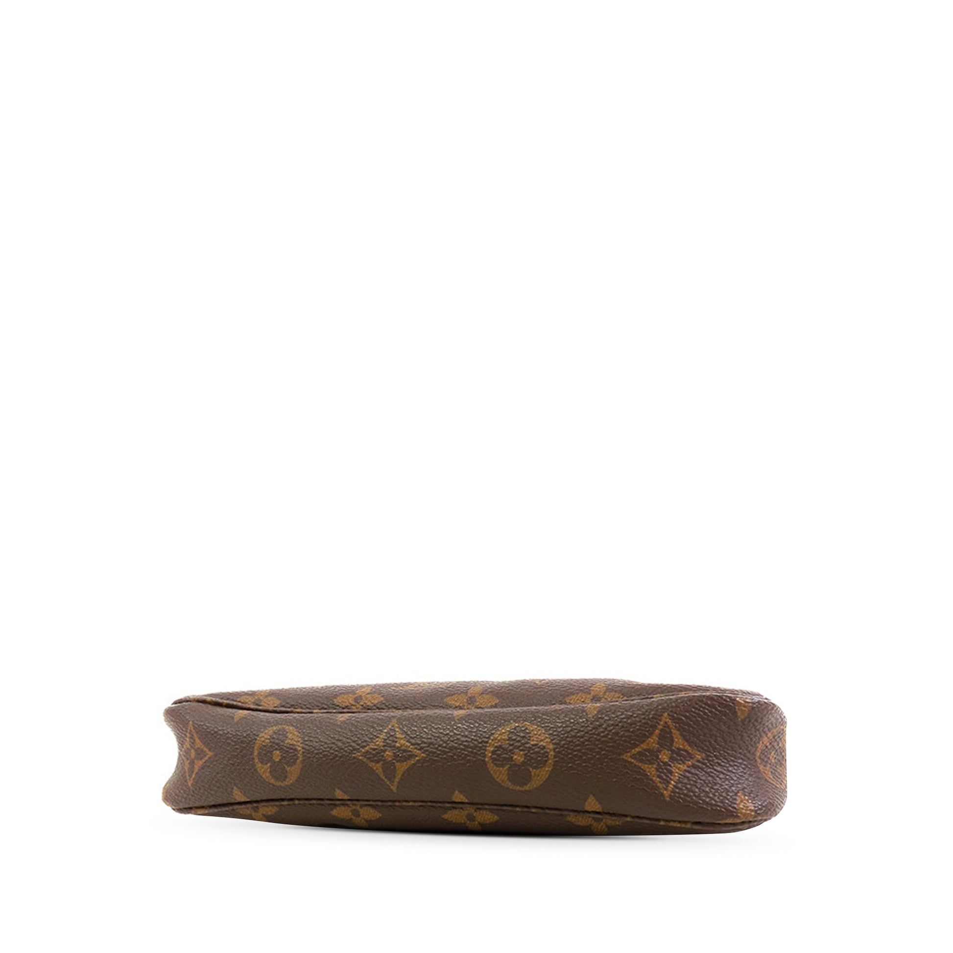 Product Details: Brown Louis Vuitton Monogram Pochette Accessoires Shoulder Bag. The Pochette Accessoires features a monogram canvas body, a flat vachetta leather handle, and a top zip closure. 5.1" L x 8.1" W x 1.6" D. Serial number SL0979.