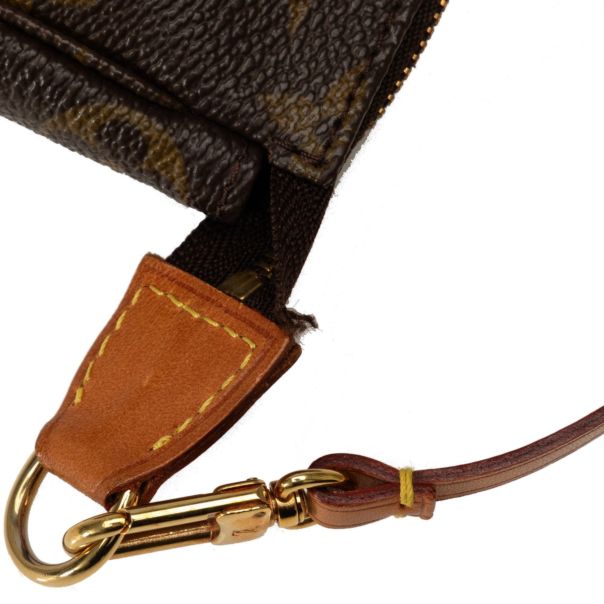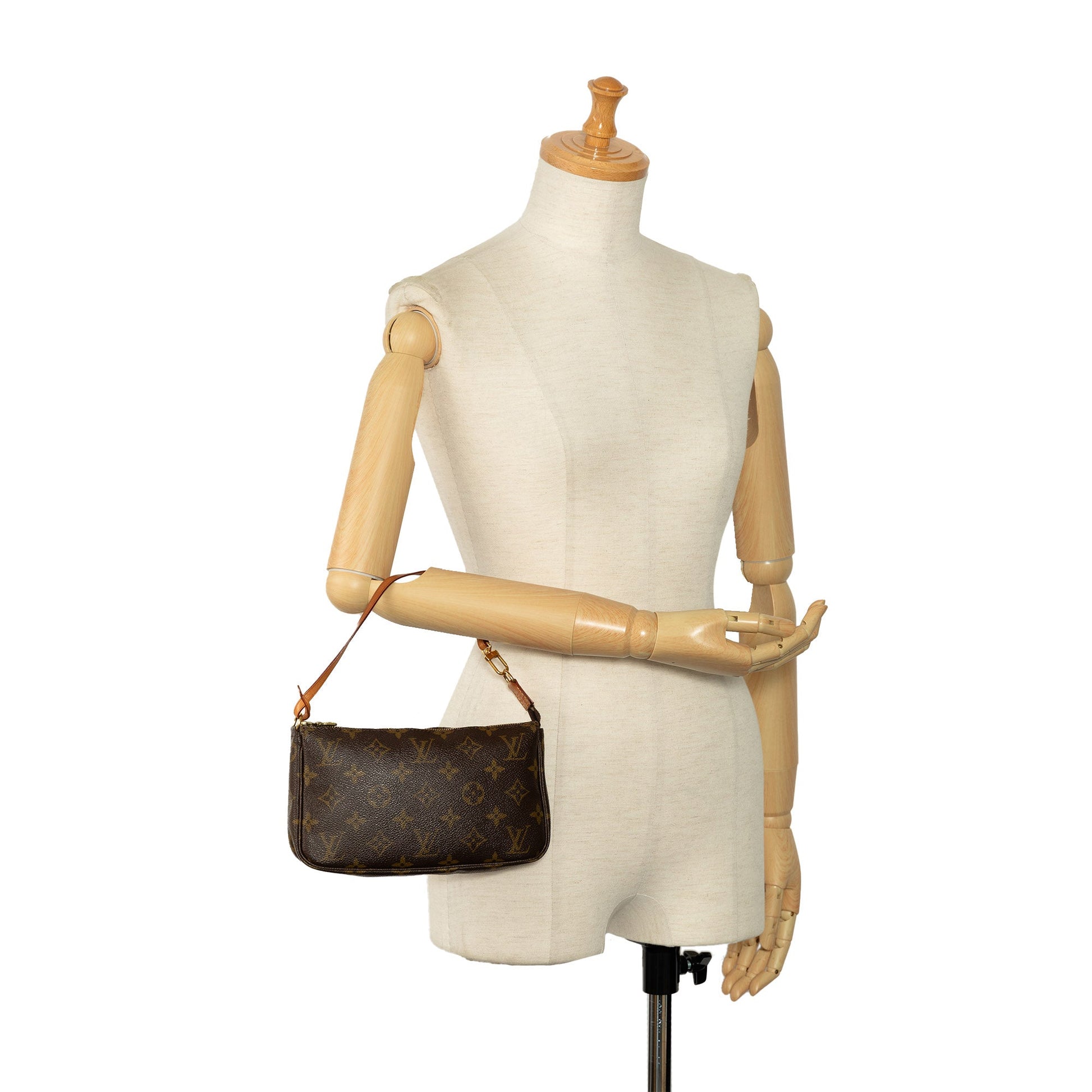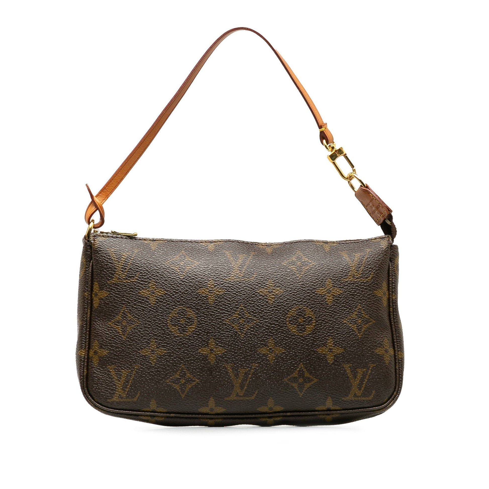 Product Details: Brown Louis Vuitton Monogram Pochette Accessoires Shoulder Bag. The Pochette Accessoires features a monogram canvas body, a flat vachetta leather handle, and a top zip closure. 5.1" L x 8.3" W x 1.2" D, 5.7" drop. Serial number VI1929.