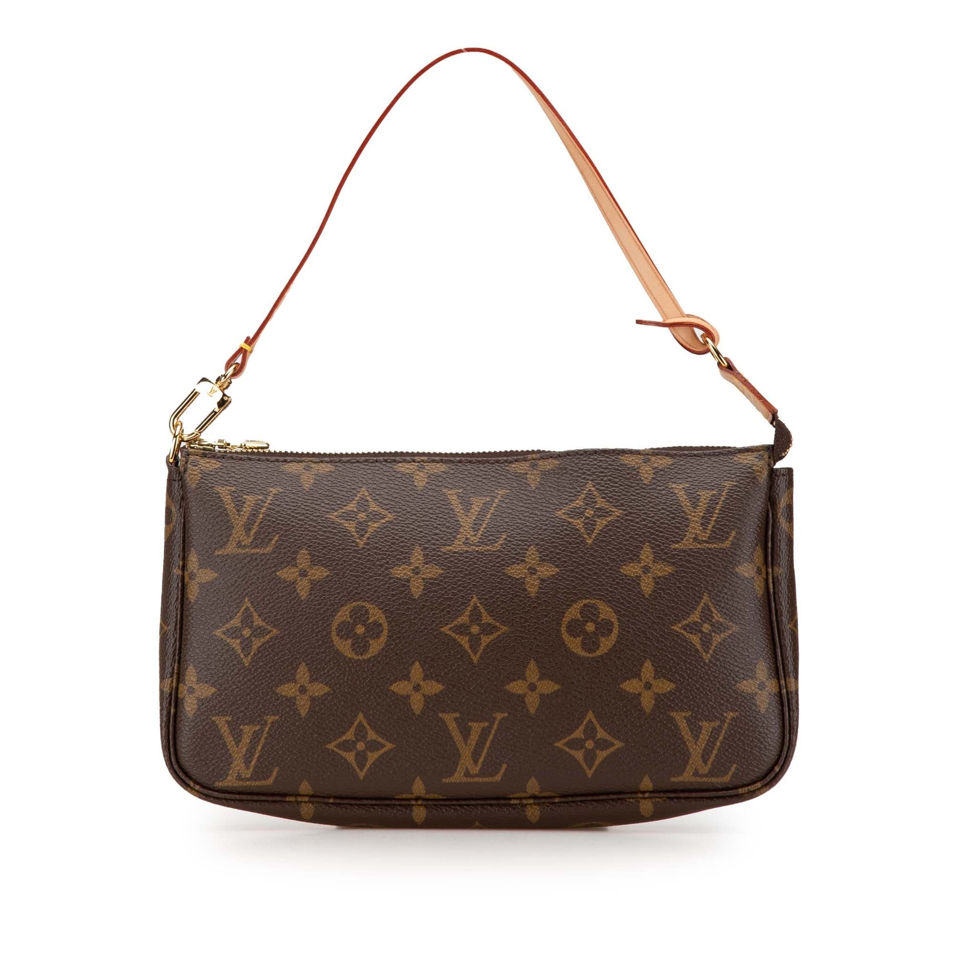 Product Details: Brown Louis Vuitton Monogram Pochette Accessoires Shoulder Bag. The Pochette Accessoires features a monogram canvas body, a flat vachetta leather handle, and a top zip closure. 5.1" L x 8.7" W x 1.6" D. Serial number AR0035.