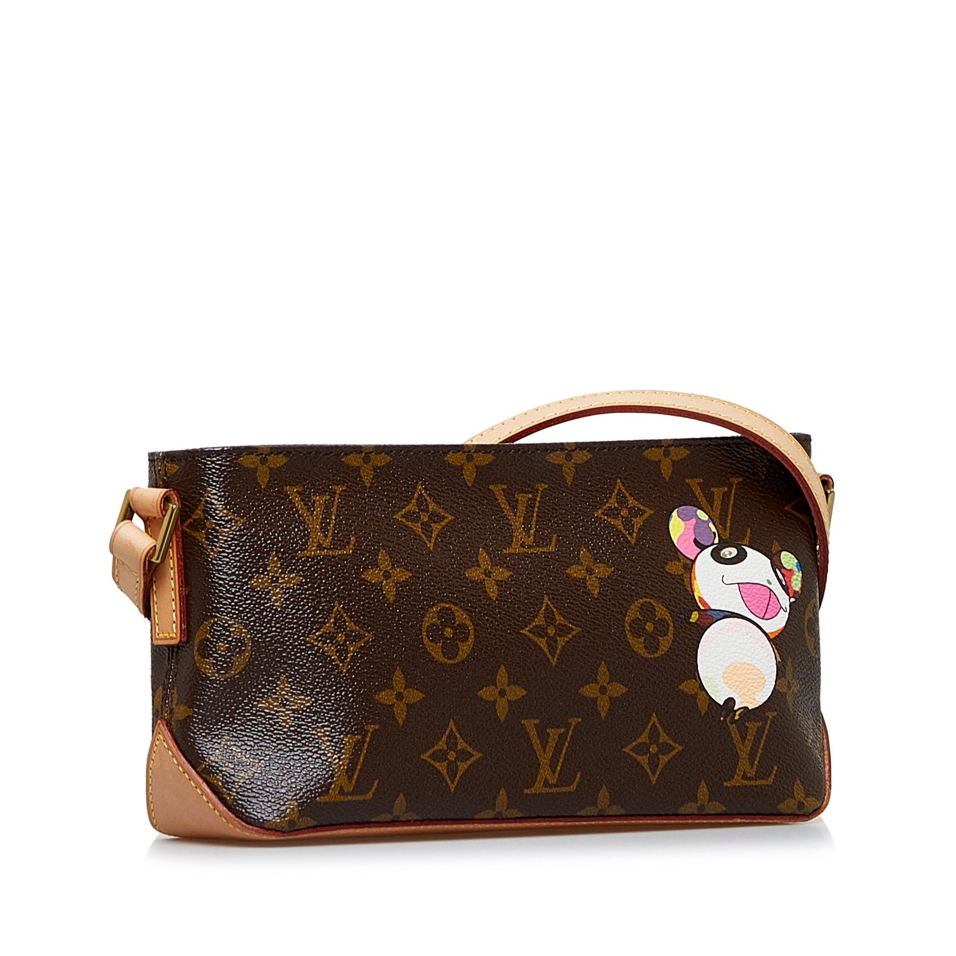 Product Details: Brown Louis Vuitton x Takashi Murakami Monogram Panda Trotteur . The Trotteur features a monogram canvas body, a flat vachetta strap, a top zip closure, and an interior zip pocket. 5.9" L x 2.6" W x 9.8" D. Serial number AR0094.