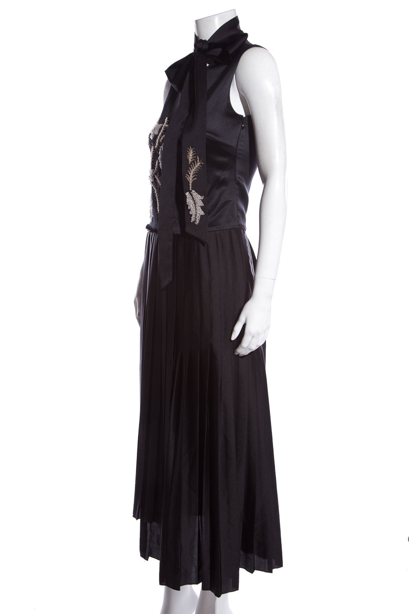 Burberry Black Satin Embellished Pleated Sleeveless Dress w/ neck tie detail and concealed zipper on side. This item is in good condition.