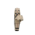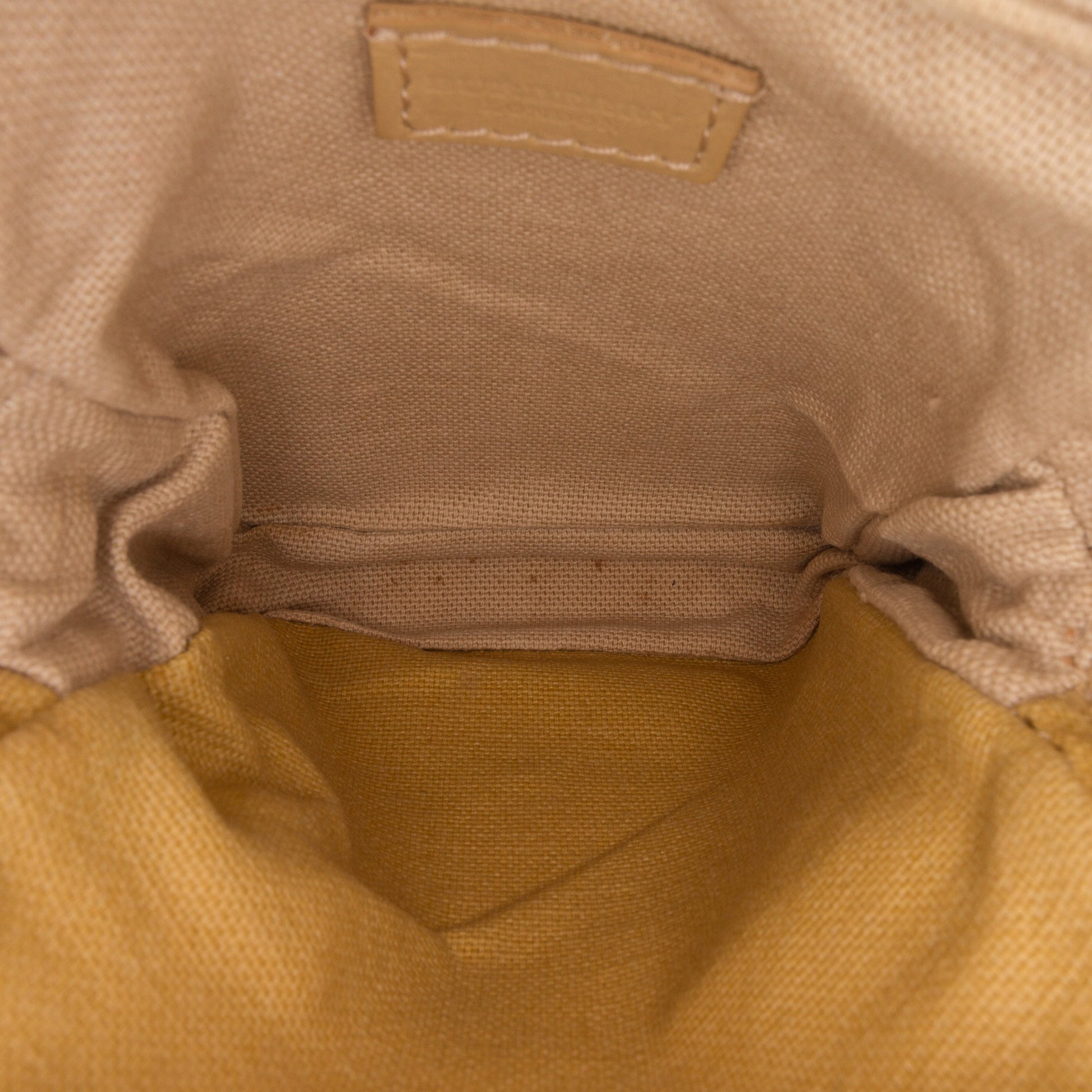 This PradaBag is made of light brown plaid canvas, a flat canvas shoulder strap, an outside pocket and a zipper at the top. It is best across the body or loosely over the shoulder.