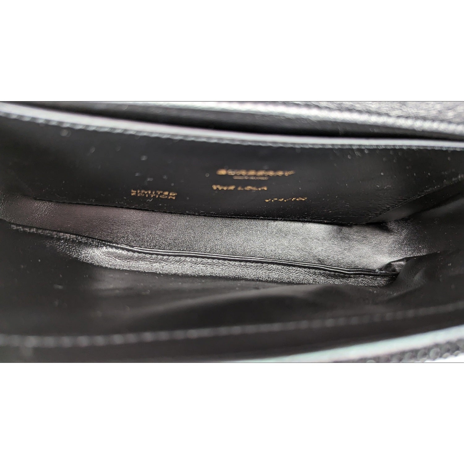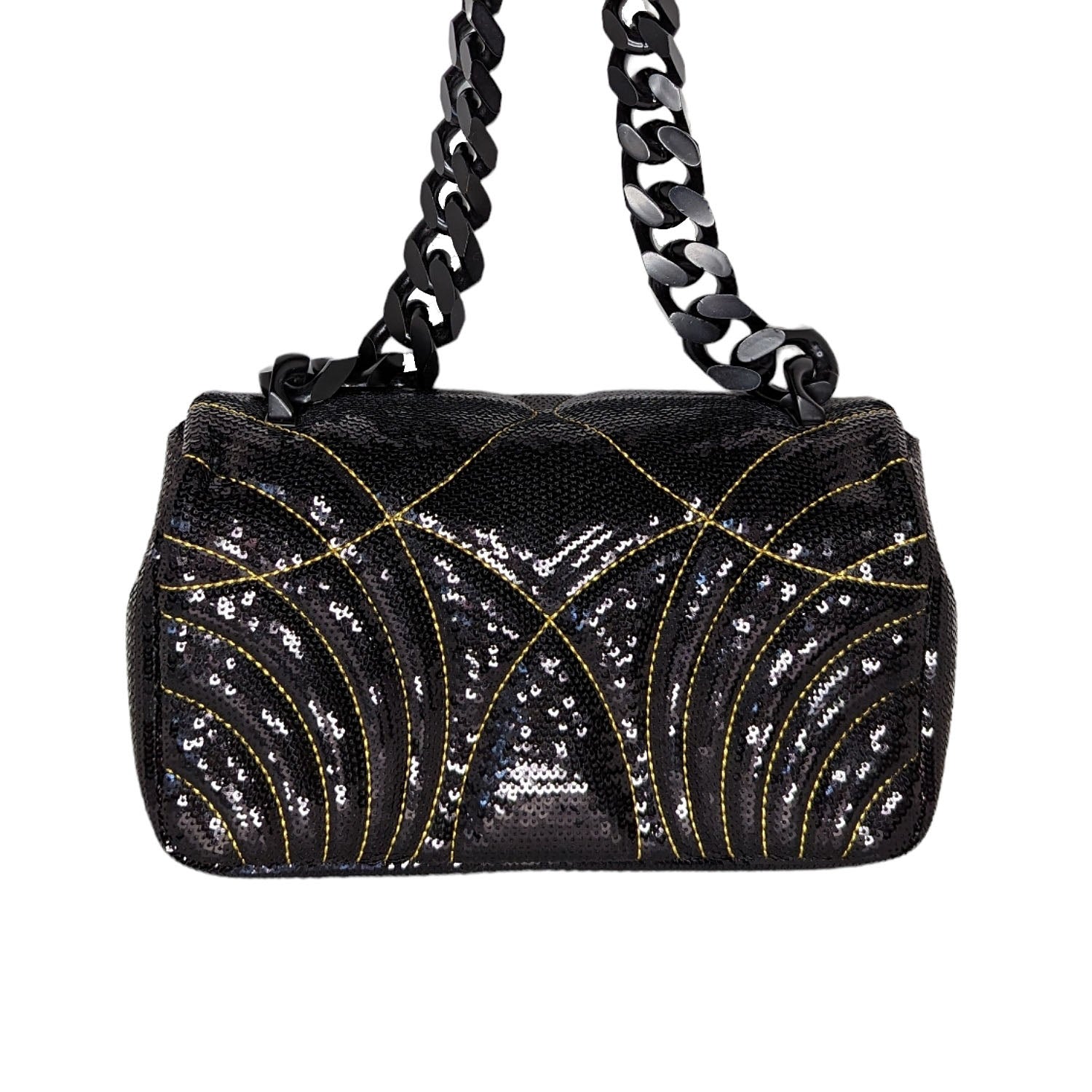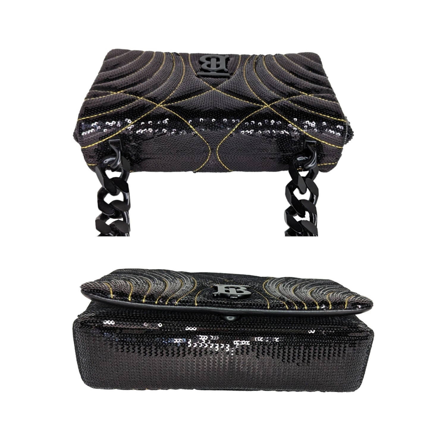 Burberry "Lola'' shoulder bag in all over quilted, topstitched sequins fabric and lambskin leather. Features Thomas Burberry monogram on front, tonal chunky chain shoulder strap, flap top with magnetic closure, leather interior lining with one slip pocket. Retail price $3,450.