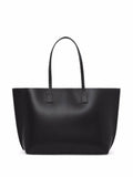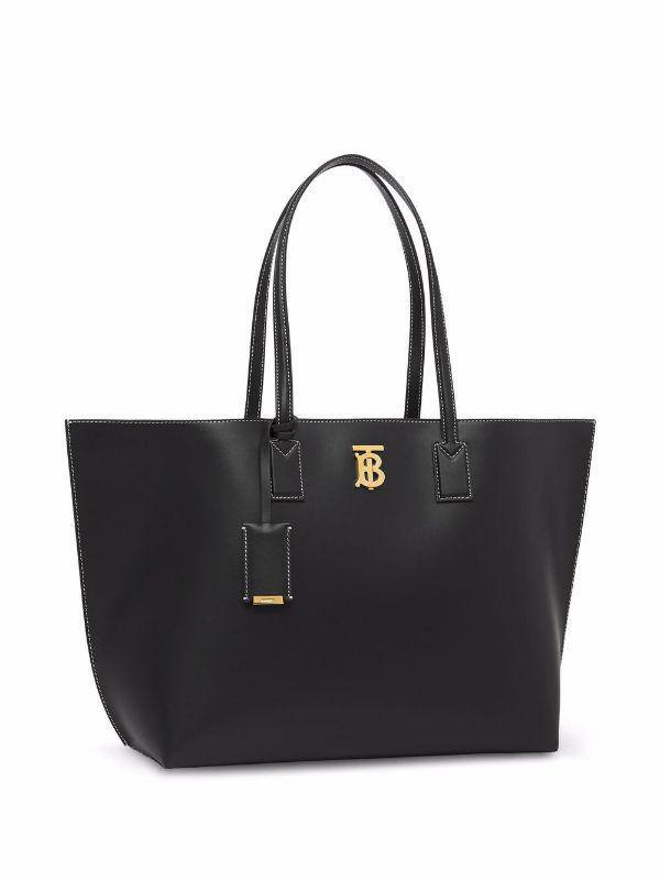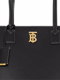 Black leather monogram leather tote bag from BURBERRY featuring signature TB monogram plaque, two long top handles, main compartment and charm detail.