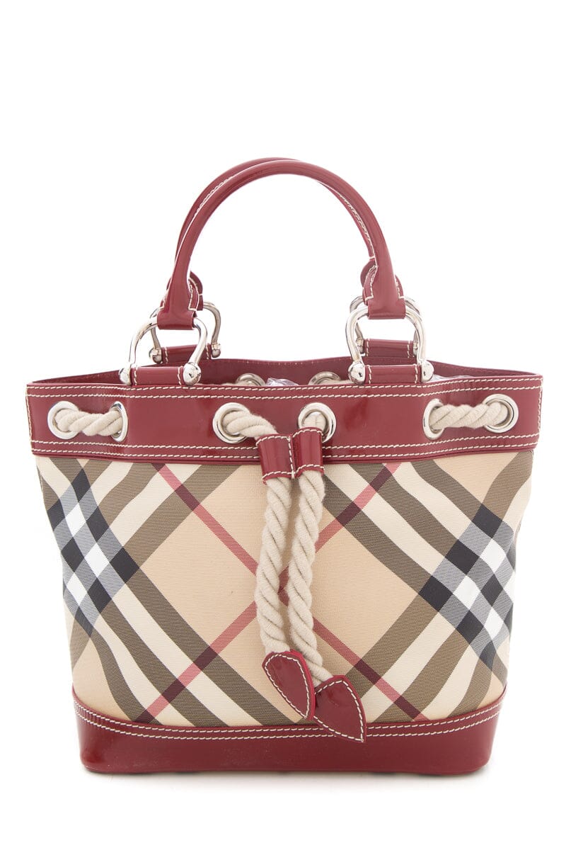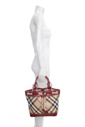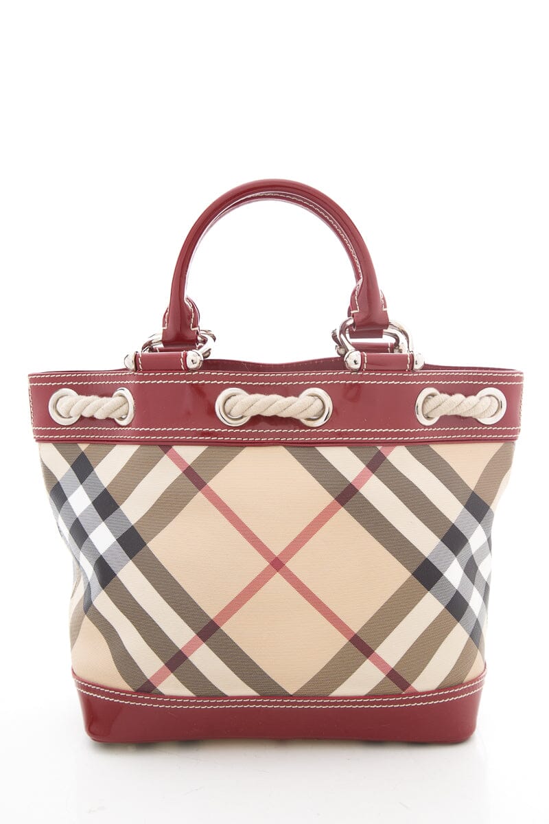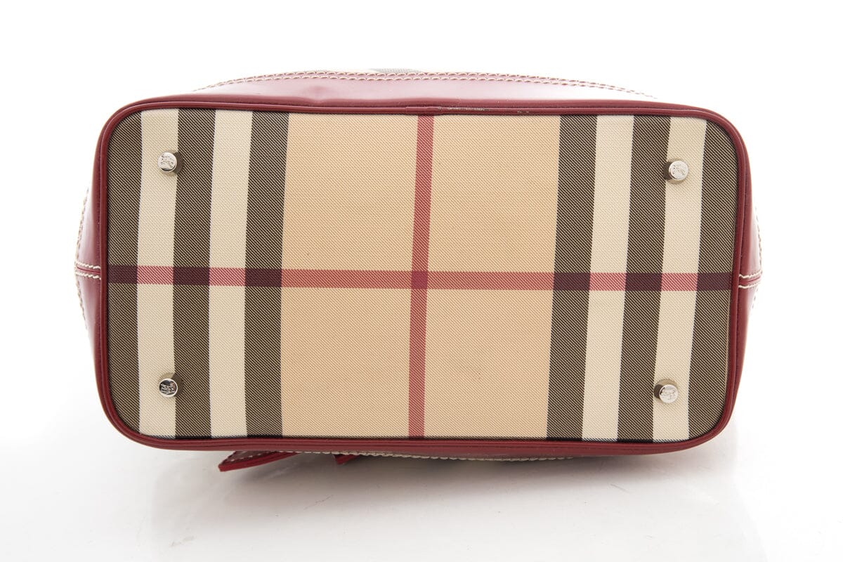 Burberry Red & Beige Nova Check Tote with Red Patent leather trim and braided detail. Featuring Silver tone HW and three interior pockets. This item is in good condition.
