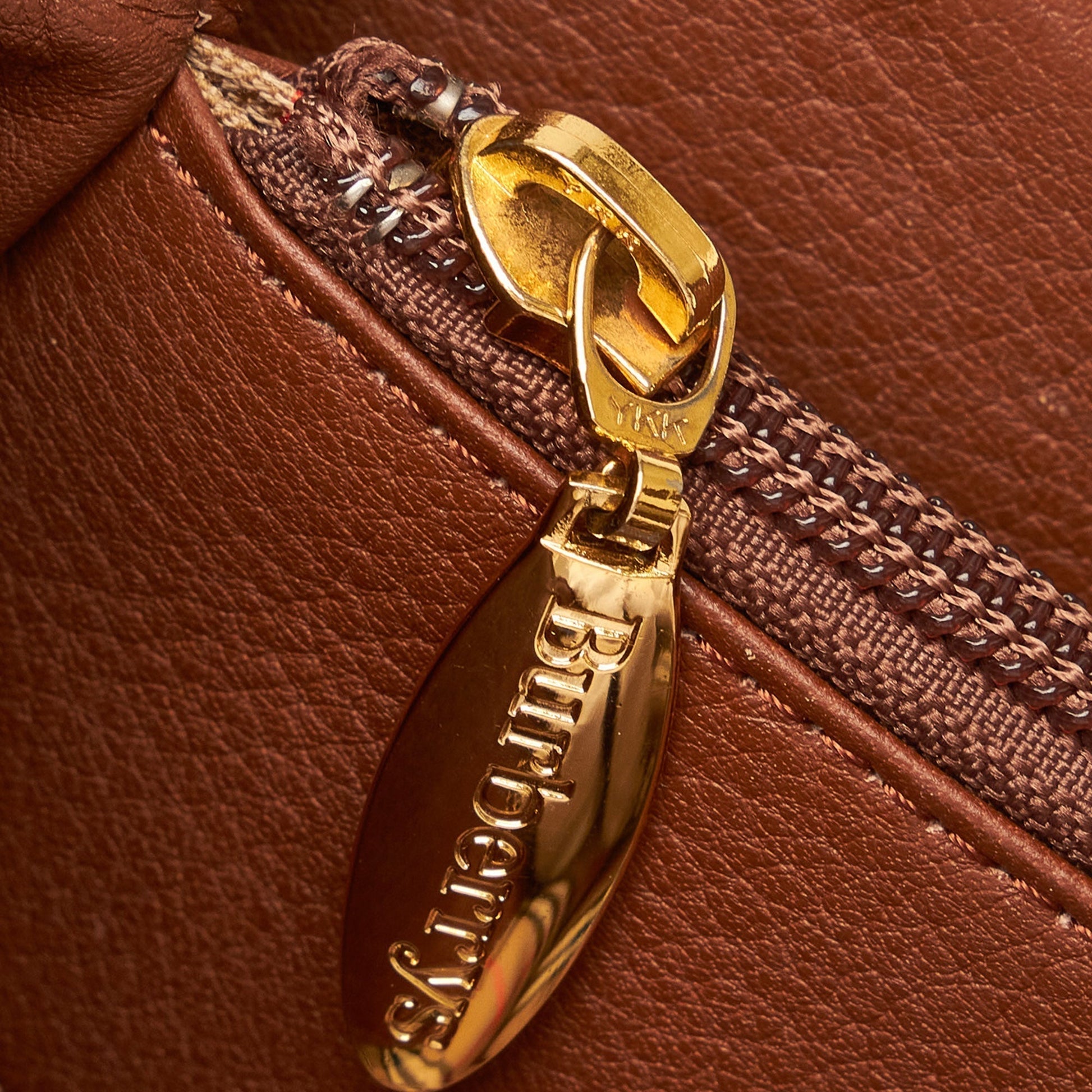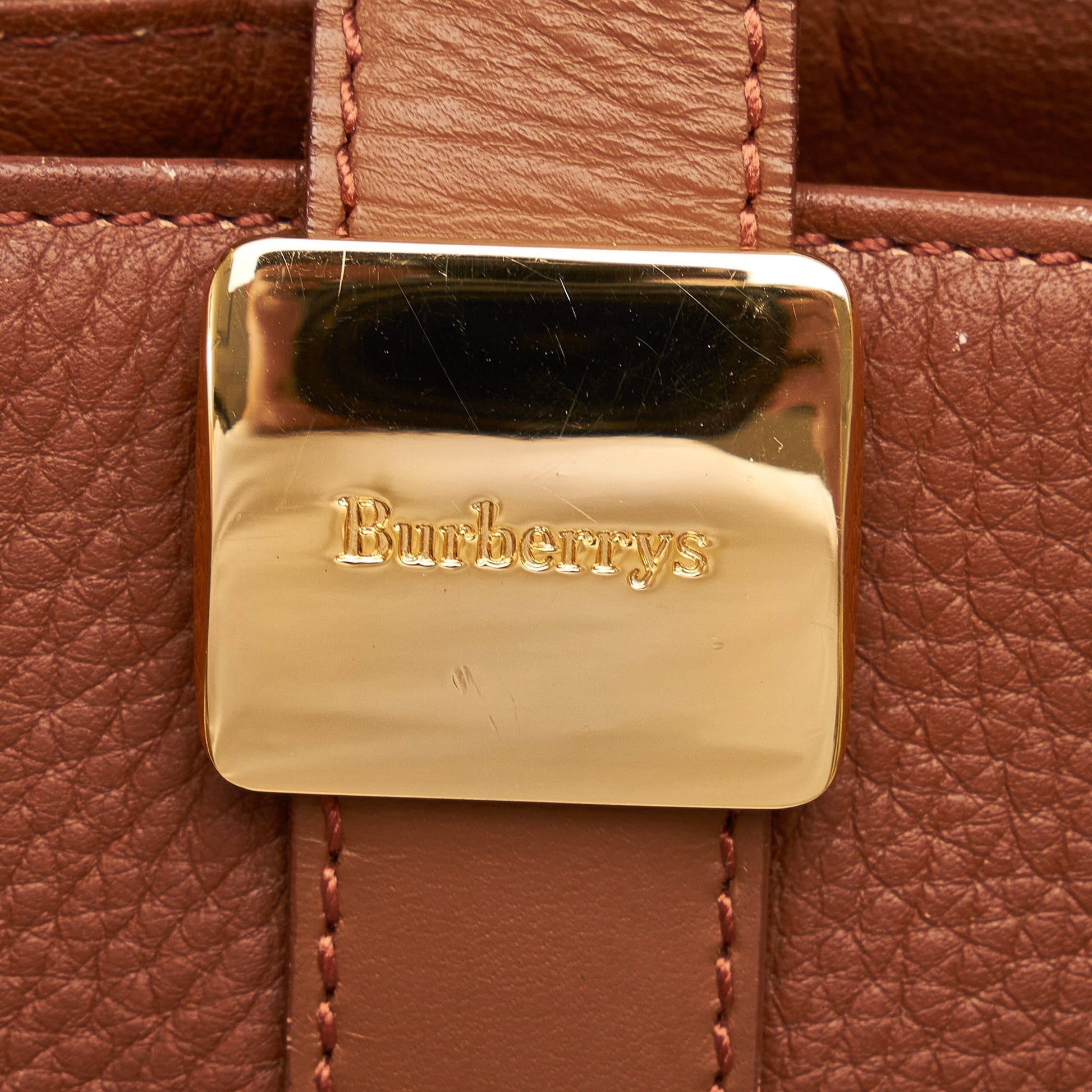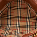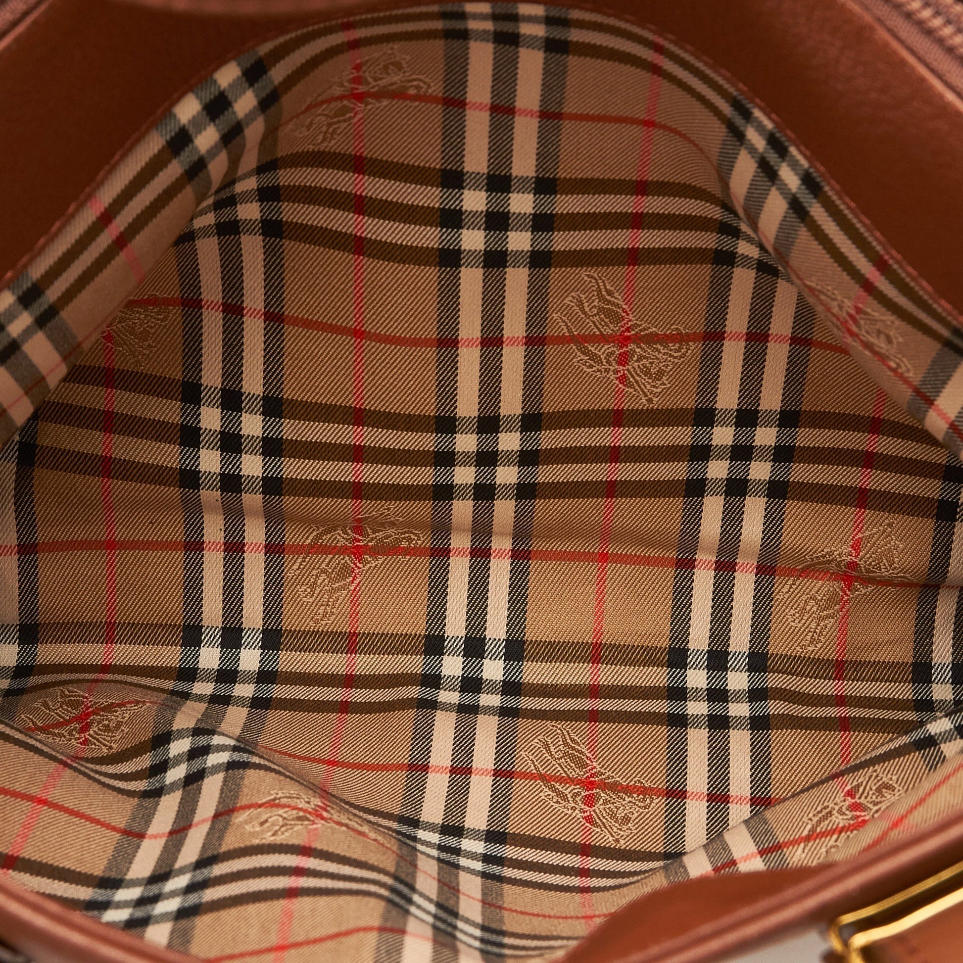 This beautiful Burberry Tote Bag is made of a dark brown leather body with gold-tone details and is comfortably over the shoulder with its two flat shoulder straps. Inside the Bag lined with the signature Haymarket check pattern and features a zippered pocket in the center.