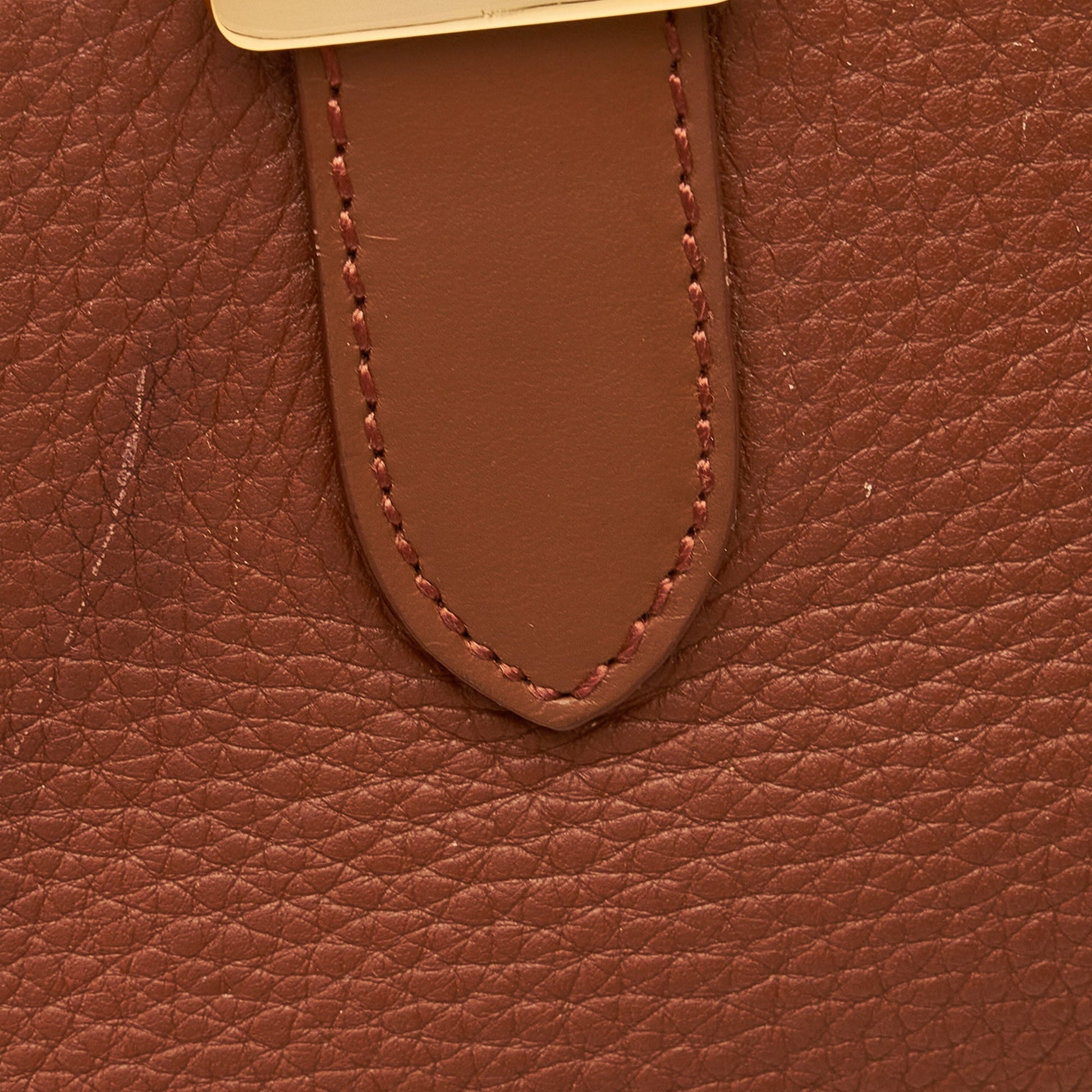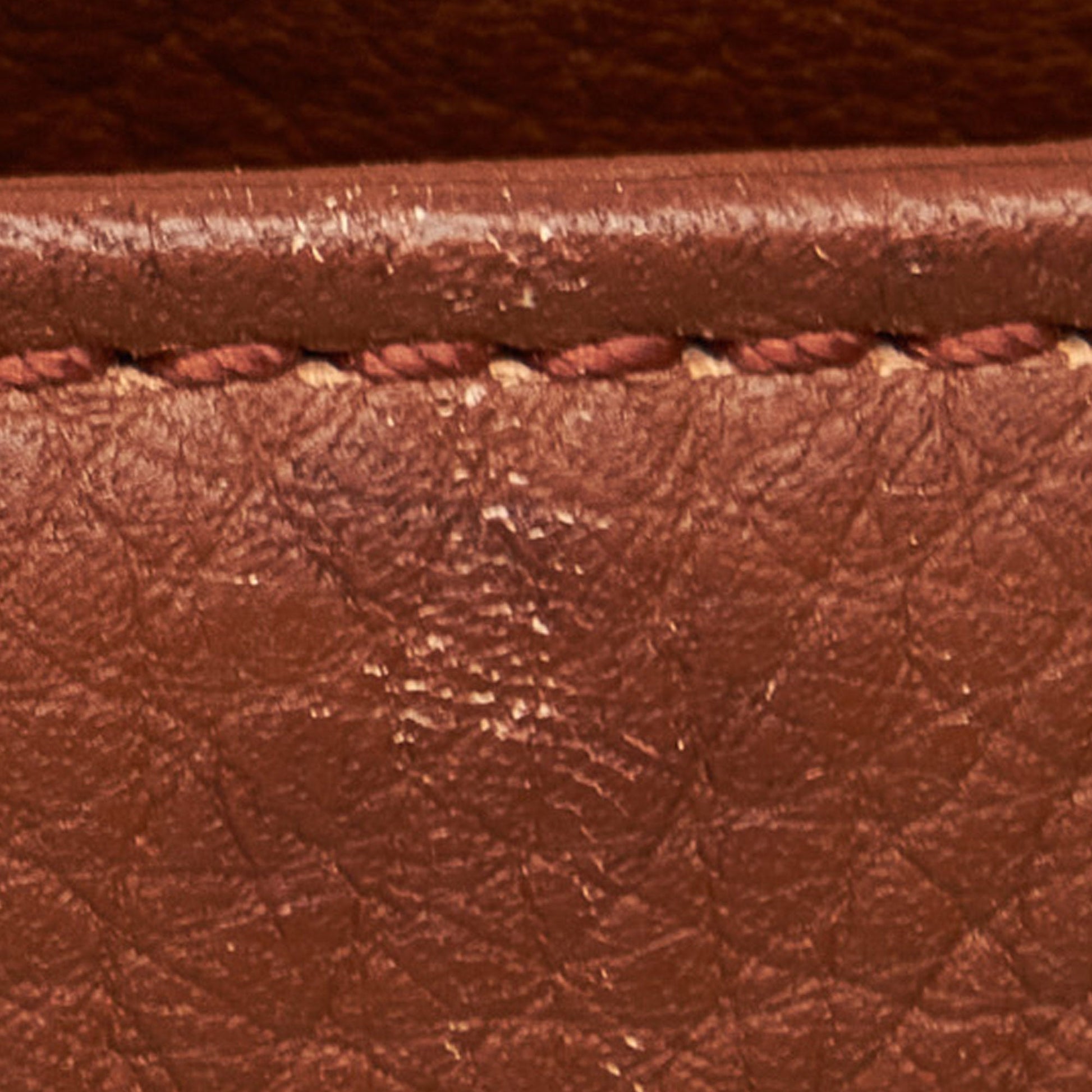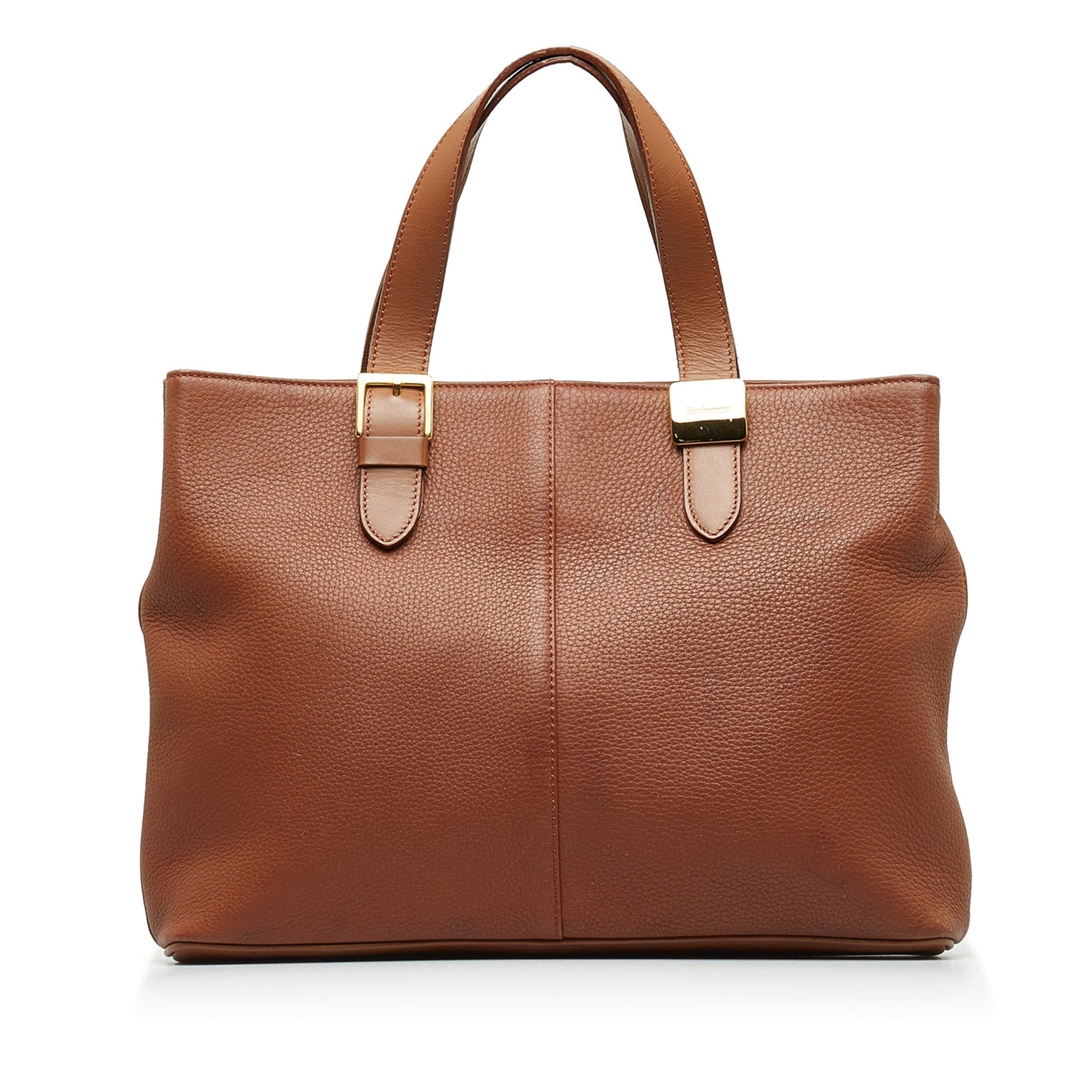 This beautiful Burberry Tote Bag is made of a dark brown leather body with gold-tone details and is comfortably over the shoulder with its two flat shoulder straps. Inside the Bag lined with the signature Haymarket check pattern and features a zippered pocket in the center.
