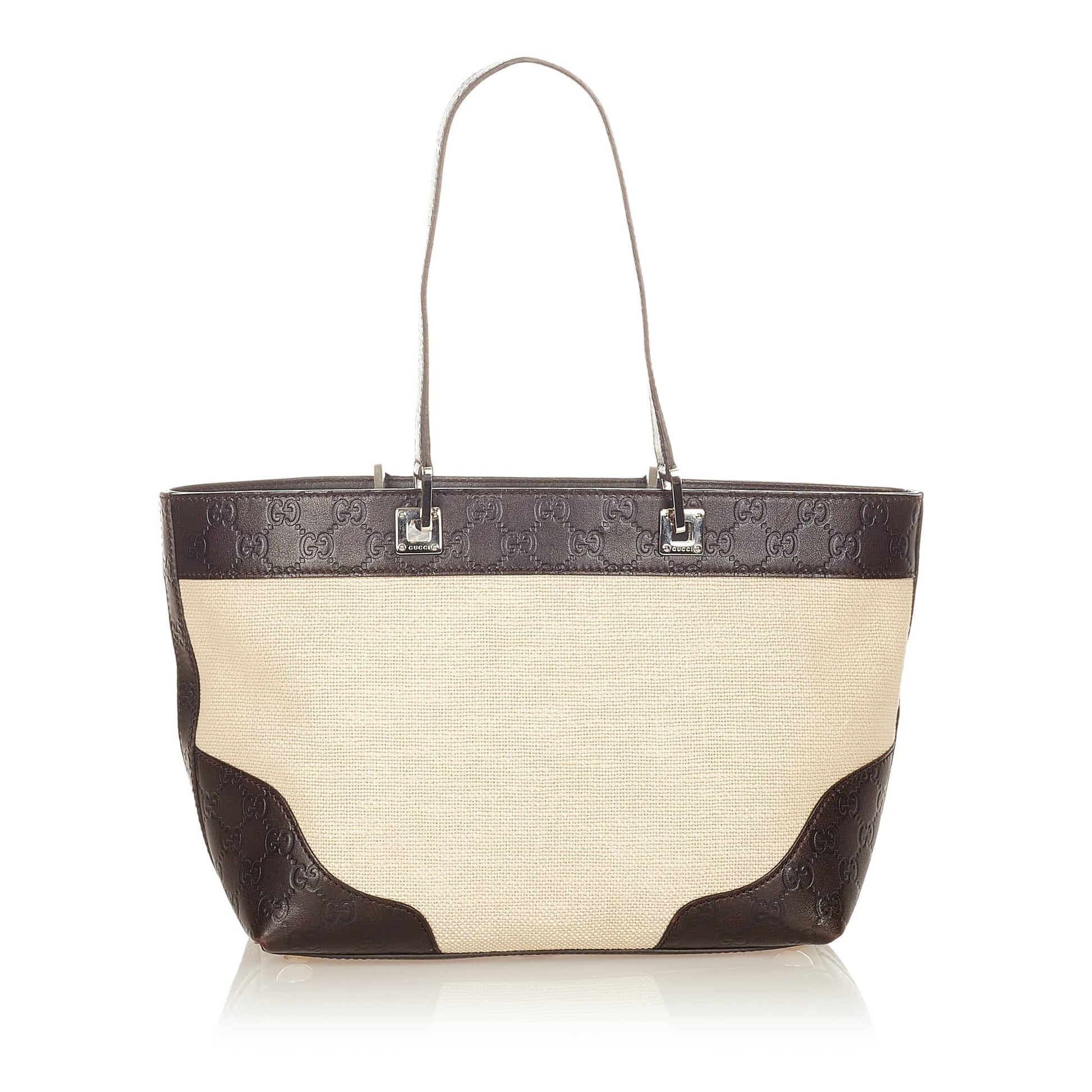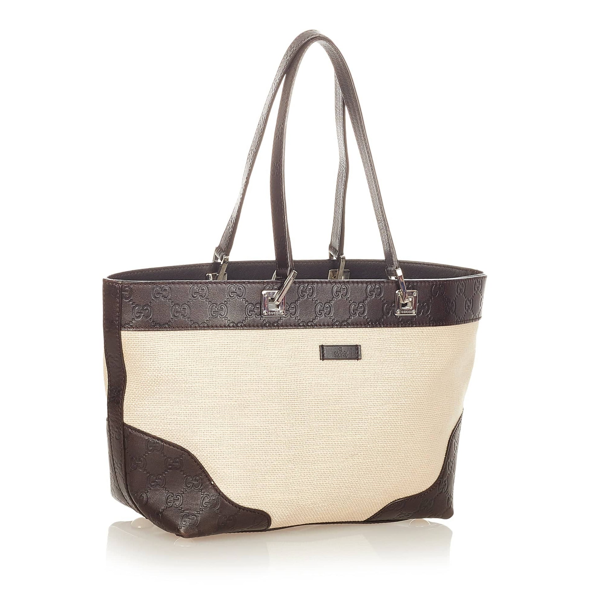 This Gucci Tote BAG was made of light brown canvas and has brown leather caps, which shows Gucci's Guccissima pattern in the form of a embossing. The image of silver details and flat, leather shoulder straps is completed. You can get access to the interior of the Bag. Here has the Bag Via a zipper compartment and plug -in compartments on the opposite side. the Bag is preferably led to the shoulder.