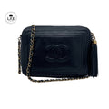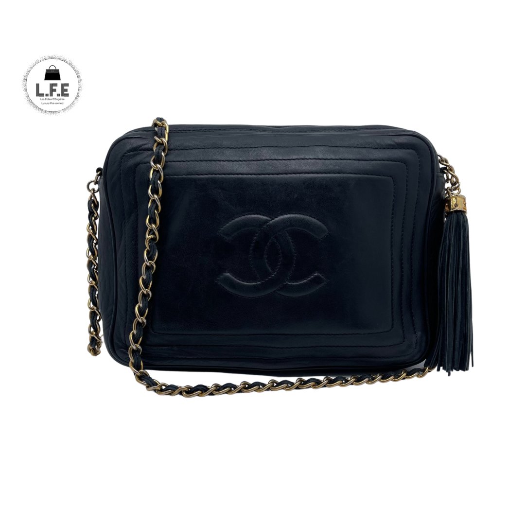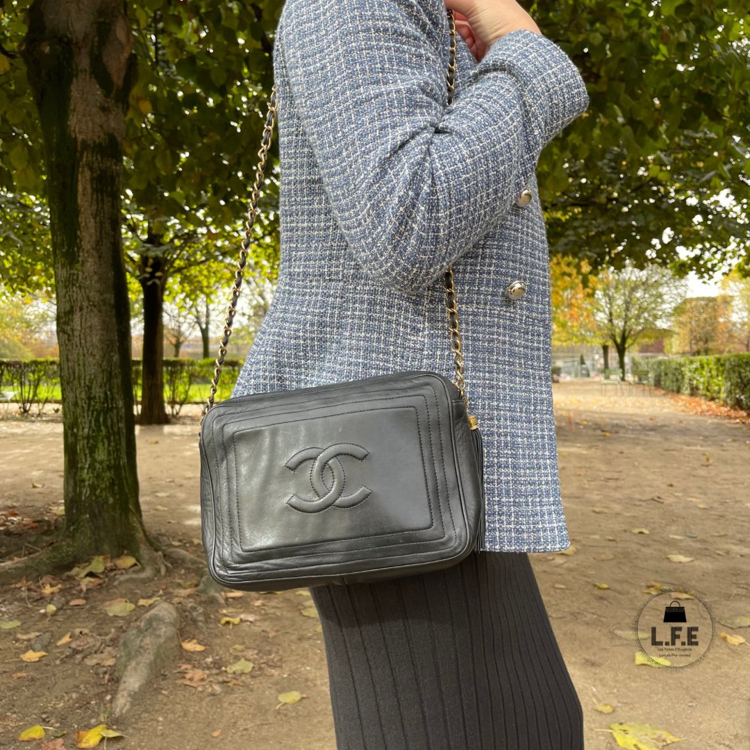 Sac à bandoulière Chanel collection Camera. Un classique, en cuir d'agneau noir et aux finitions dorées. Le produit est en bon état.