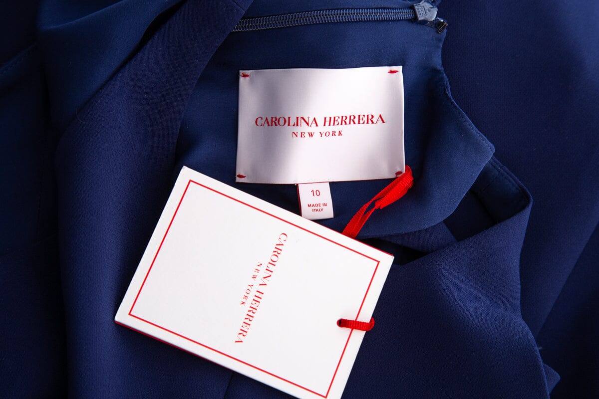 Carolina Herrera Navy Sleeveless Dress with Floral Pleats. This item is new with tags.