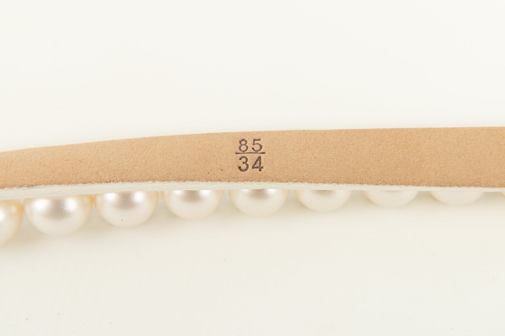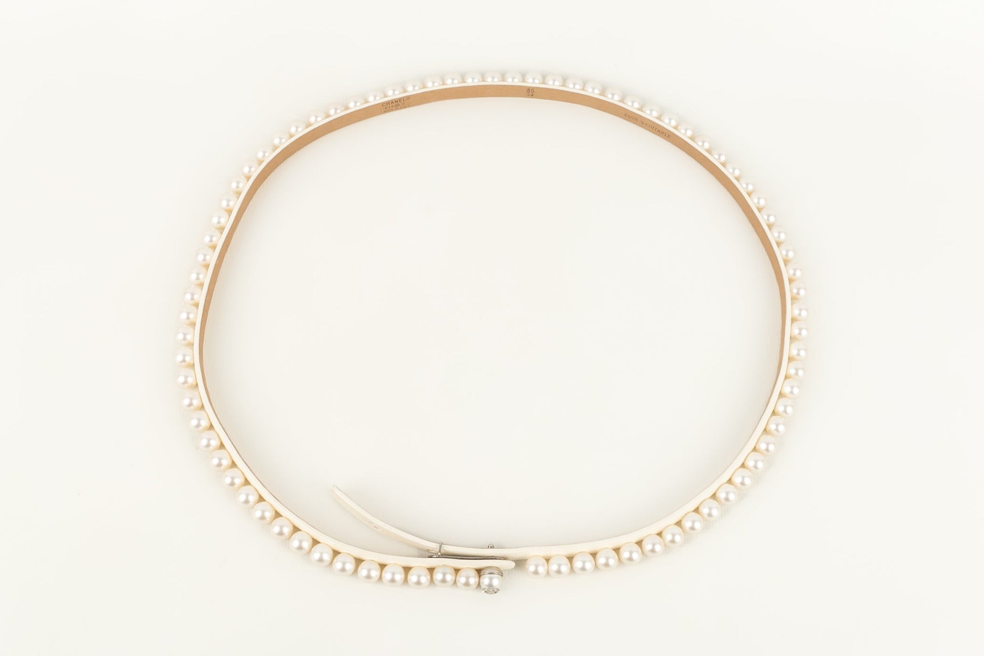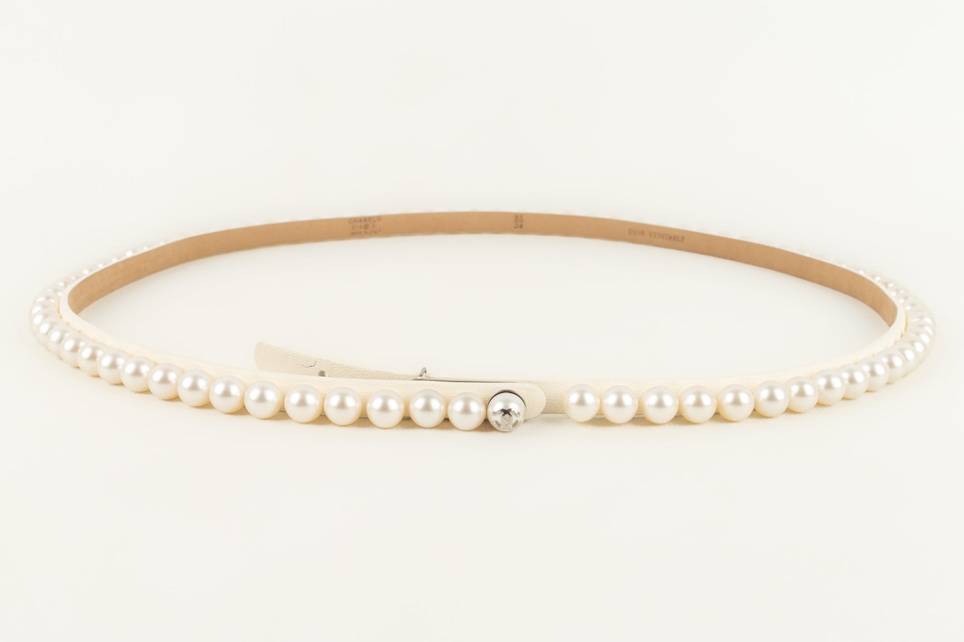 CHANEL - (Made in Italy) Ceinture en cuir et perles nacr�es fantaisies. CollectioN 2014. Taille indiqu�e 85/34.