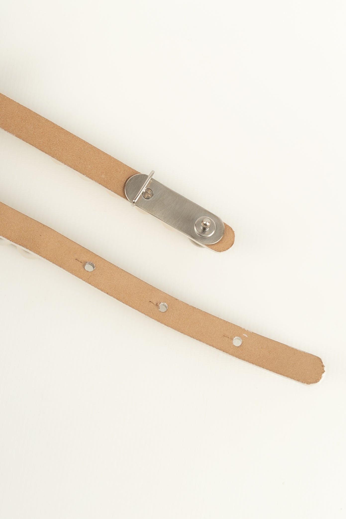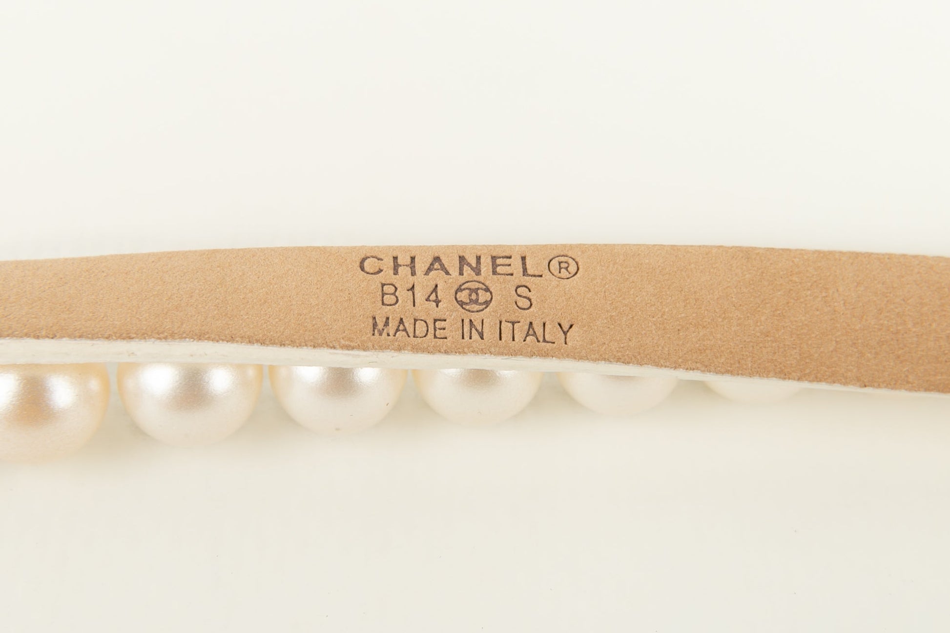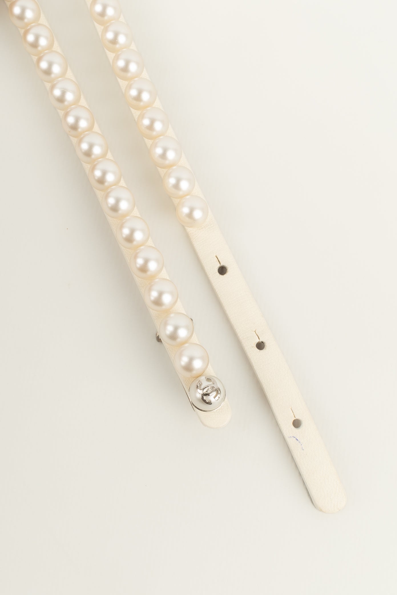 CHANEL - (Made in Italy) Ceinture en cuir et perles nacr�es fantaisies. CollectioN 2014. Taille indiqu�e 85/34.