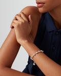 Luminous metal spheres that make for a modern take on a beaded bracelet. This design includes three non-removable extender rings, making it easy to wear at three different lengths. Finished in high-polish silver.
