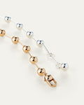 Luminous spheres are paced out between elongated silver and gold beads. This design includes two non-removable extender rings, making it easy to wear at two different lengths. Finished in high-polish gold and silver.