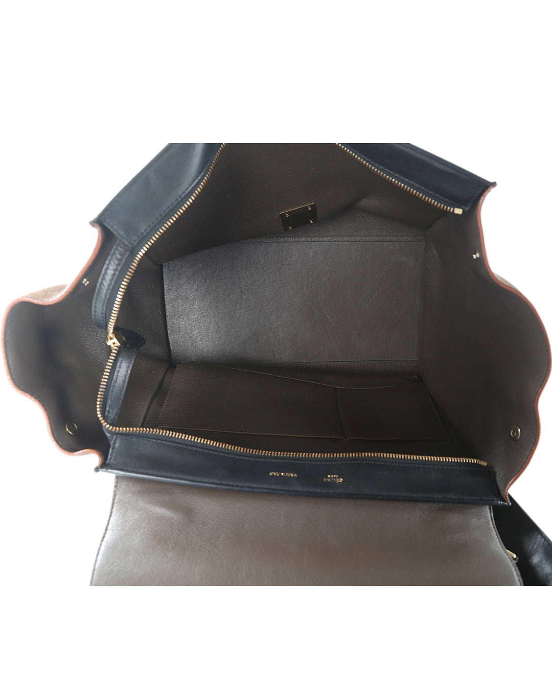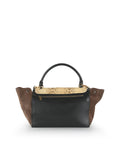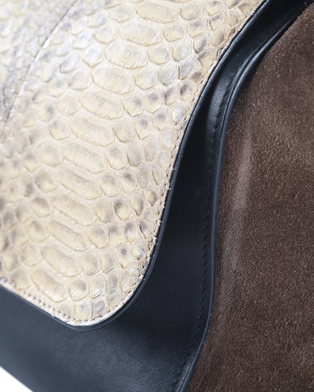 This Celine bag is crafted from smooth black leather body, beige python flap, and brown suede wings.