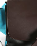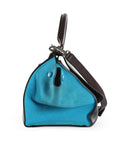 It features a single leather rolled handle, detachable shoulder strap, back zipped pocket, snap buttons at the sides, flap top with a flip-turn lock closure, top zipper which opens to a black and blue leather lined interior compartment with two slip pockets, and silver tone hardware.