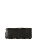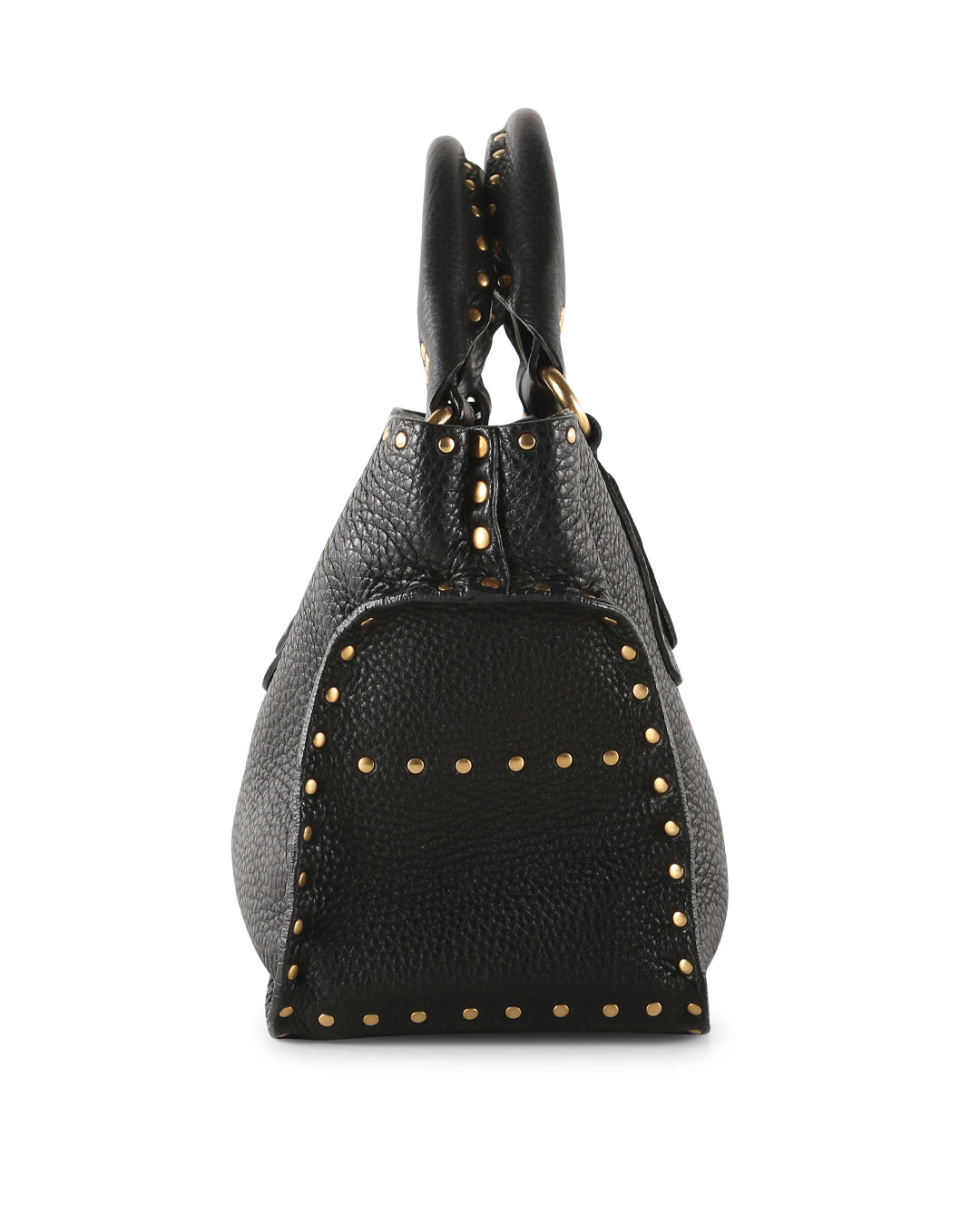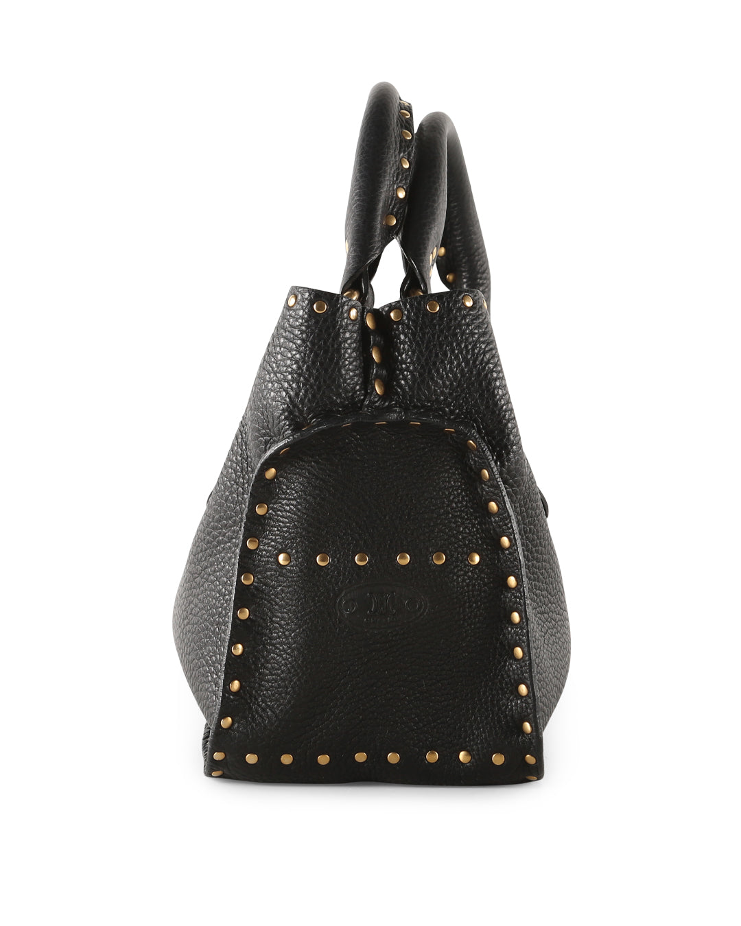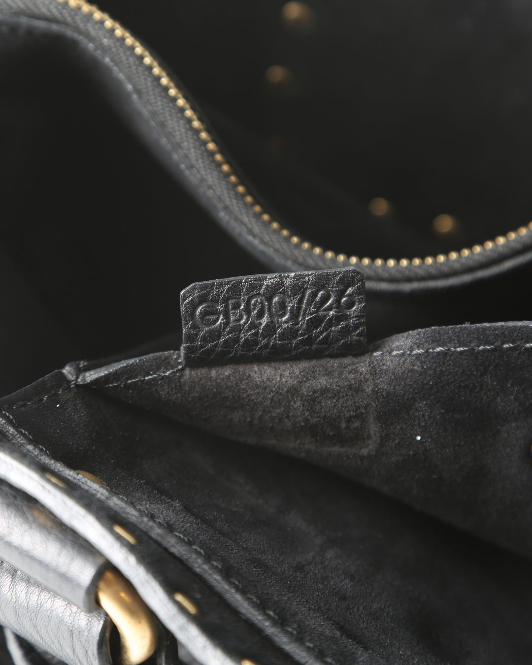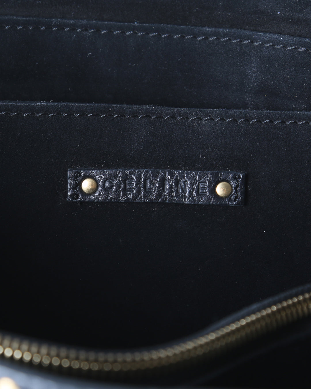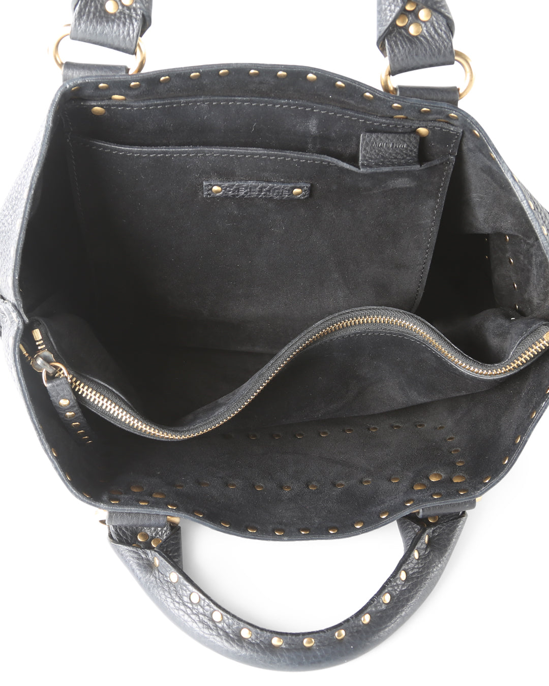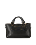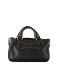 It features double leather handles, open unlined black interior with a slip pocket and one middle zipped compartment, and gold tone hardware.