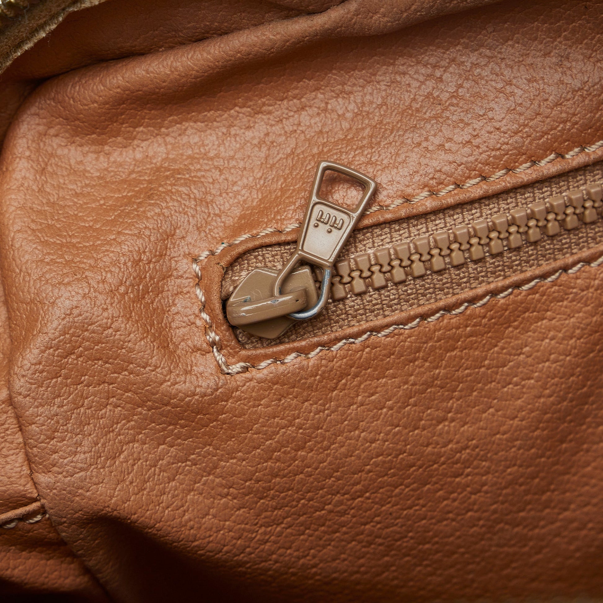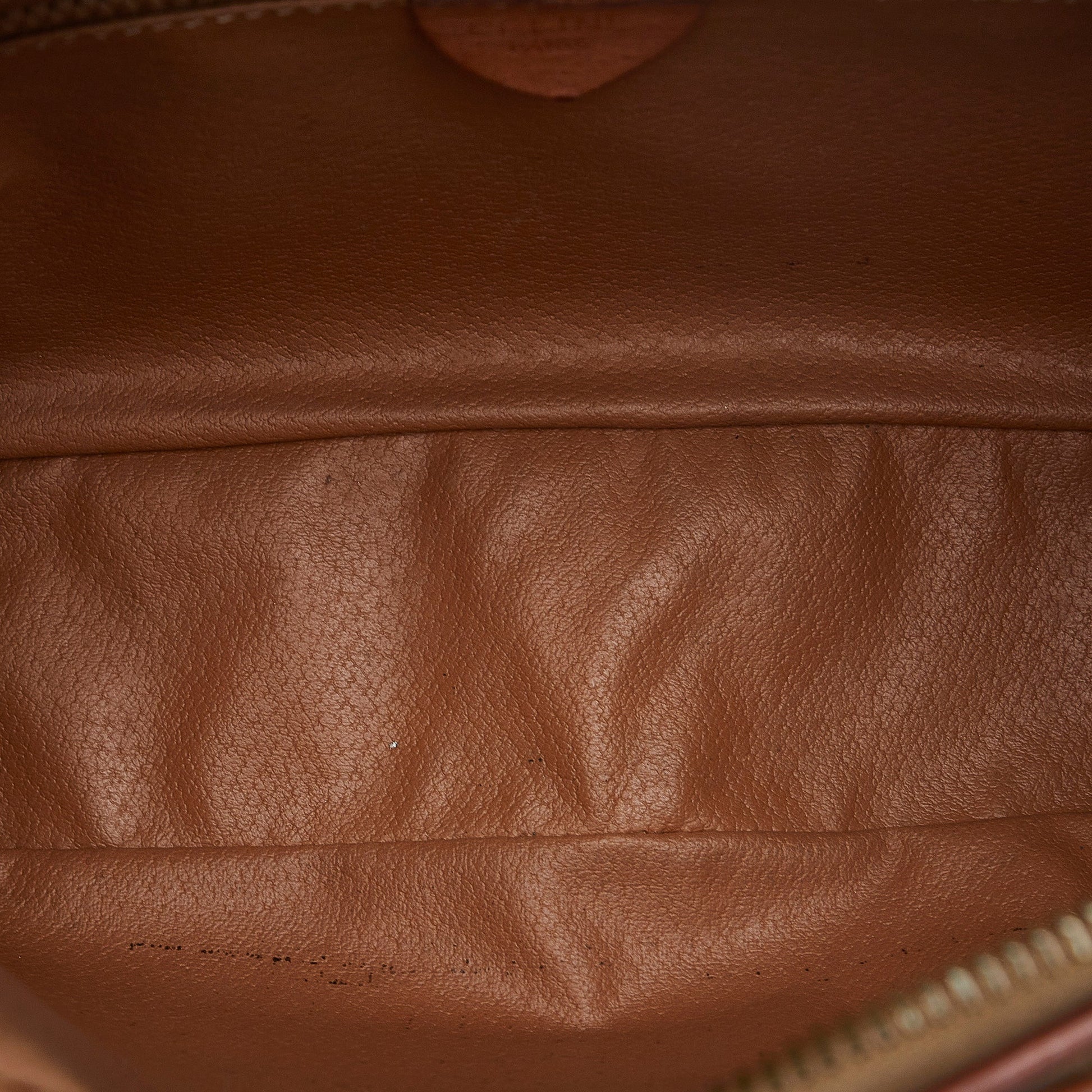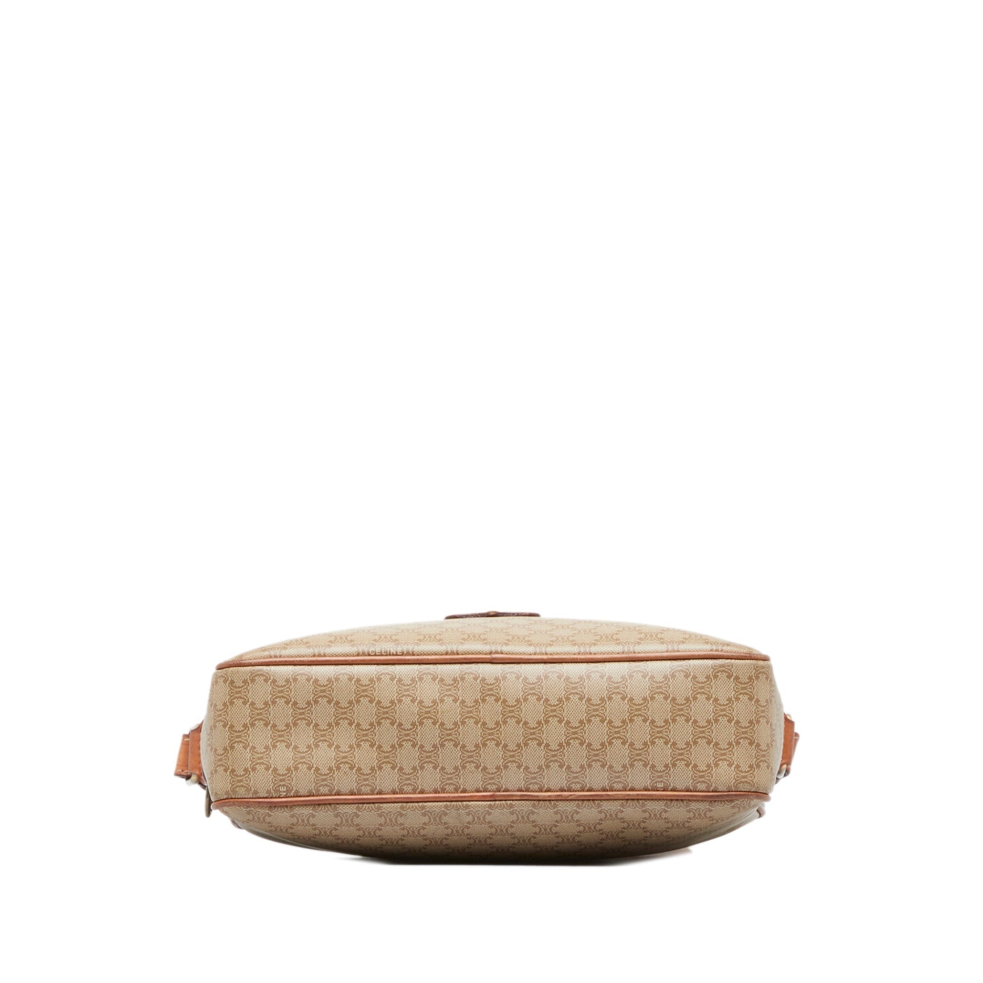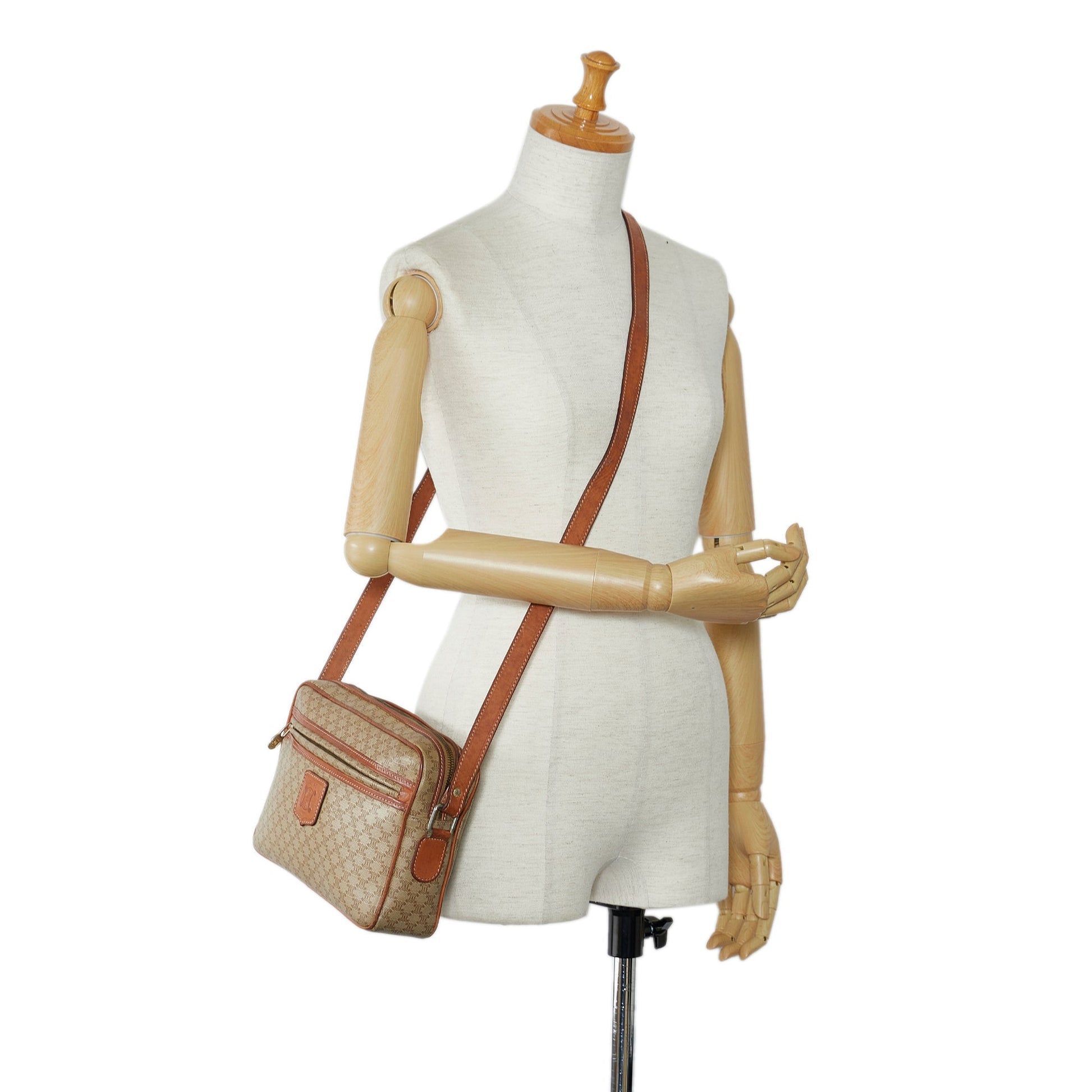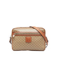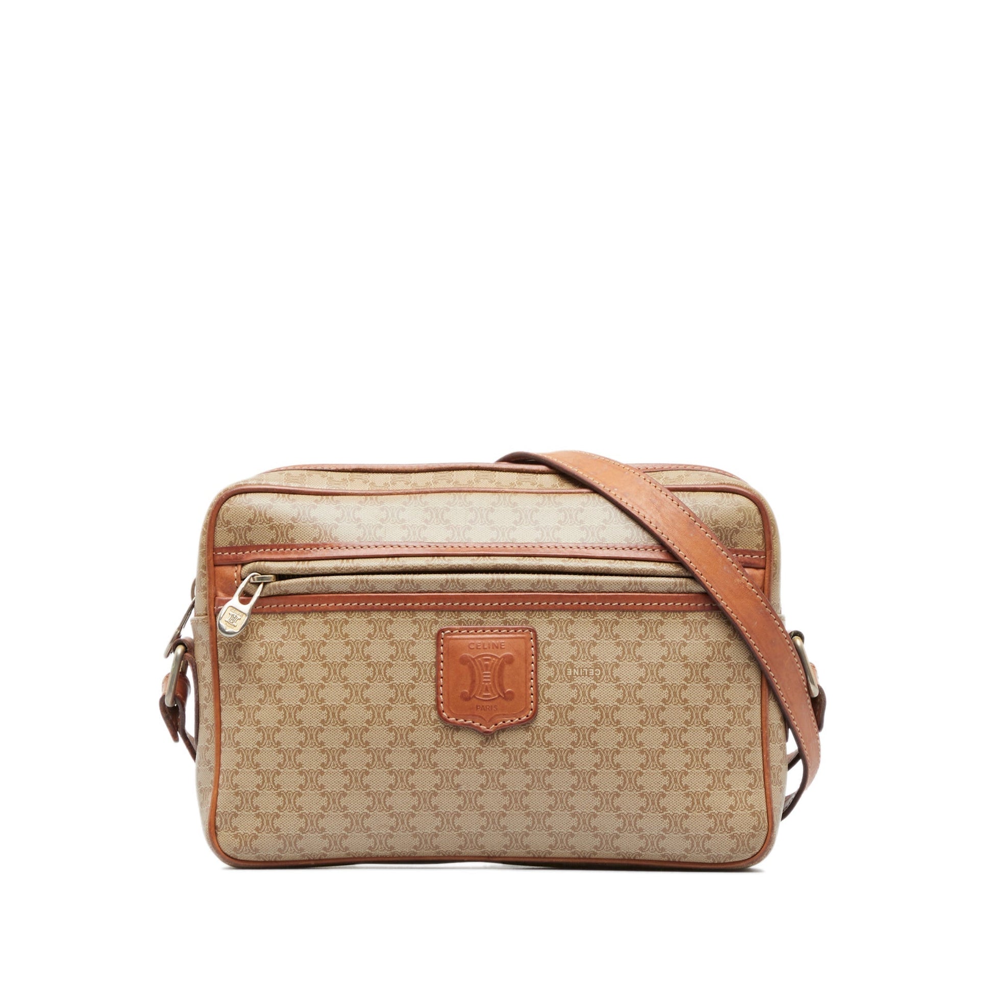This crossbody bag features a coated canvas body, an adjustable flat leather shoulder strap, a top zip closure, an exterior front zip pocket, and an interior zip pocket.
