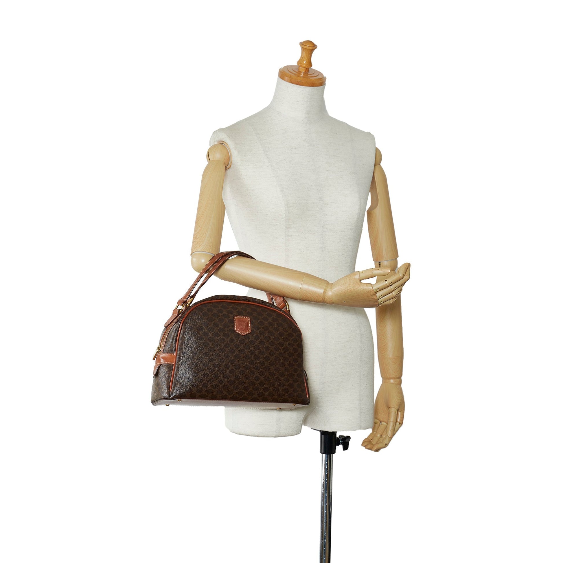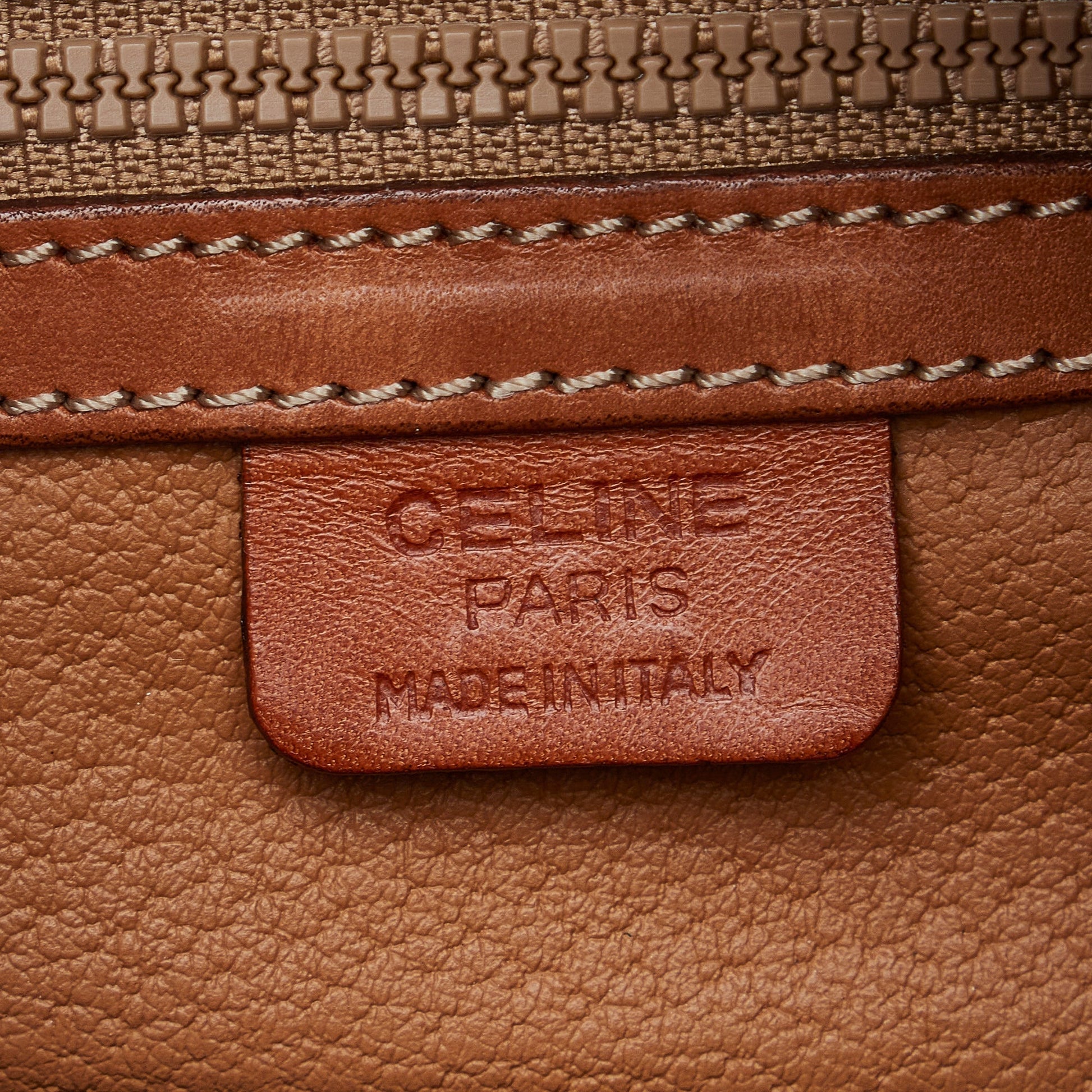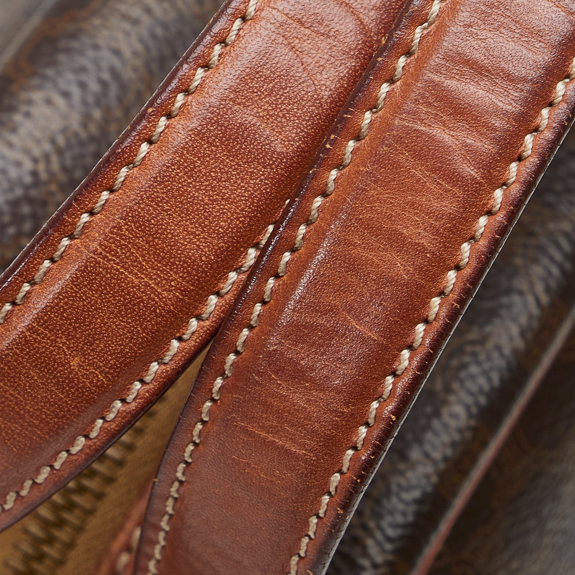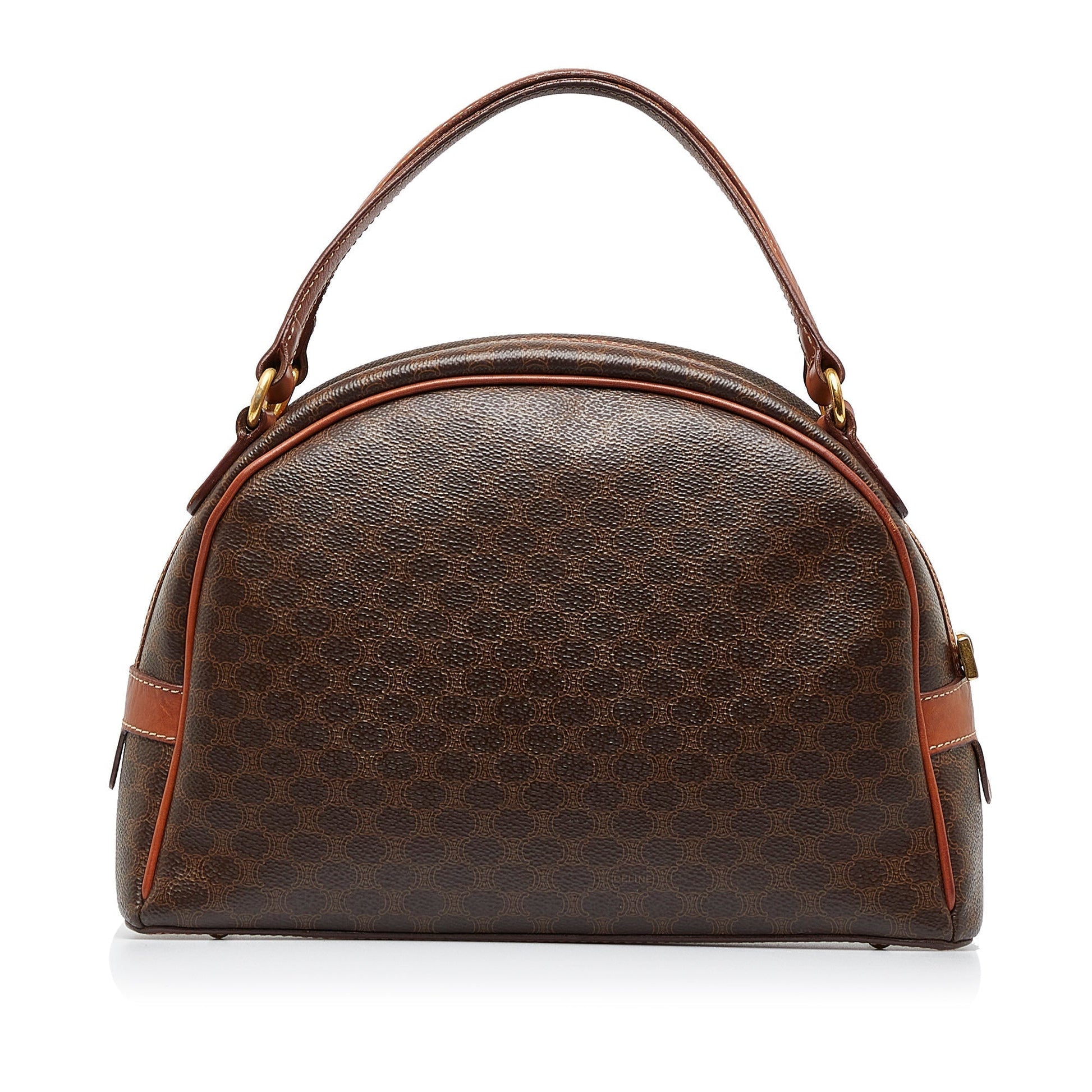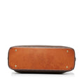 This handbag features a coated canvas body with leather trim, flat leather handles, a top zip closure, and an interior zip pocket.