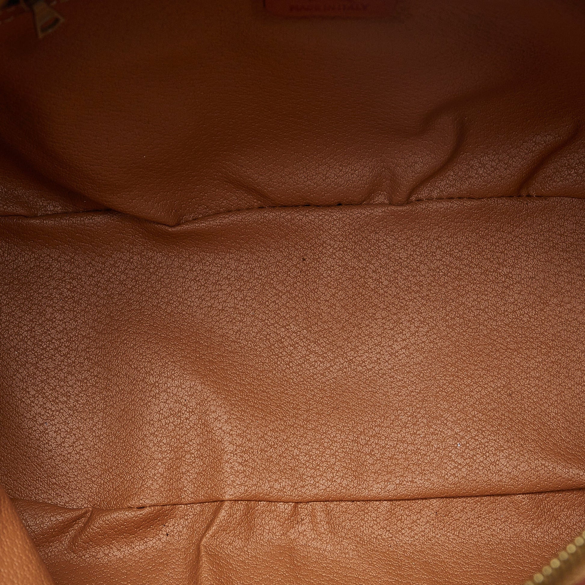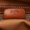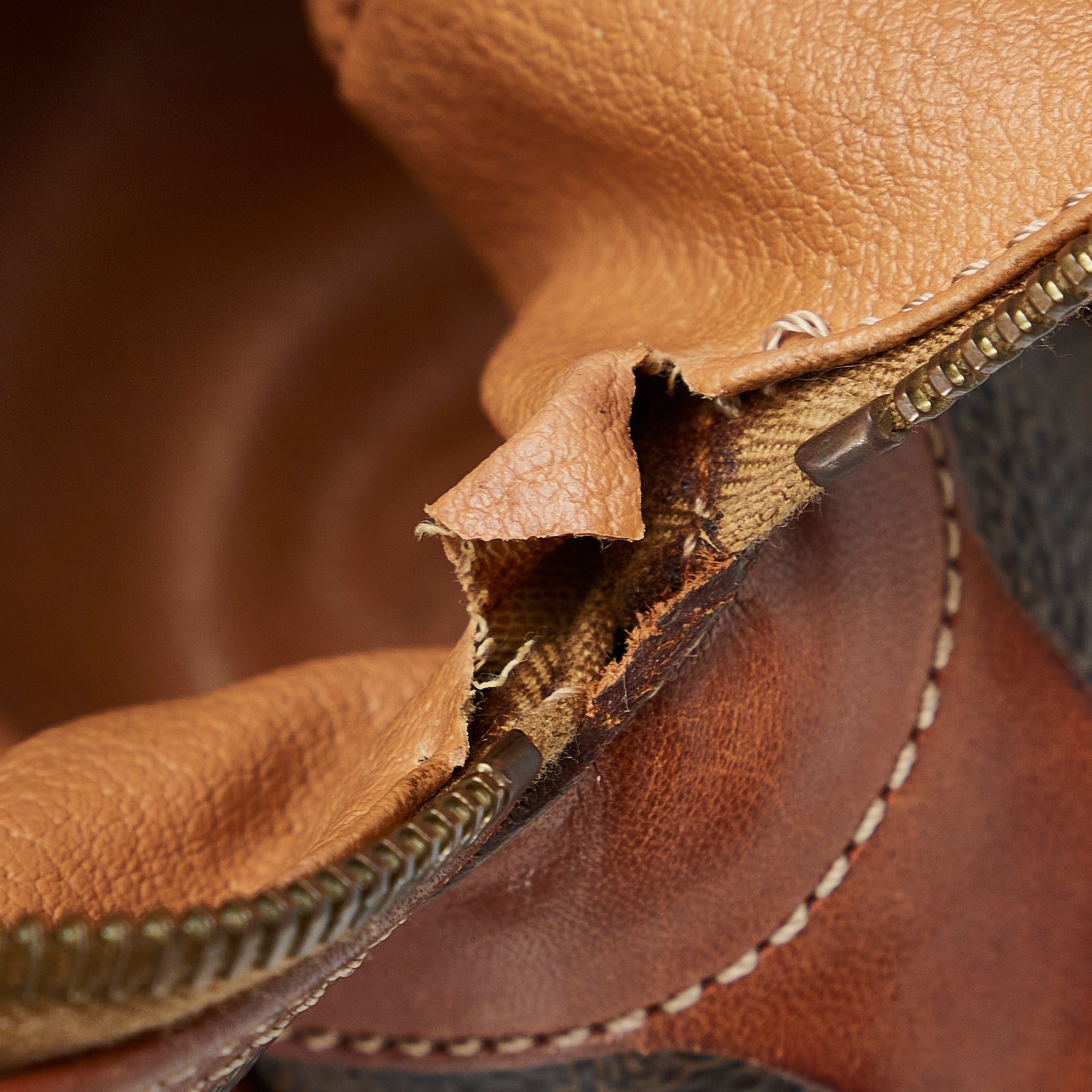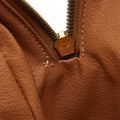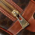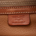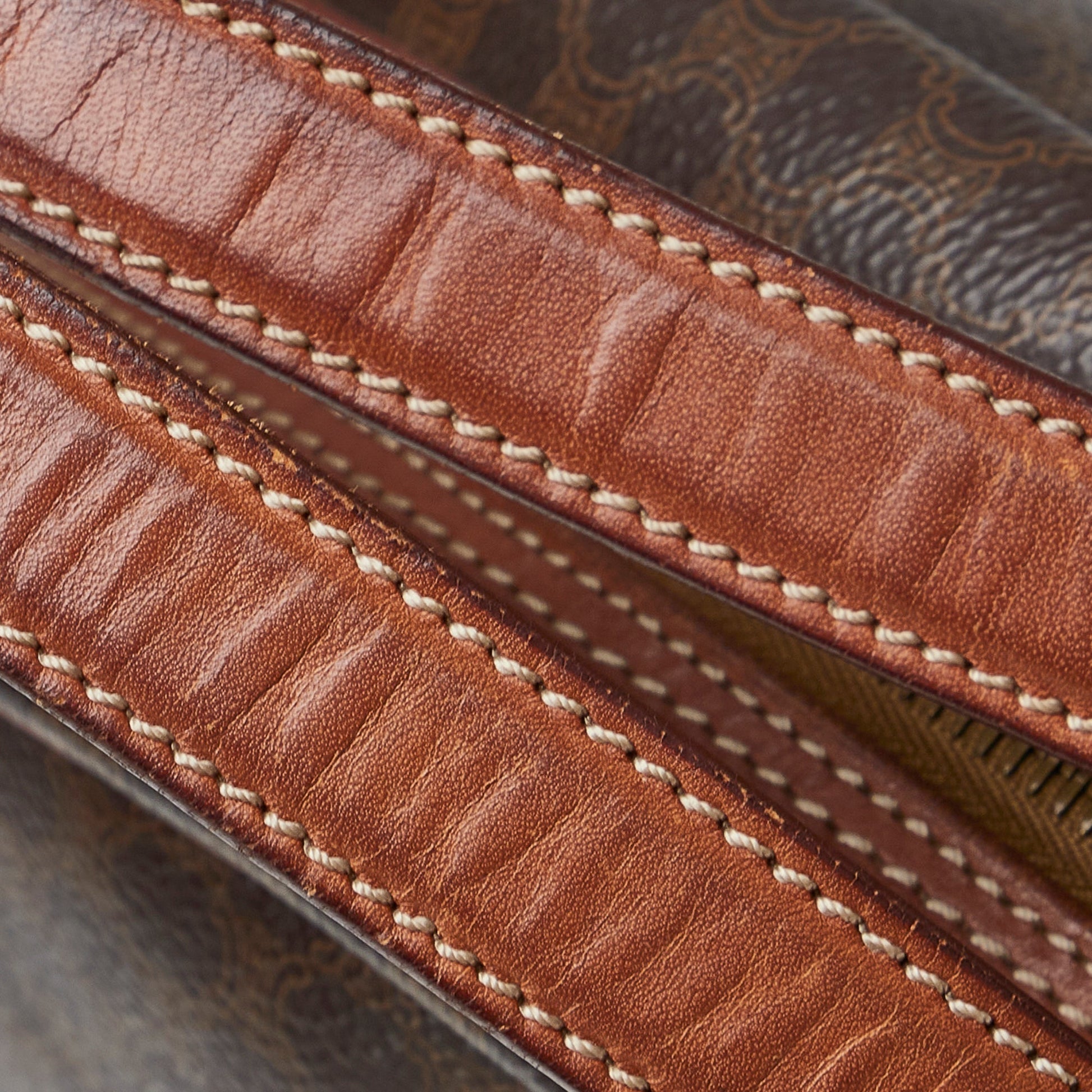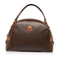 This handbag features a coated canvas body with leather trim, flat leather handles, a top zip closure, and an interior zip pocket.