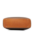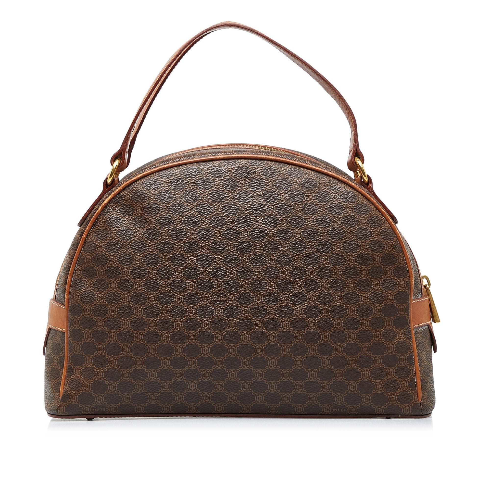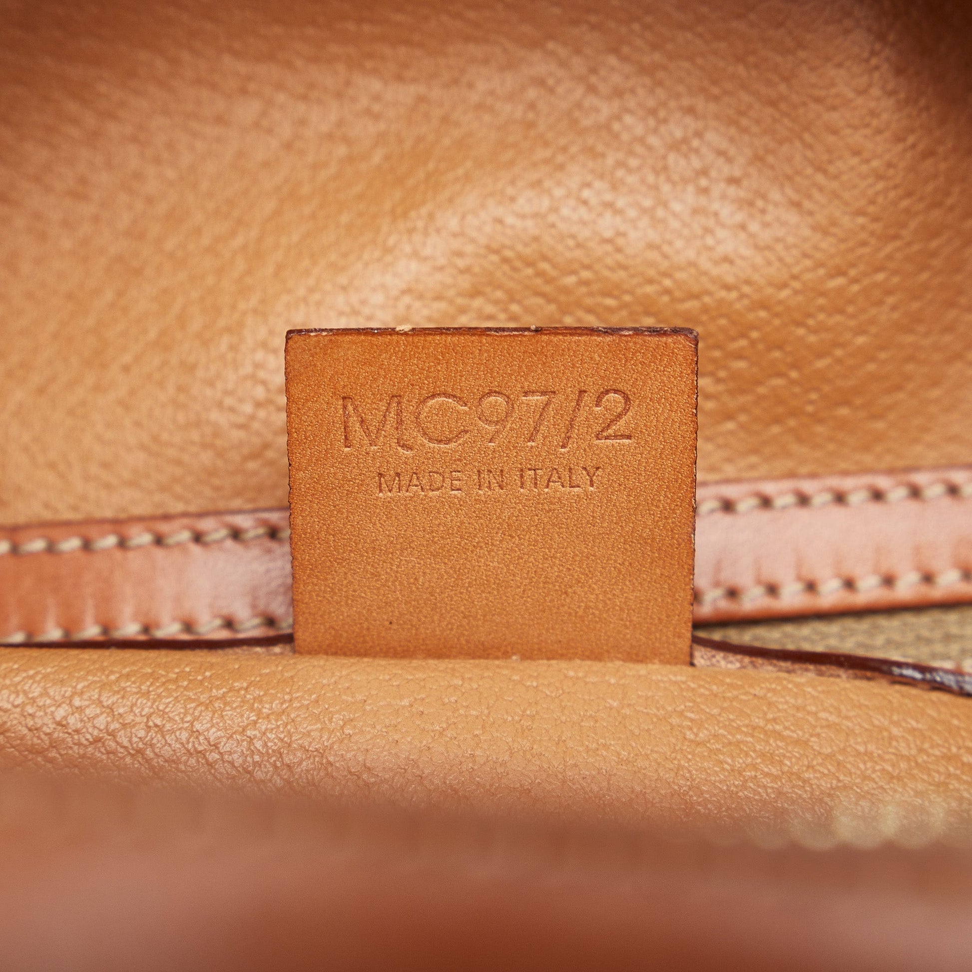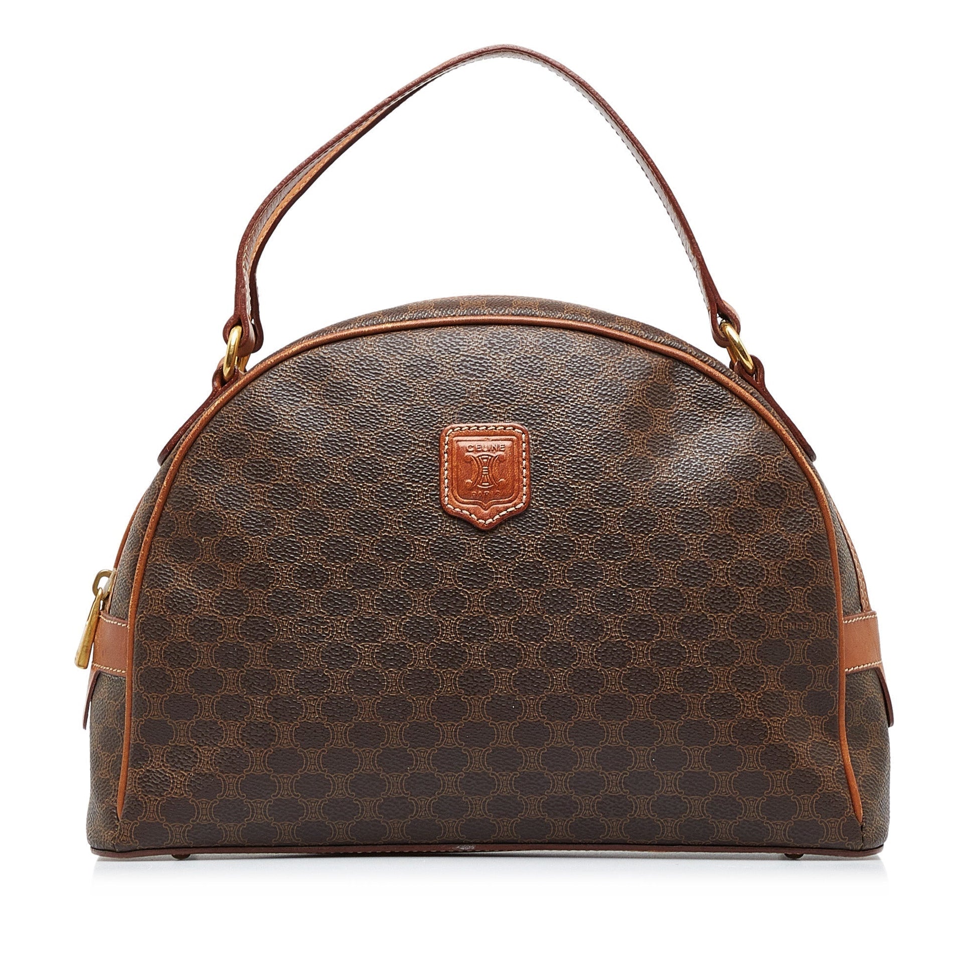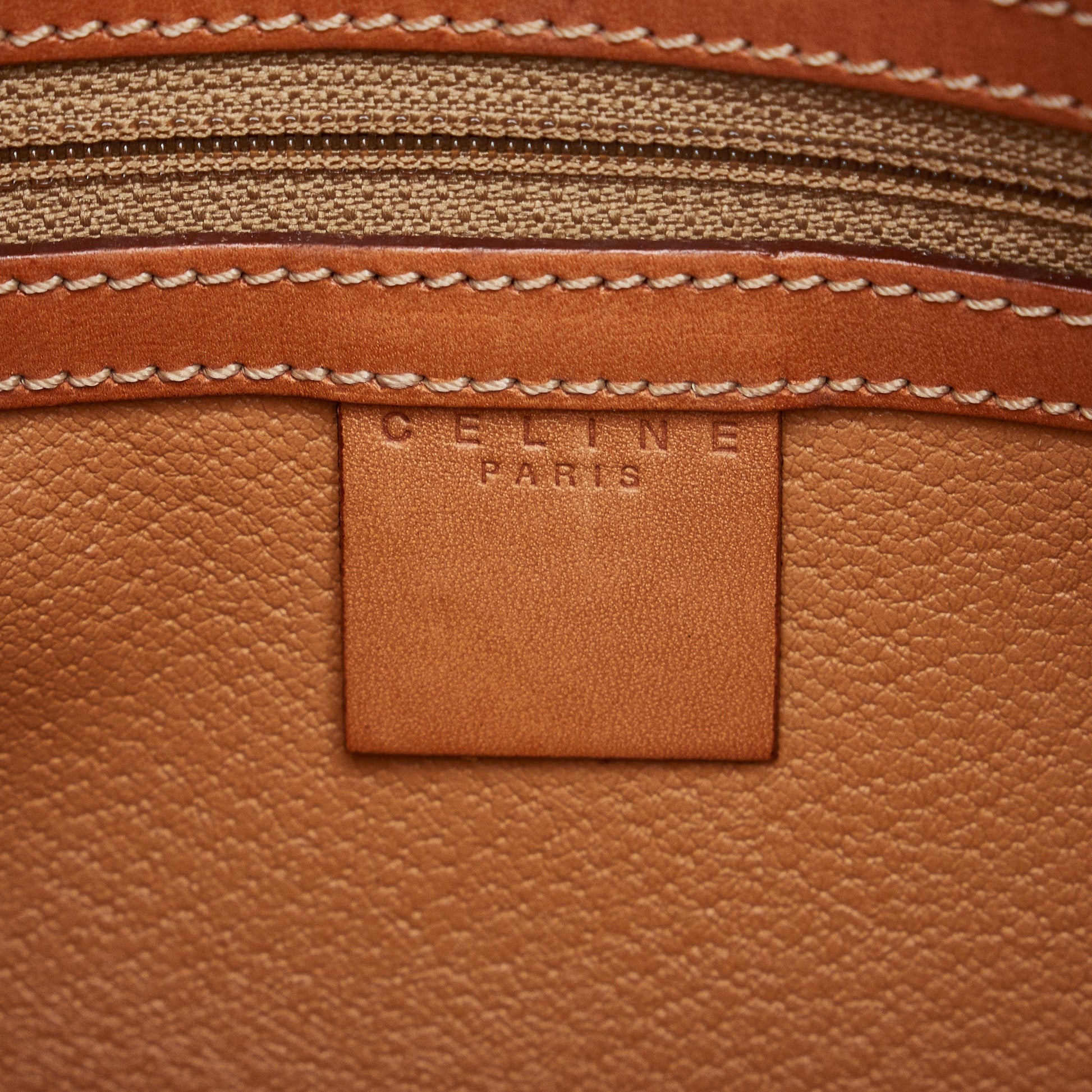 This handbag features a coated canvas body, flat leather handles, a top zip closure, and an interior zip pocket.