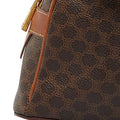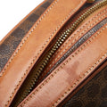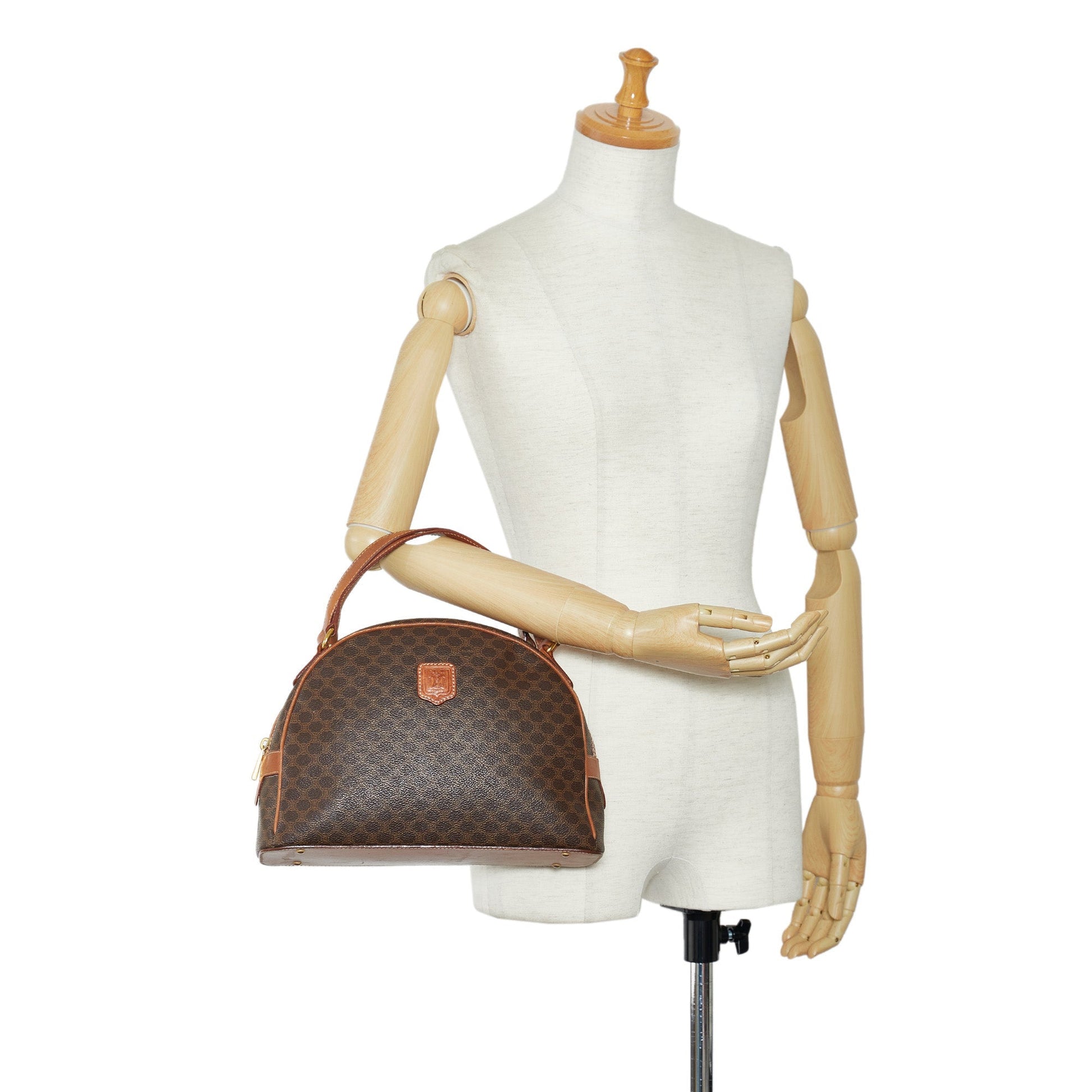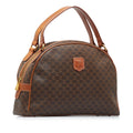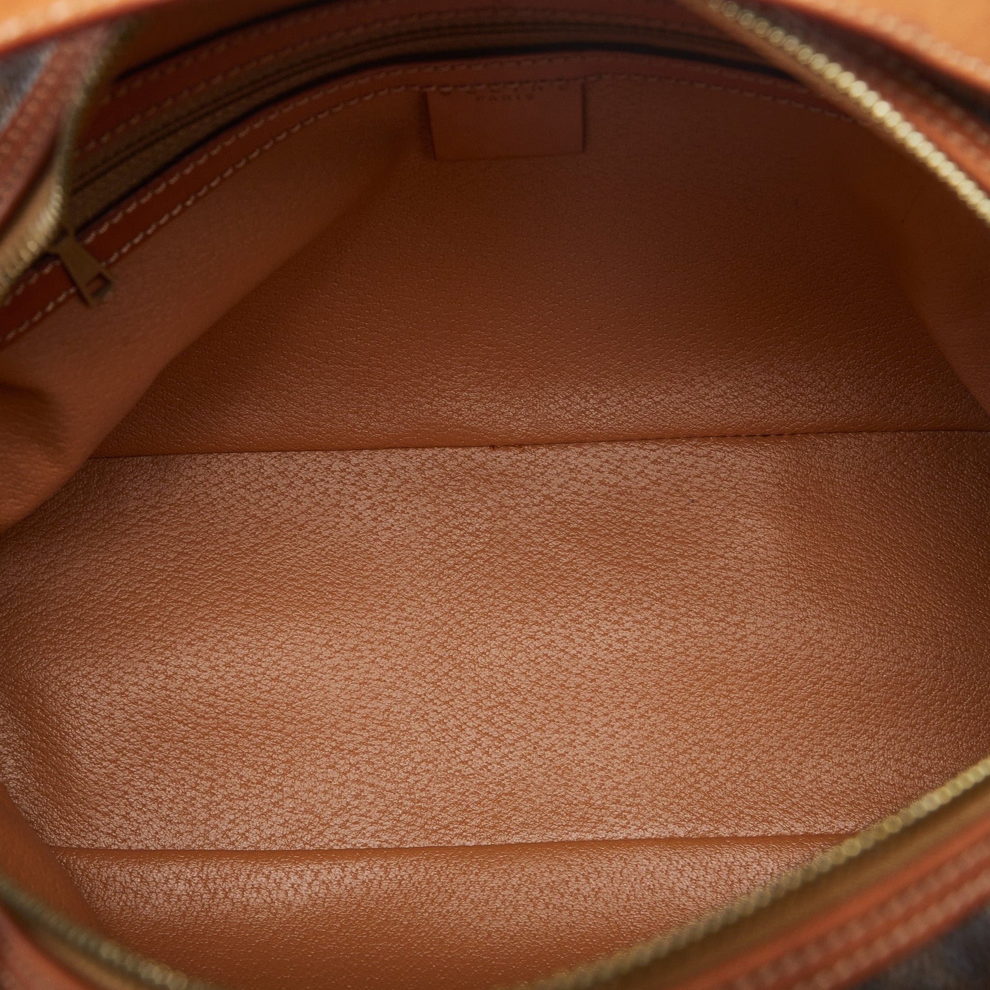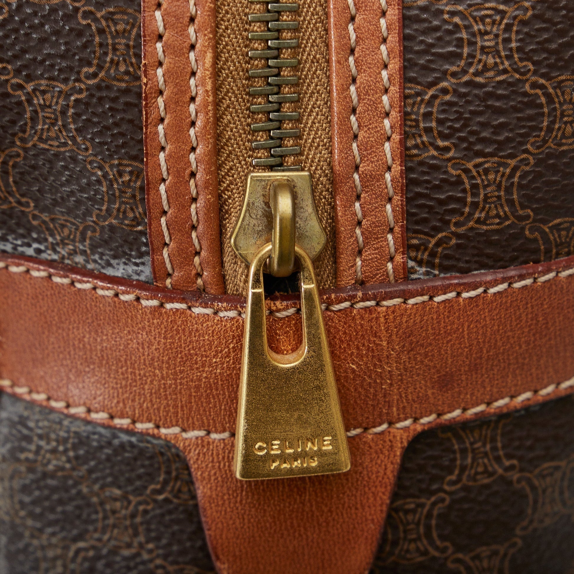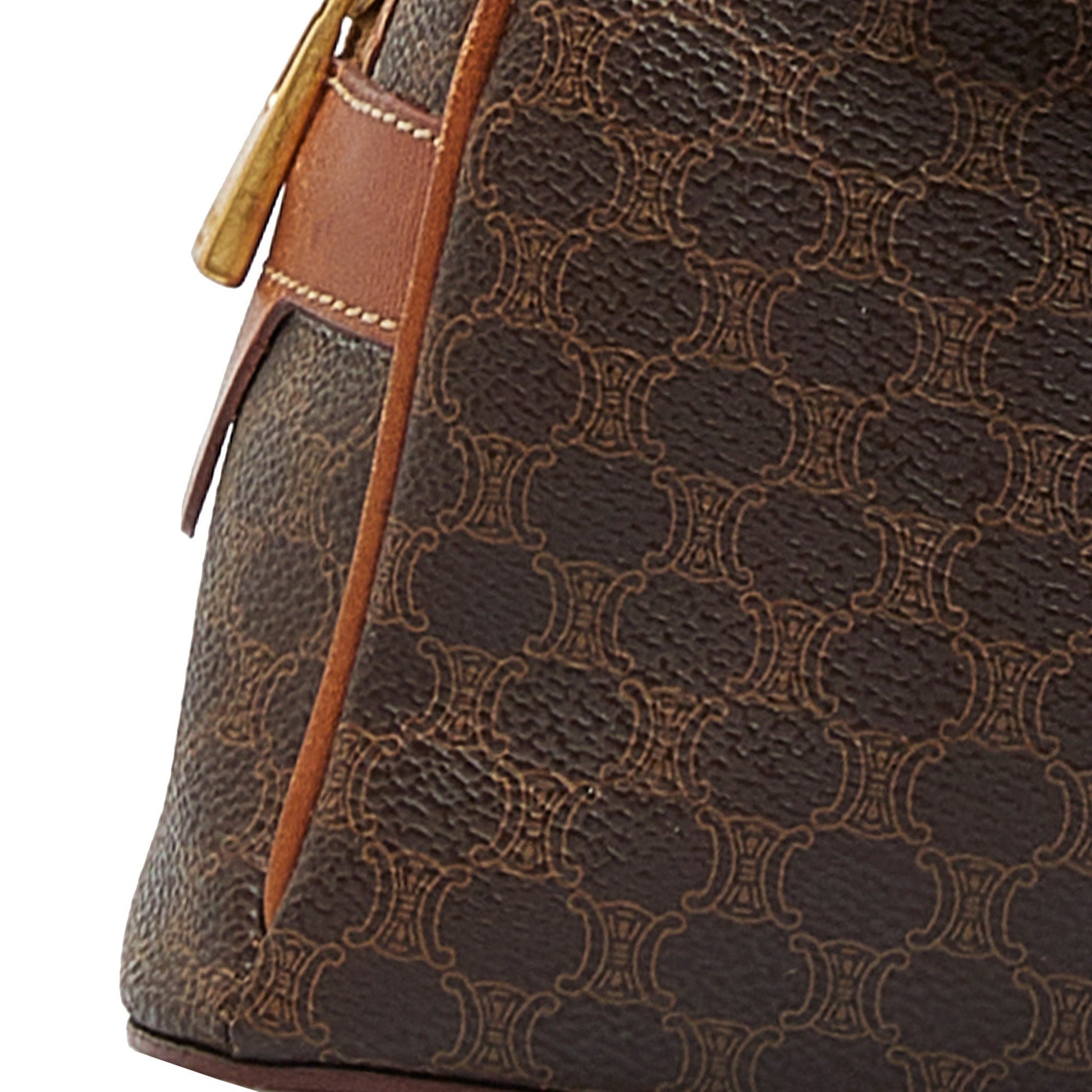 This handbag features a coated canvas body, flat leather handles, a top zip closure, and an interior zip pocket.