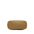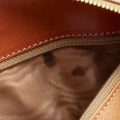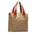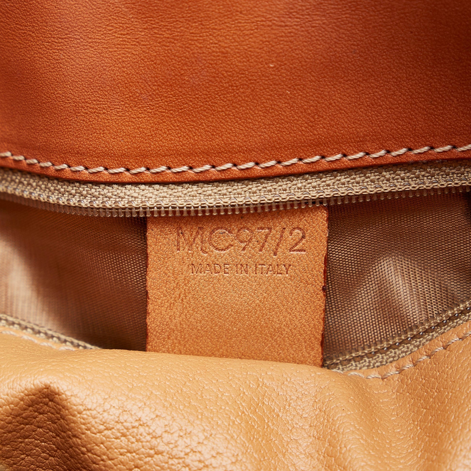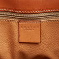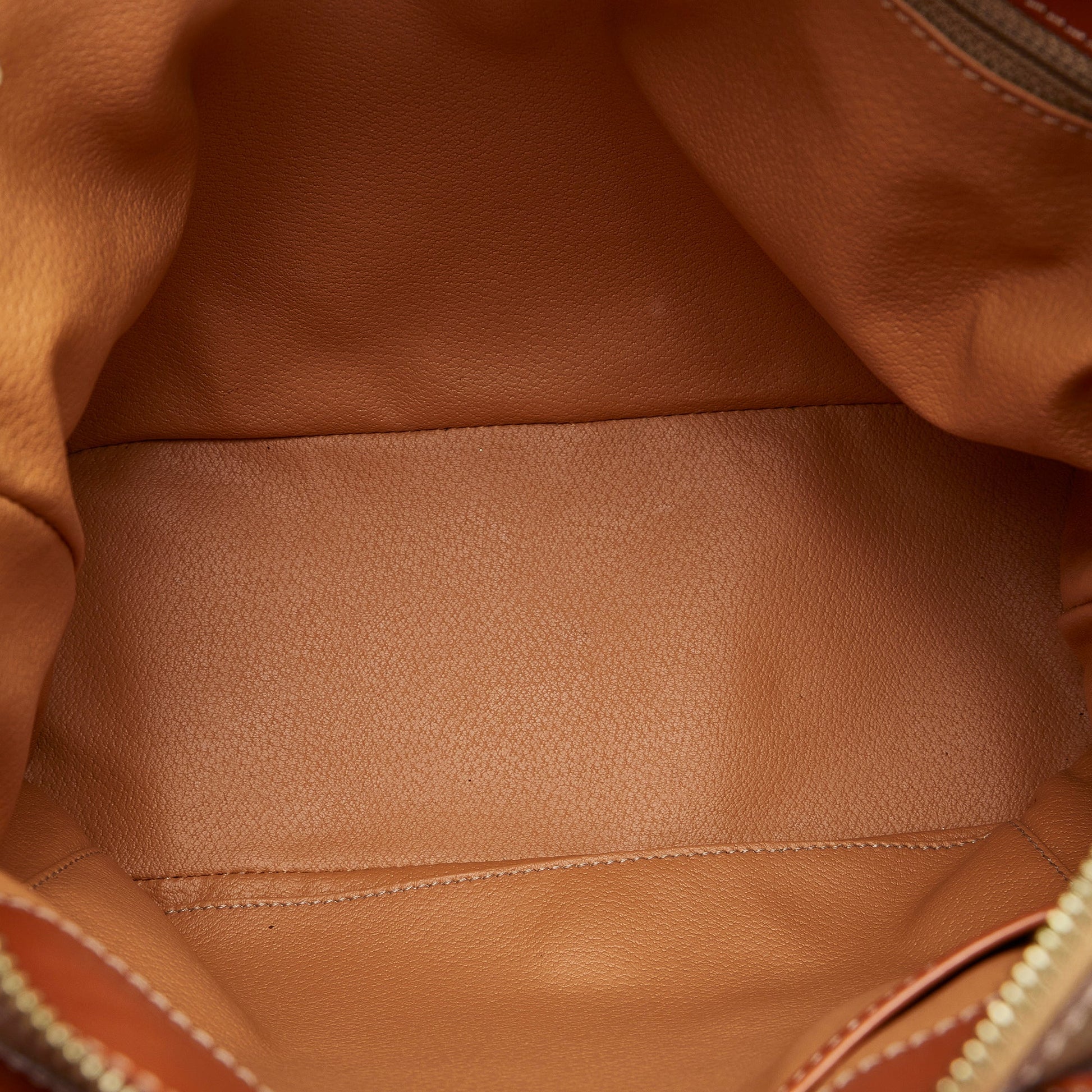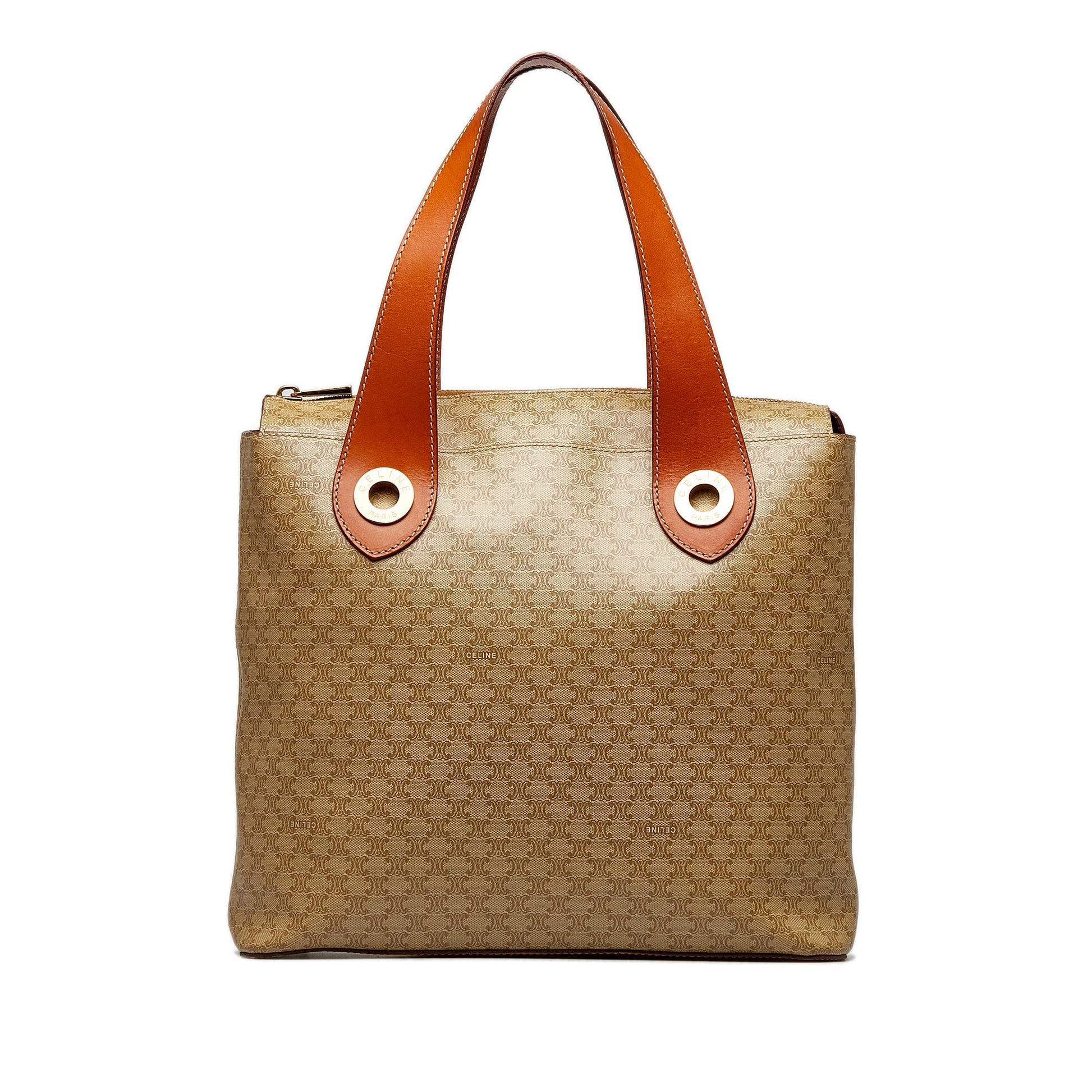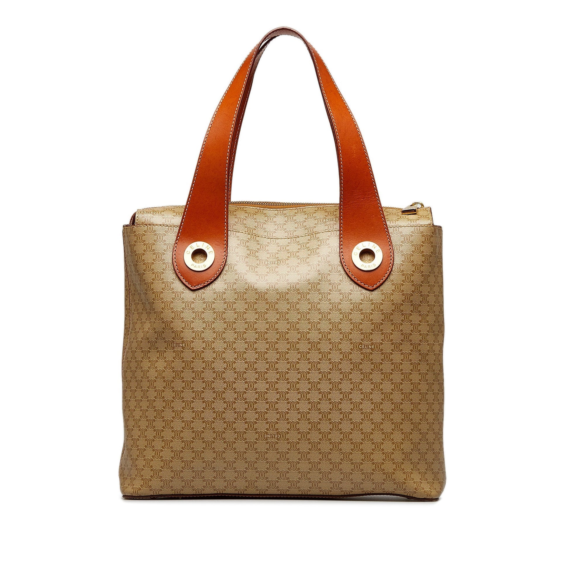 This tote bag features a coated canvas body, flat leather handles, a top zip closure, and an interior zip pocket.