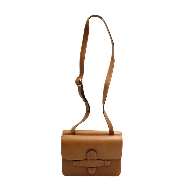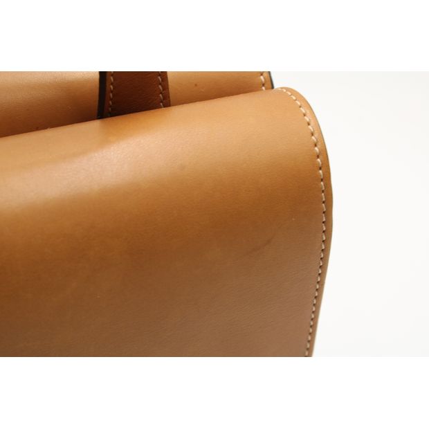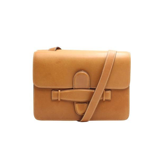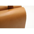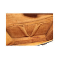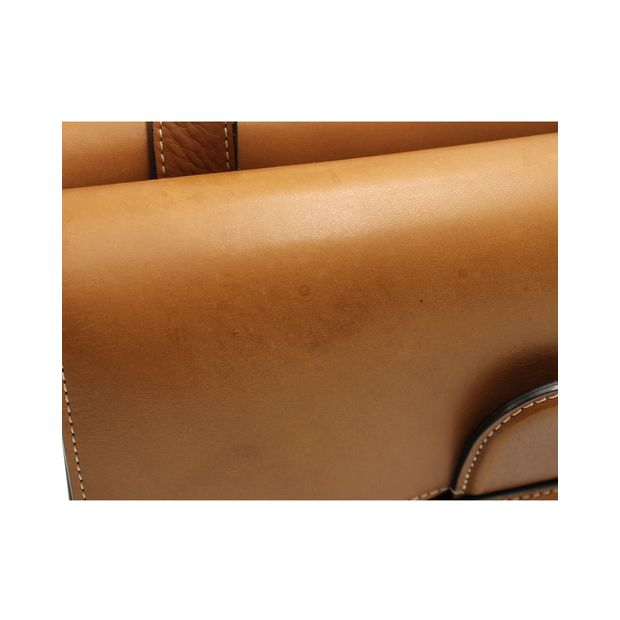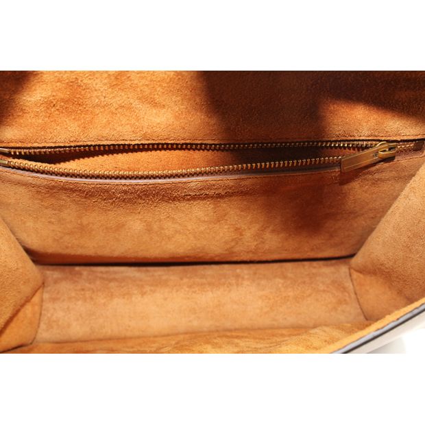 Brown suede interior, patch pockets on one side and a zipper pocket in the other.
