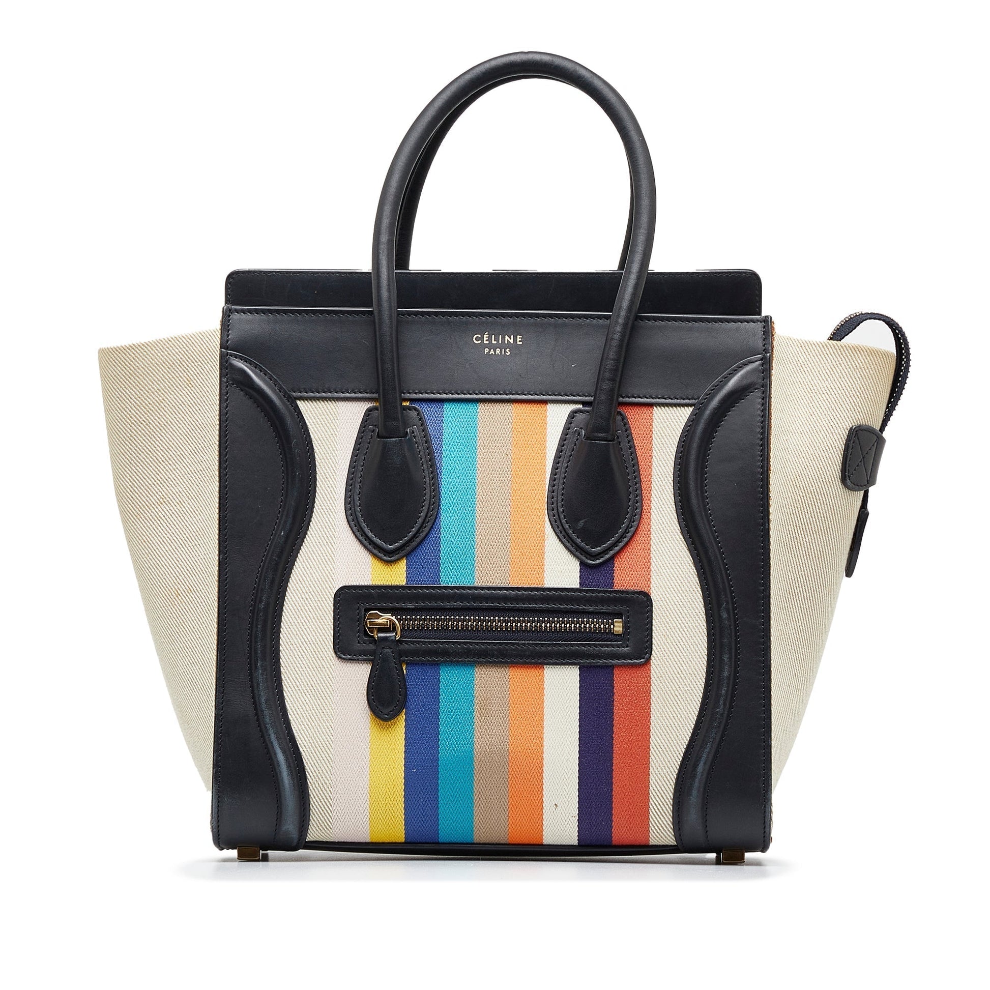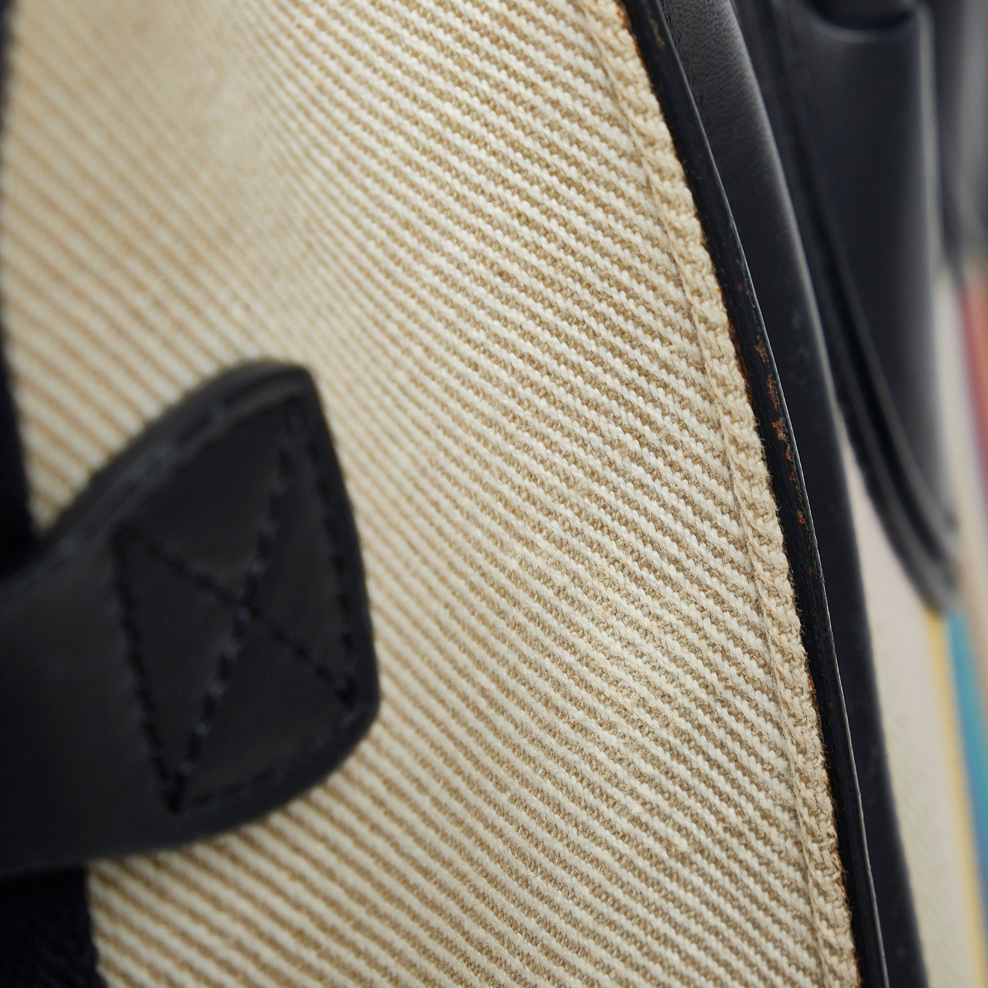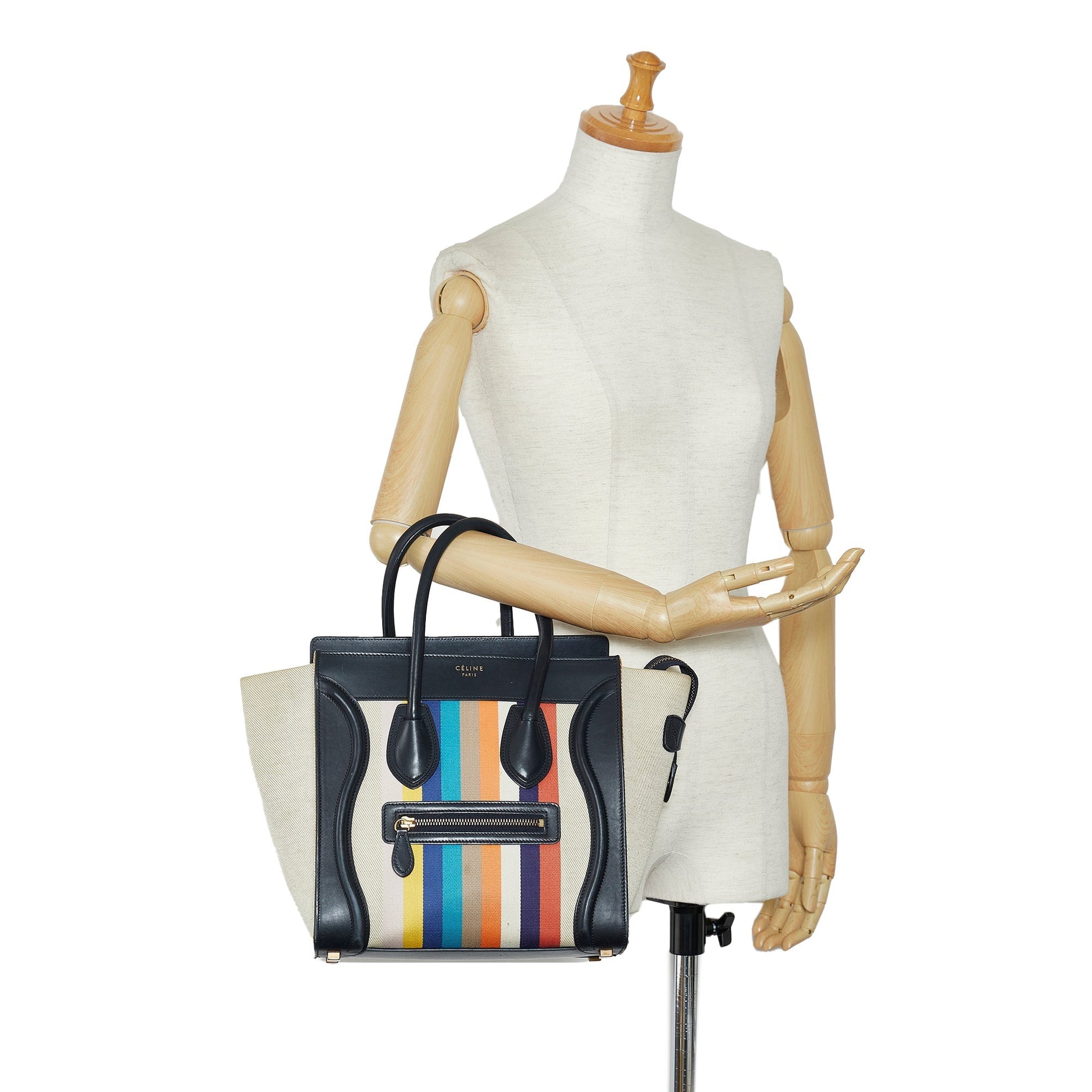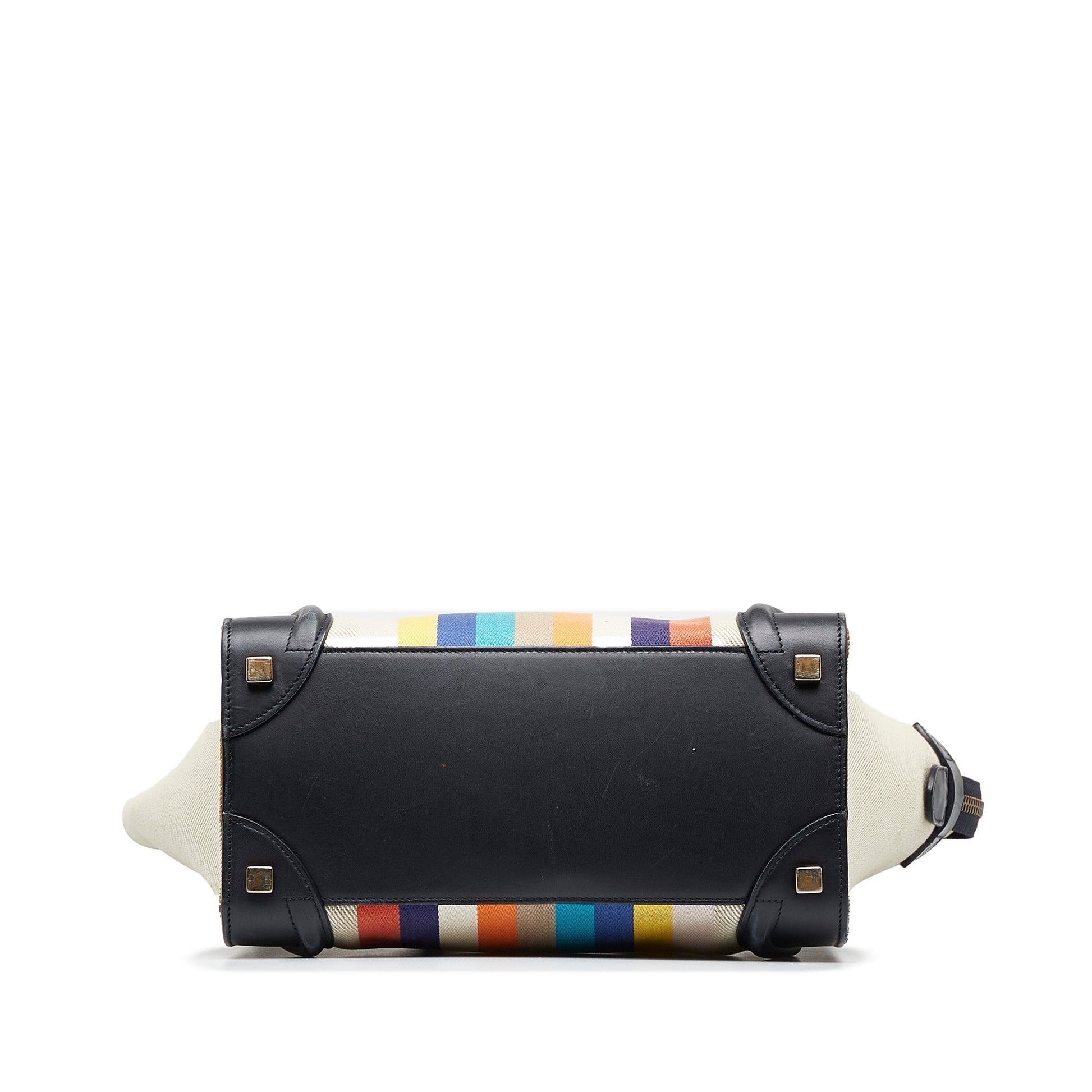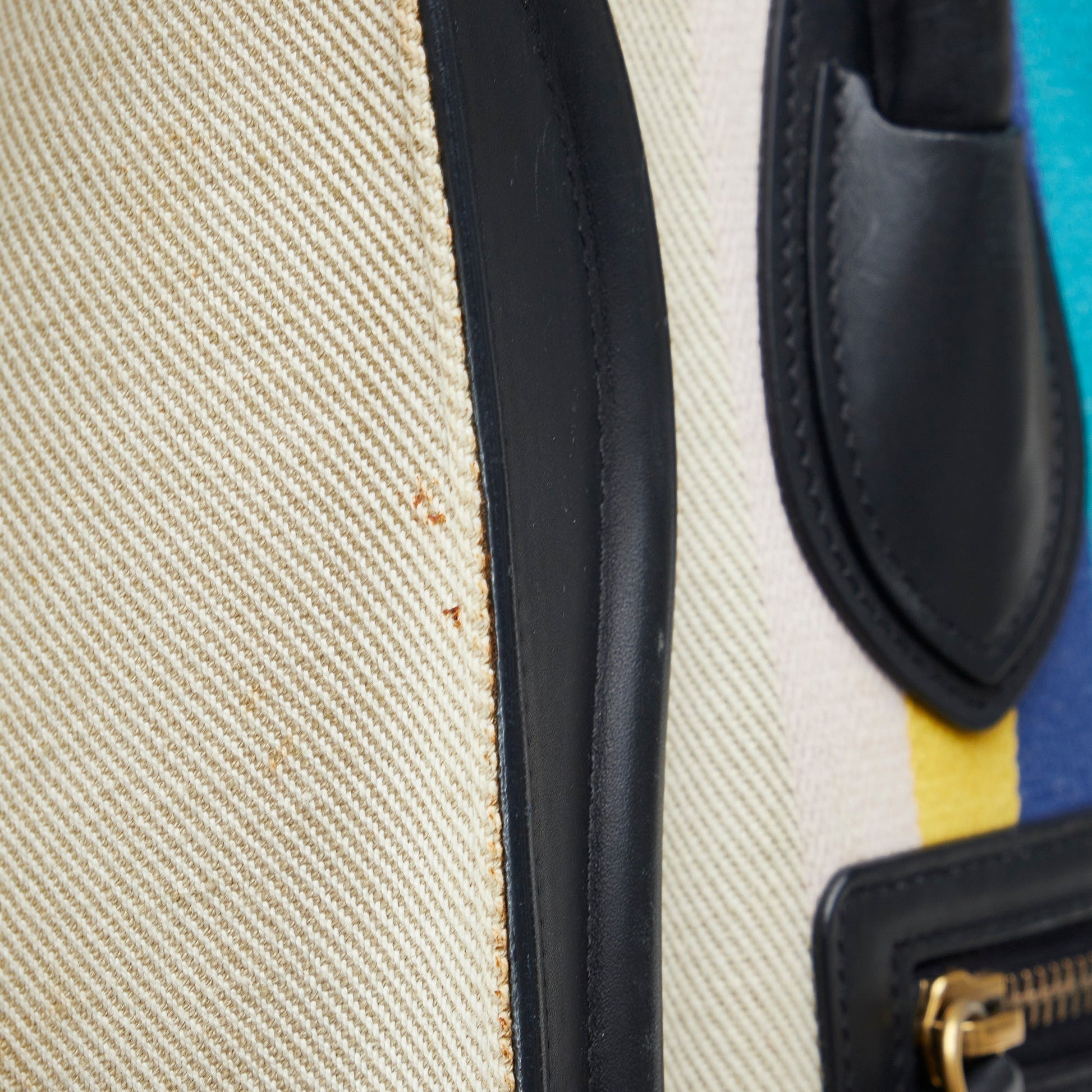 The Micro Luggage Tote handbag features a canvas and leather body, front exterior zip pocket, rolled leather handles, top zip closure, and an interior zip pocket. Comes with dust bag